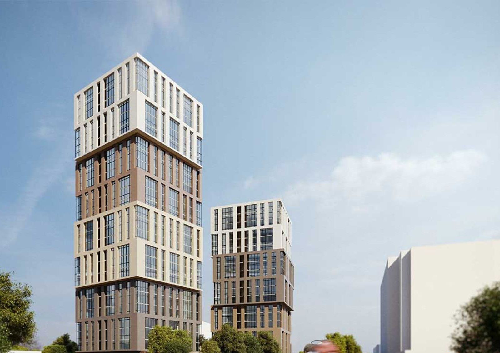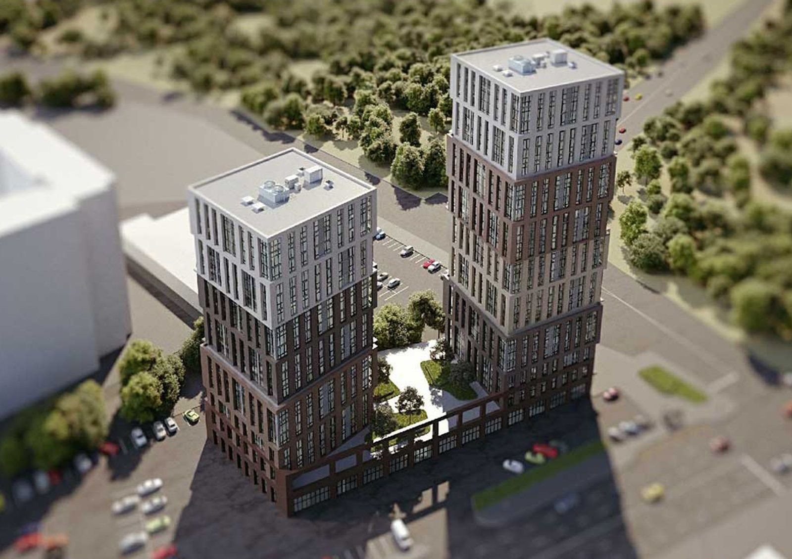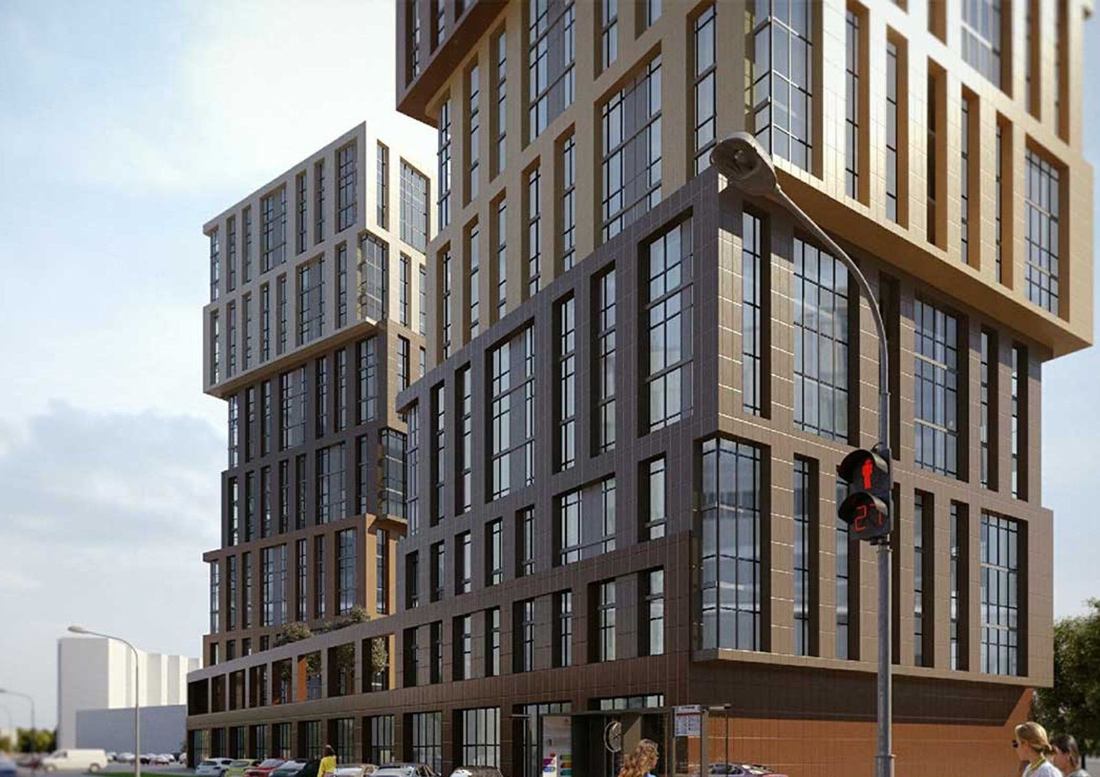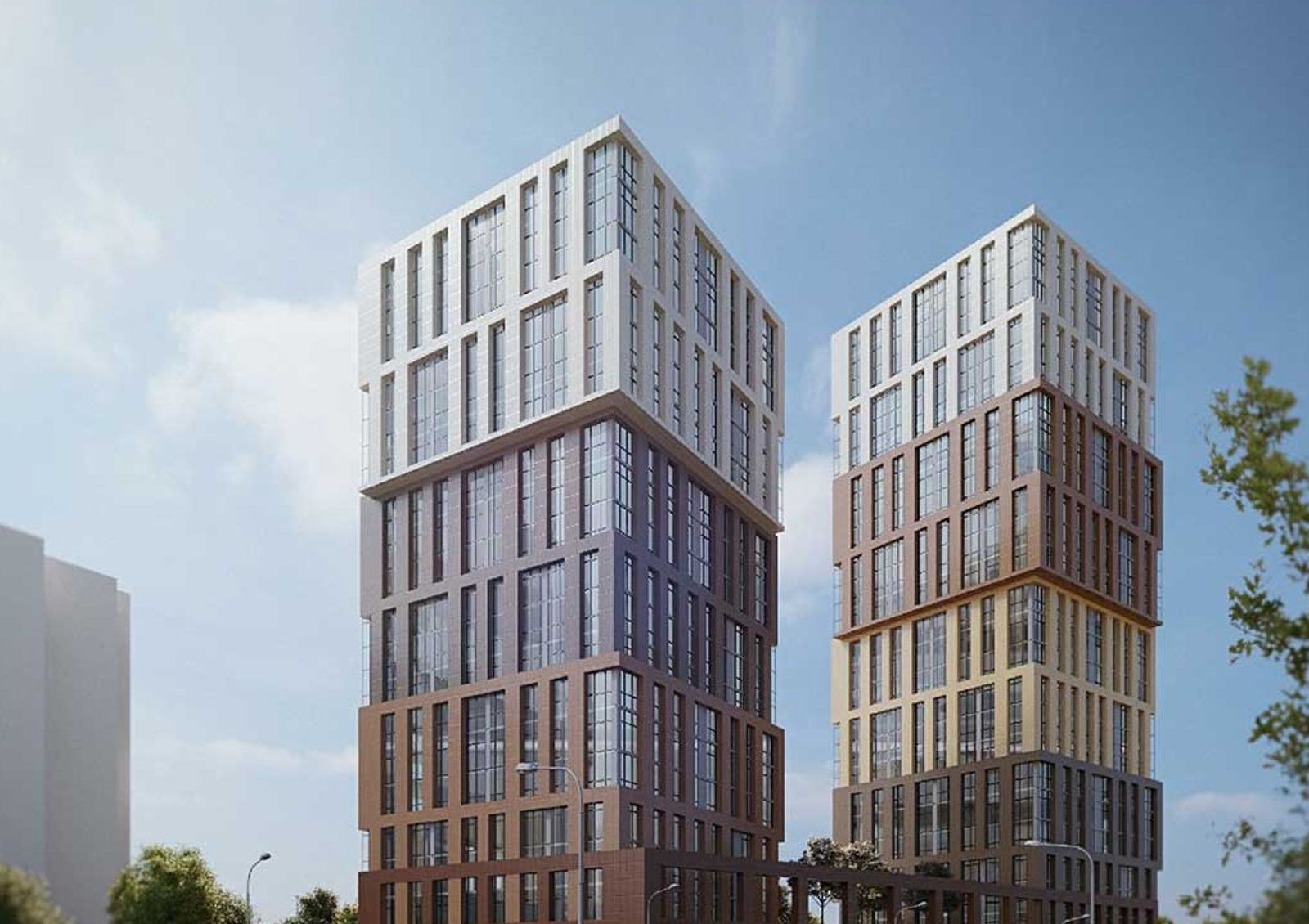 Архитектурной особенностью комплекса станут консольные секции высотой в 6 этажей, смещенные в разные стороны. Смещение подчеркнуто и в оформлении фасадов: градиент меняется от темных оттенков к светлым в зависимости от высоты секции.
