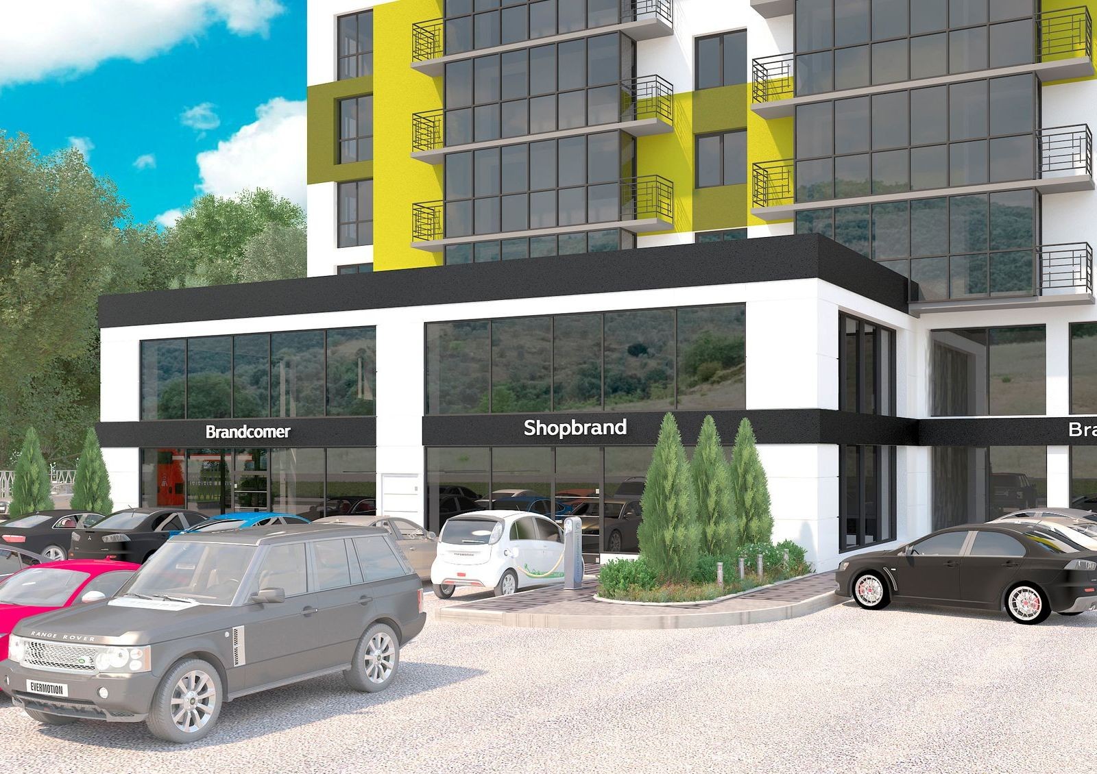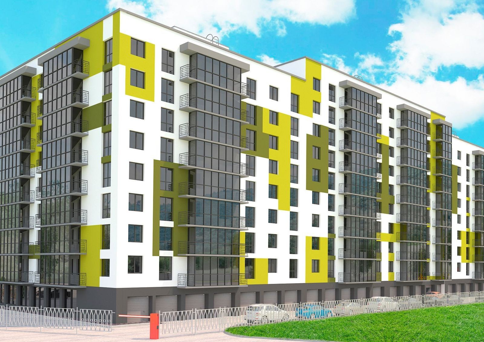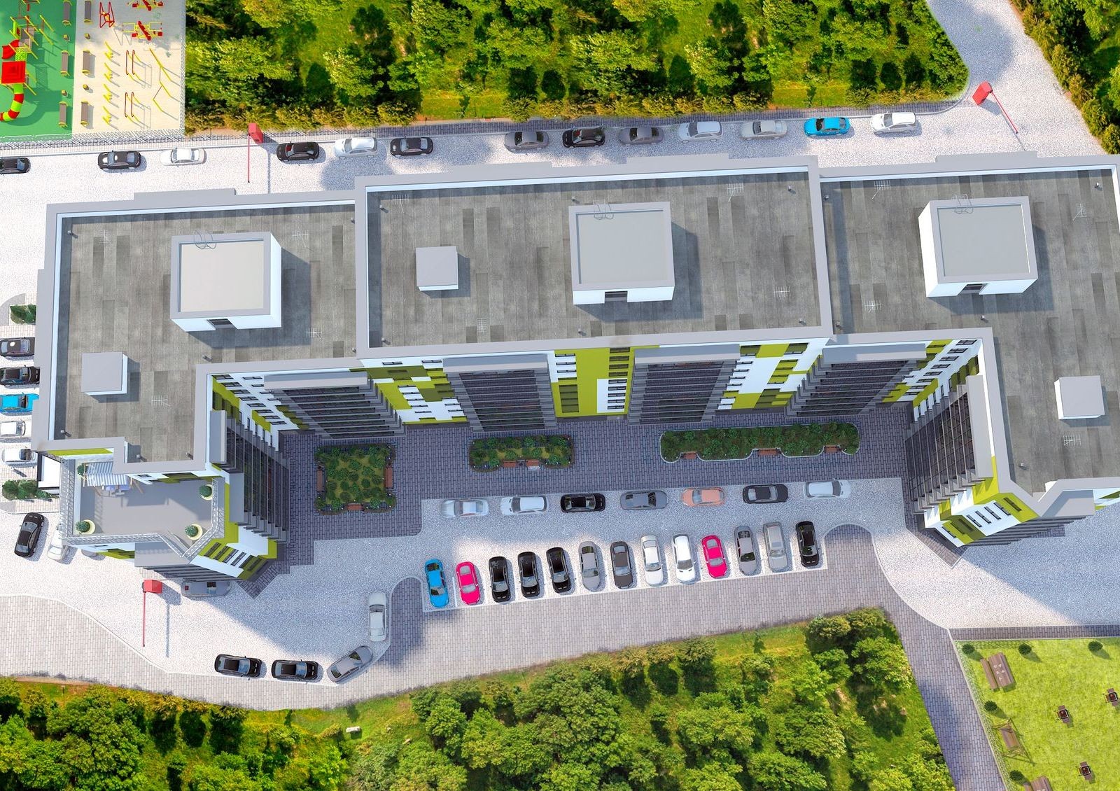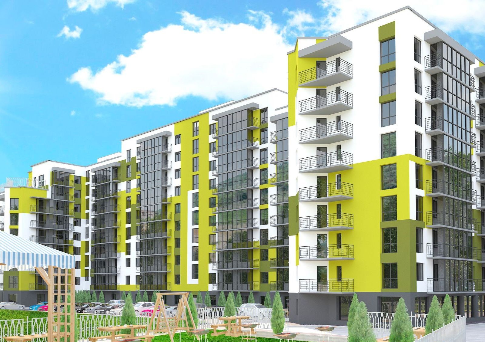Придомовая территория — комфортная зона отдыха с зелеными насаждениями и современной детской площадкой с различными видами активностей. Для жильцов с автомобилями предусмотрены гаражные боксы и открытая парковка с зарядками для электромобилей.