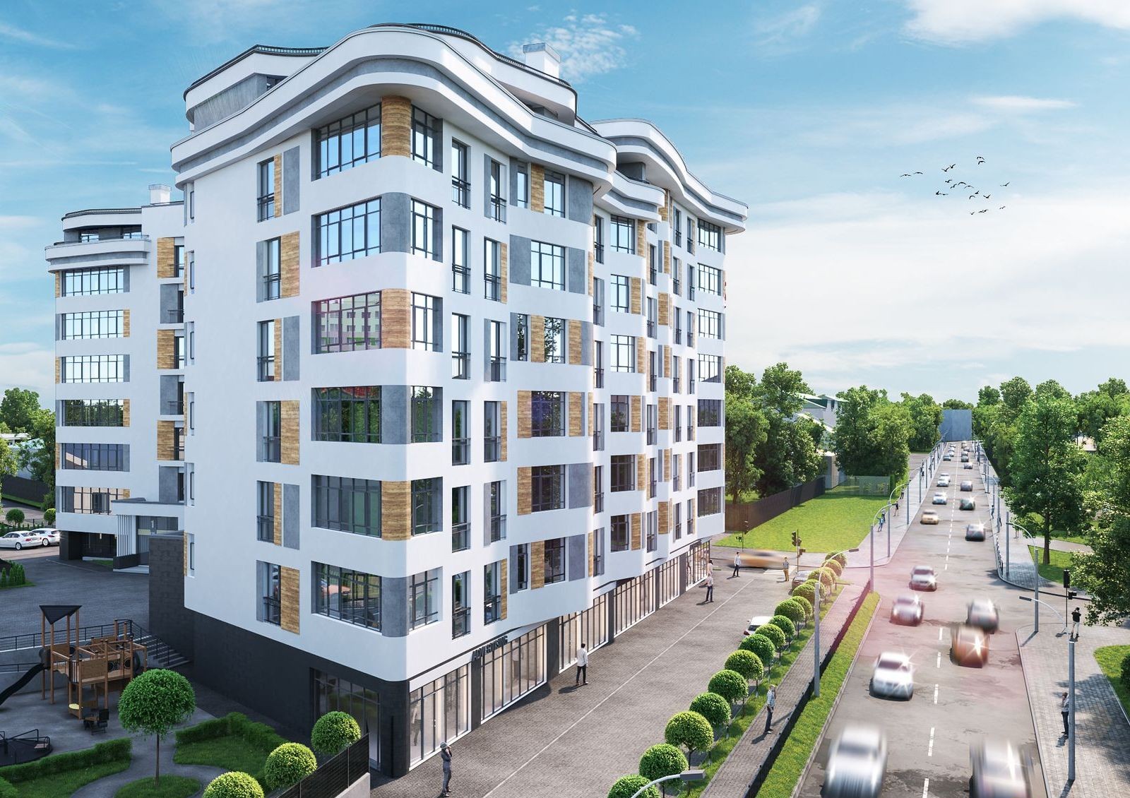 На первых этажах будут расположены коммерческие площади под магазины, салон красоты, аптеку, отделение банка или другой тип сервисных услуг.