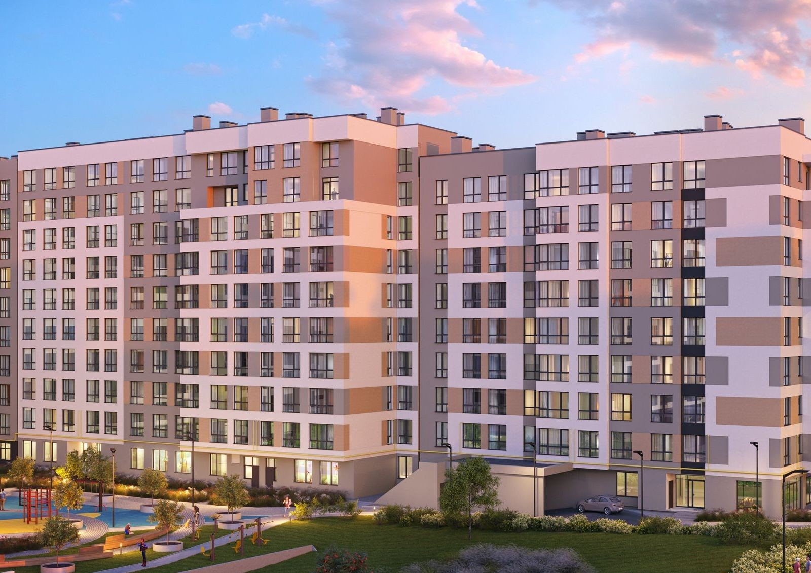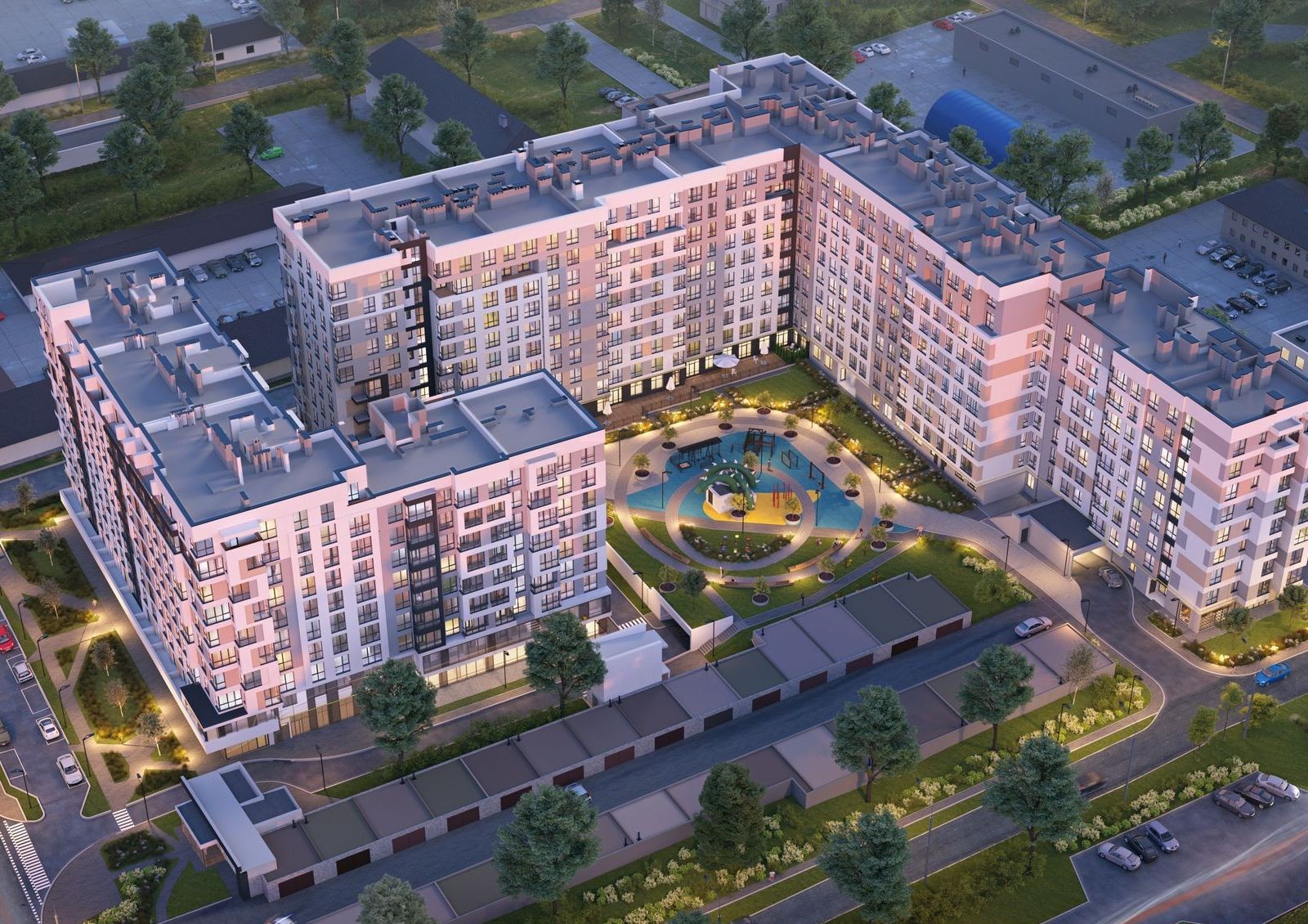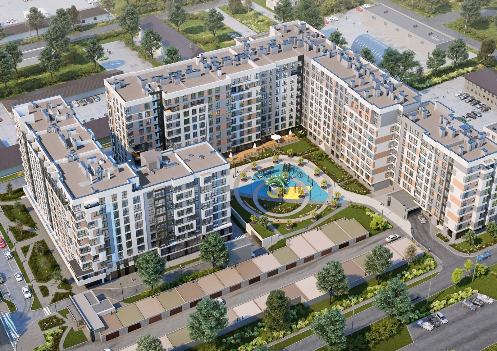 Оборудуется подземная и гостевая парковка. Возле новостройки предусмотрены зоны отдыха, устанавливается наружное освещение. Высаживаются декоративные кустарники и деревья. Прокладываются проезды и тротуары, сооружаются хорошо оснащенные детские игровые площадки.