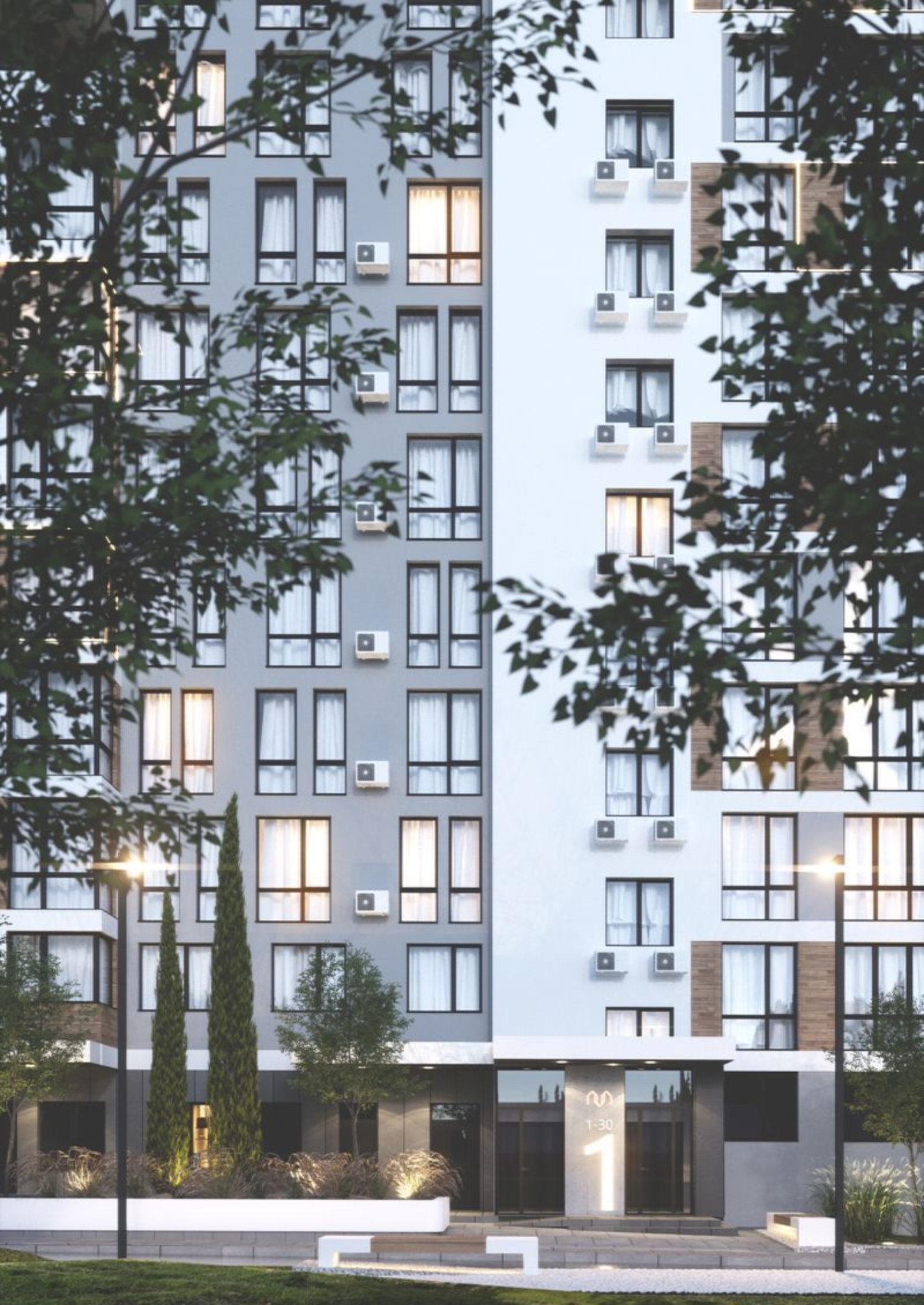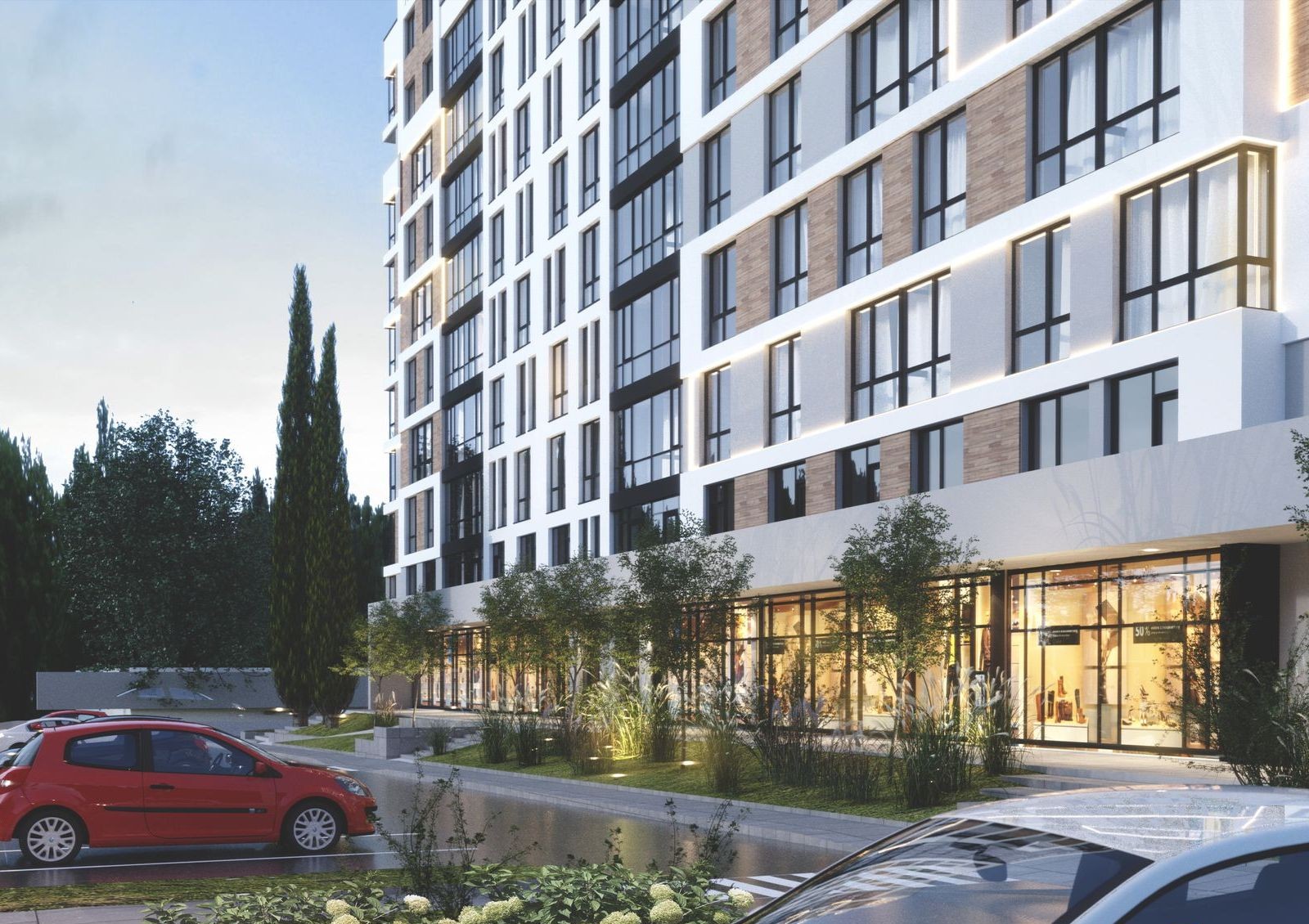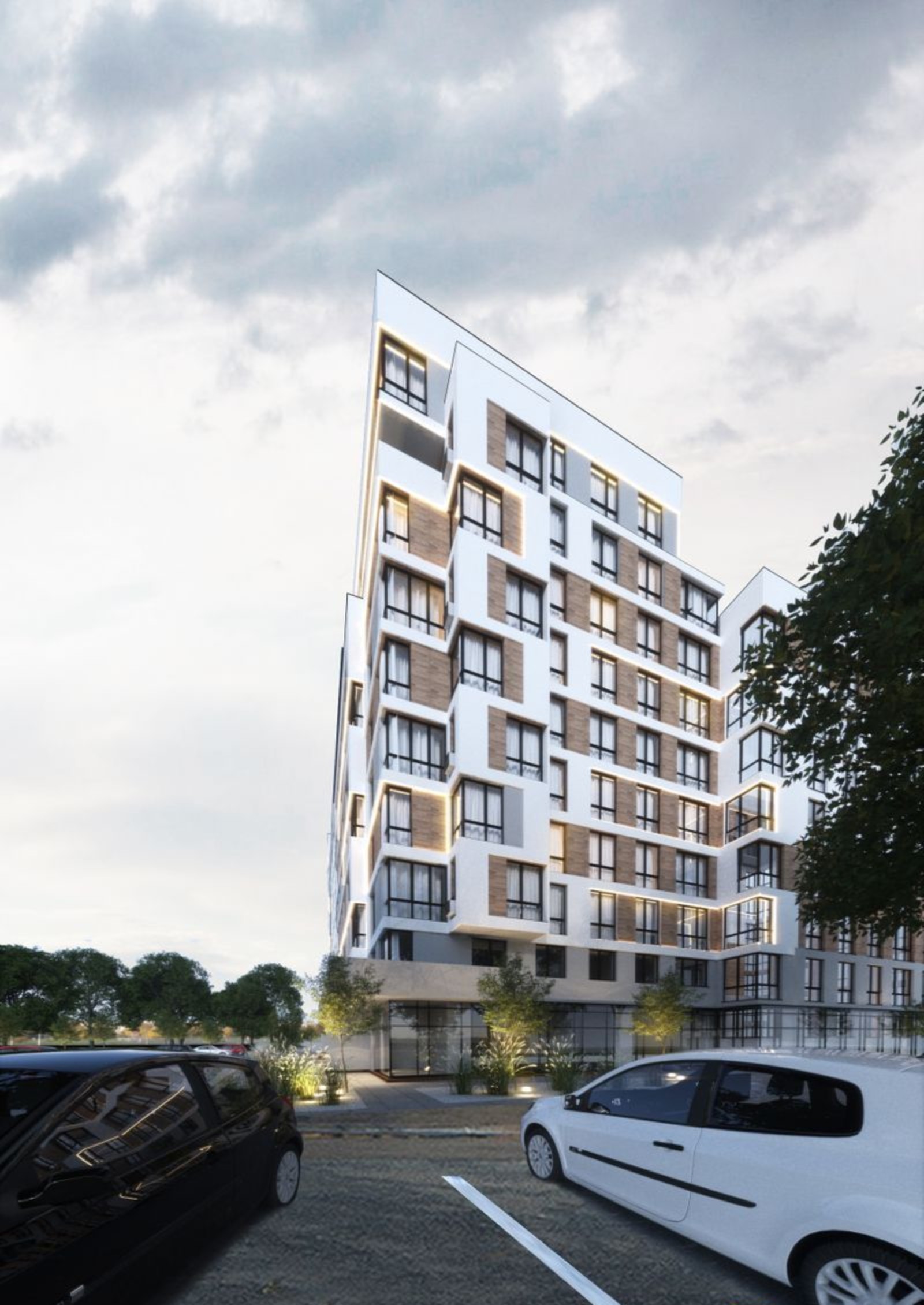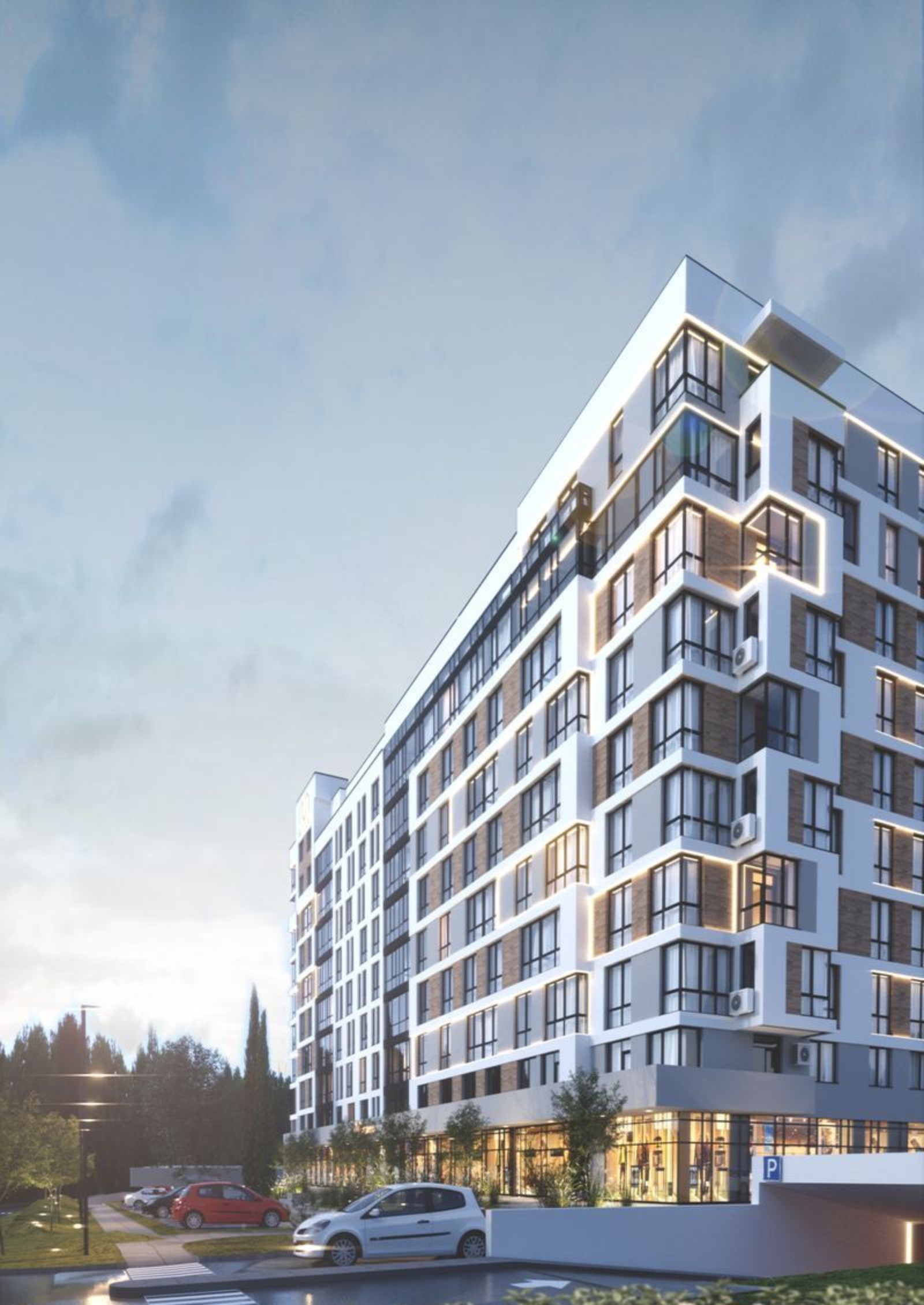 Оборудуется подземная и гостевая парковка. Возле новостройки предусмотрены зоны отдыха, устанавливается наружное освещение. Высаживаются декоративные кустарники и деревья. Прокладываются проезды и тротуары, сооружаются хорошо оснащенные детские игровые площадки.