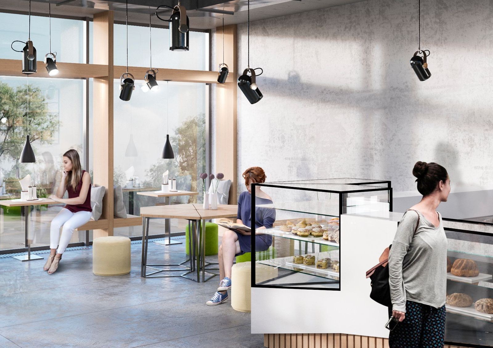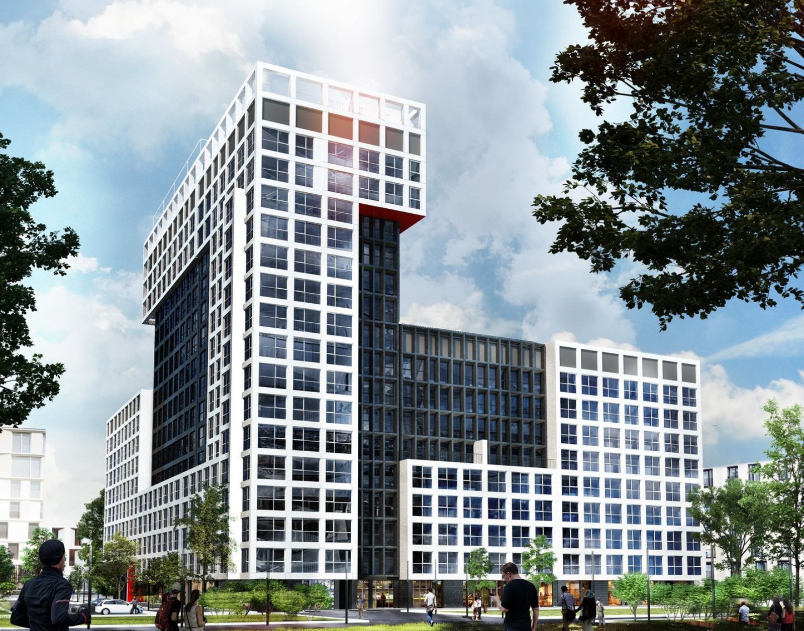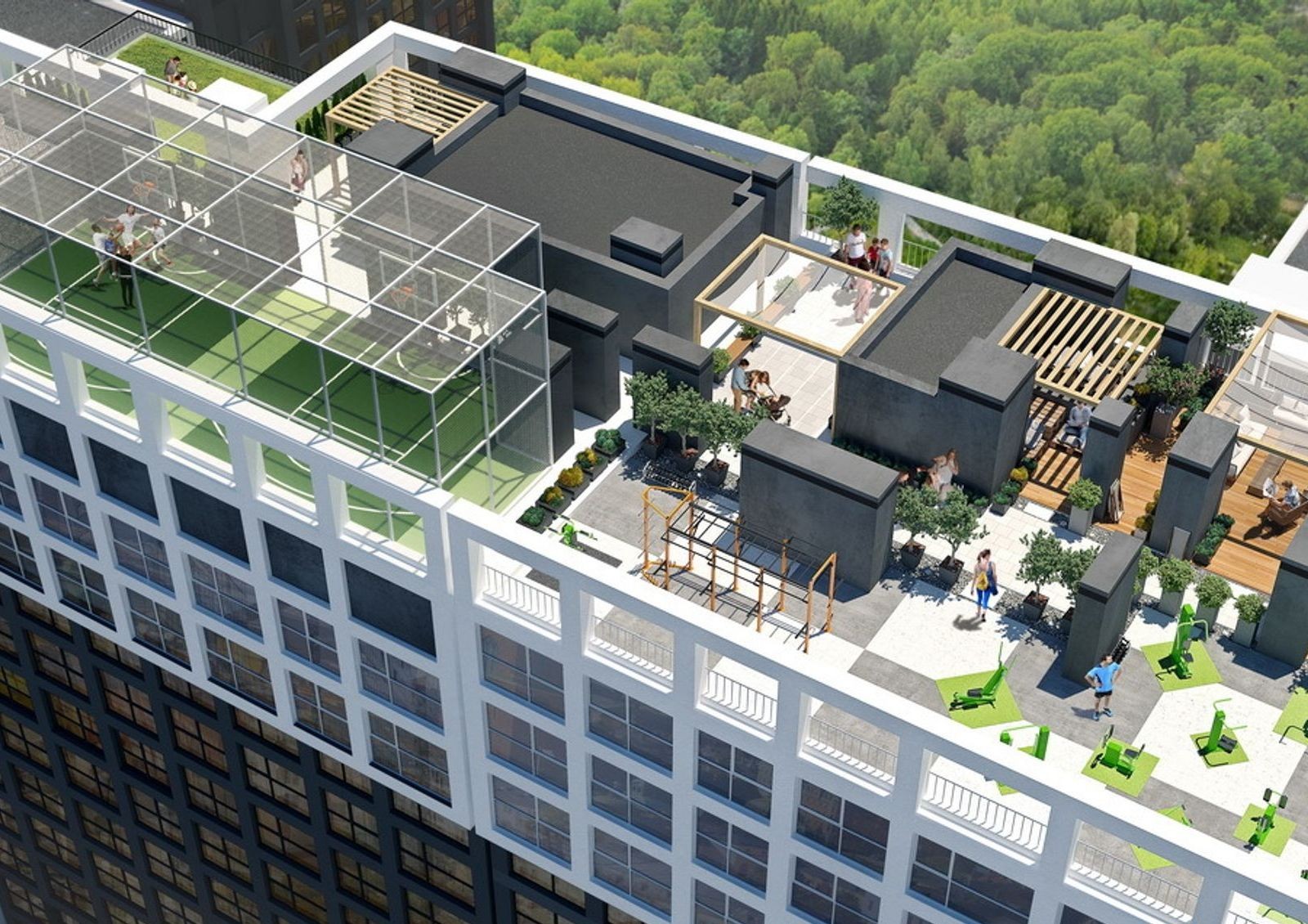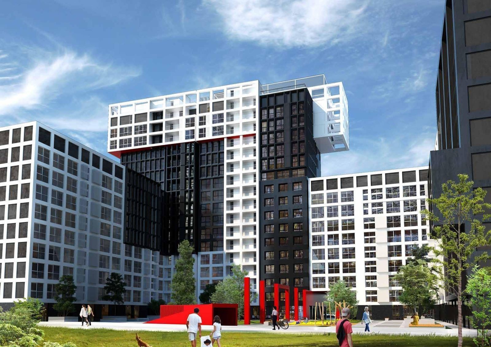 Структура новостройки продумана так, чтобы все необходимые объекты социально-бытовой инфраструктуры находились в самом комплексе. Проектом предусмотрено создание общей зоны, предназначенной для отдыха. На первом этаже размещается собственная пекарня и кофейня, а также рецепция с вспомогательными сервисами: почта, химчистка, банкомат. На эксплуатируемой кровле шестнадцатиэтажек разместится многофункциональная зона для занятия спортом.