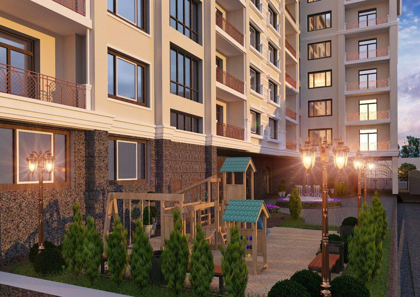 Участок застройки небольшой, но хорошо благоустроенный. Территория закрыта от посторонних и машин, устанавливается система видеонаблюдения, двор освещается фонарями, стилизованными под старину и, по отзывам на форумах, прекрасно вписывающимися в общий архитектурный ансамбль комплекса. Оборудуется детская площадка с расположенной по соседству комфортной зоной отдыха. Подземный паркинг с лифтом оснащается автоматическими воротами.
