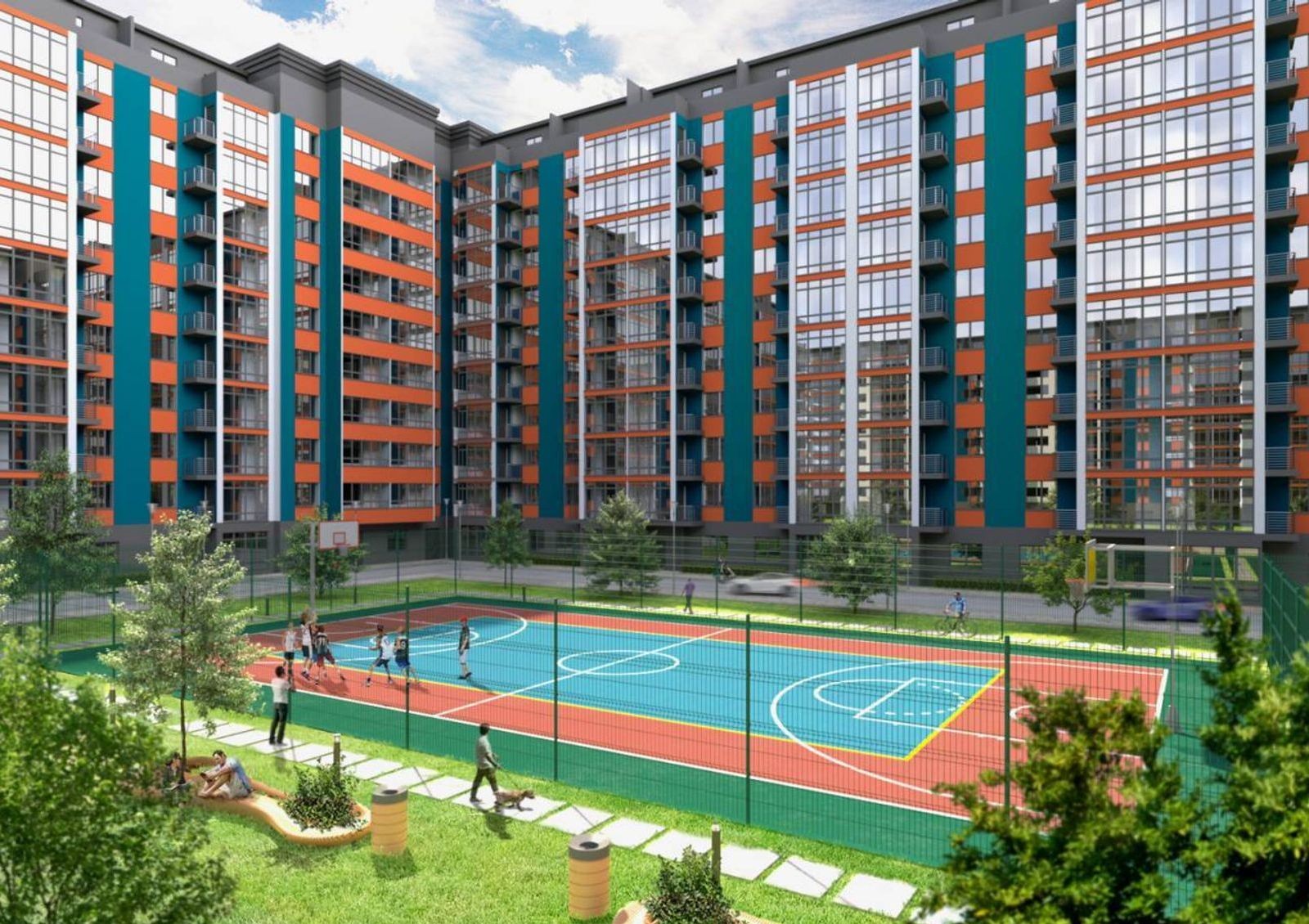 во дворе детские «городки» и спортивные площадки с искусственным покрытием