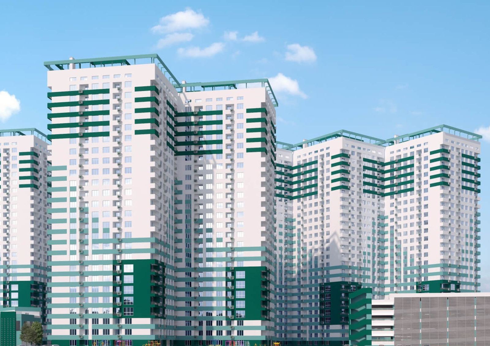 наружные стены выполняются из трехслойных фасадных систем (материал фасада — технологичные стеклофибробетонные панели, заполненные утеплителем), которые обеспечивают высокие показатели гидроизоляции и минимальные теплопотери