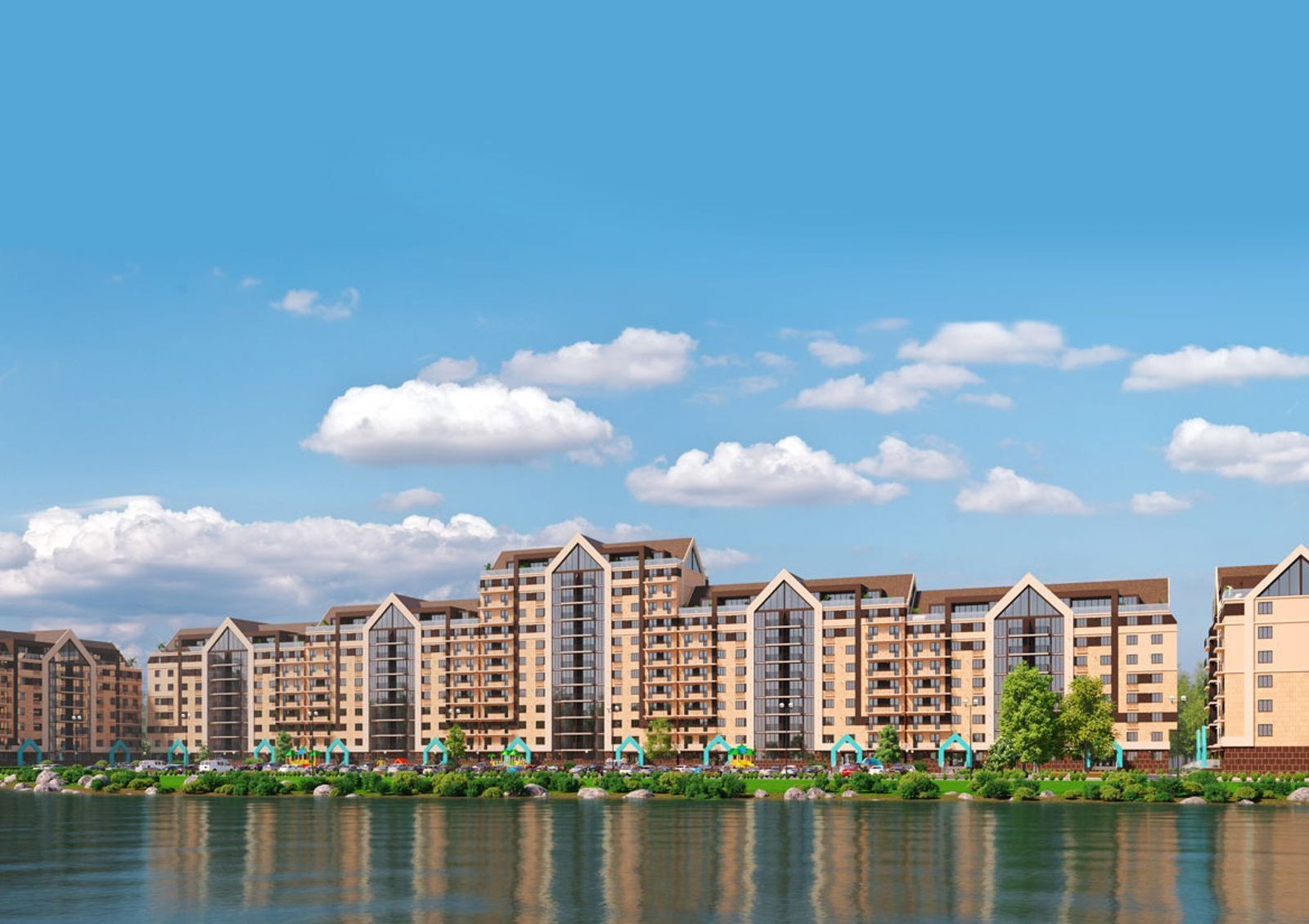 Придомовое пространство зонировано: здесь детские площадки, спортивные зоны, открытые стоянки и заезды в подземный паркинг. Особенность придомовой территории — свой парк с выходом к озеру, прогулочными аллеями, зелеными лужайками и барбекю зонами.