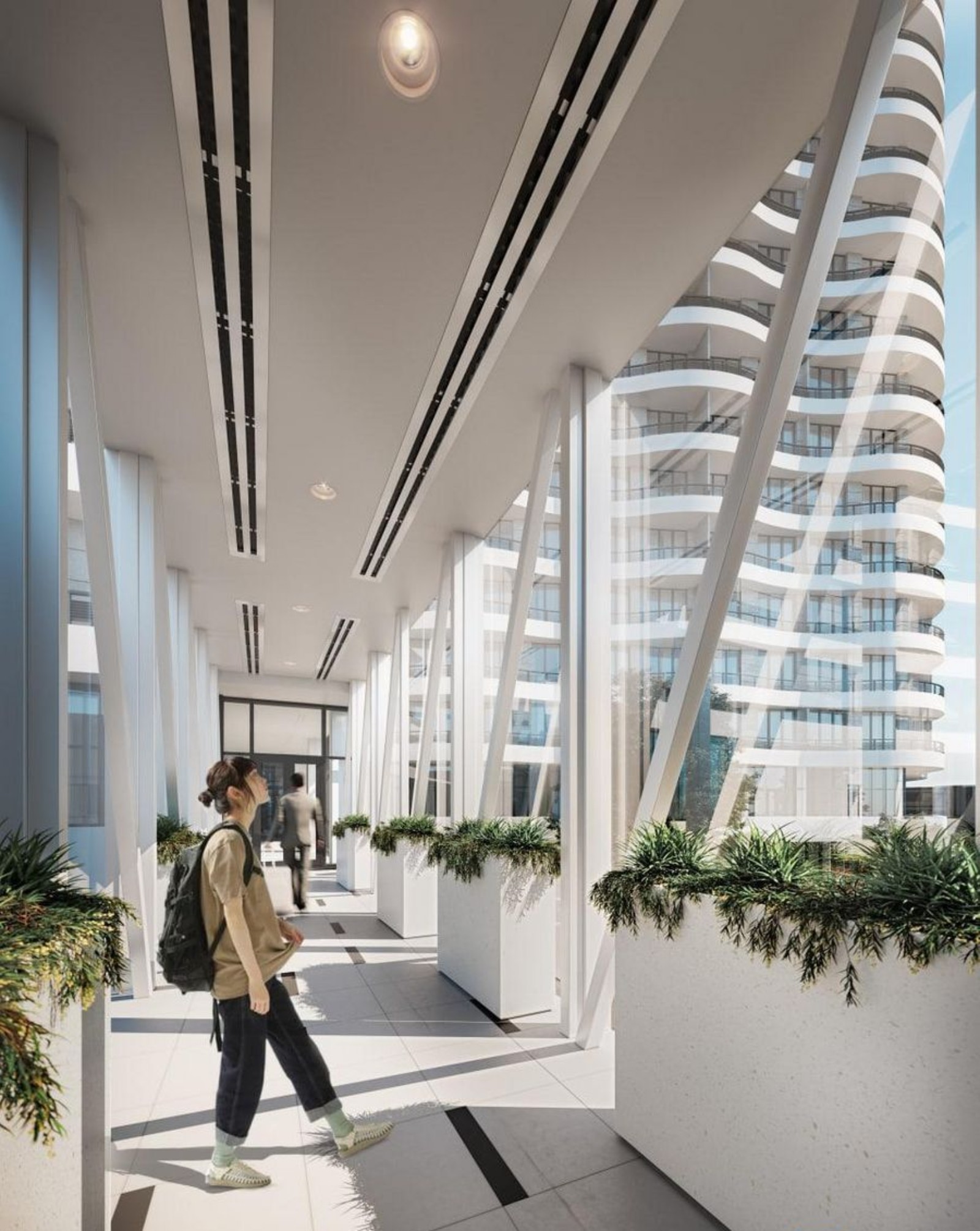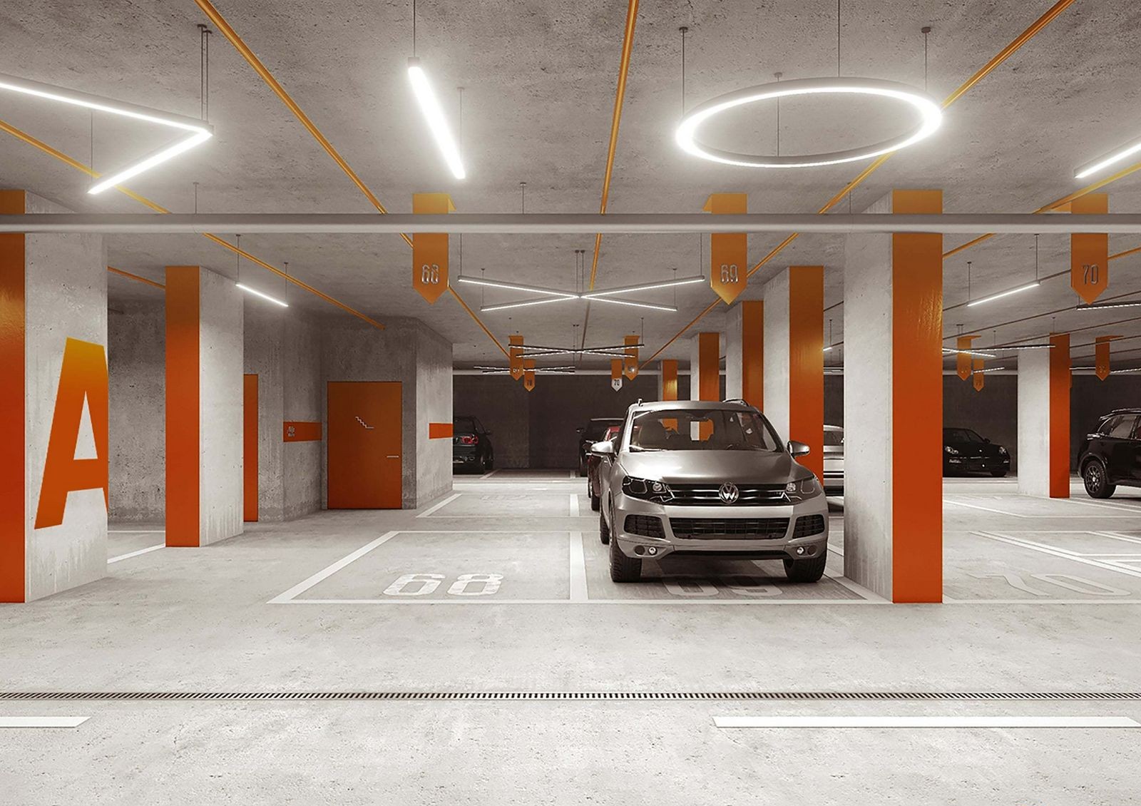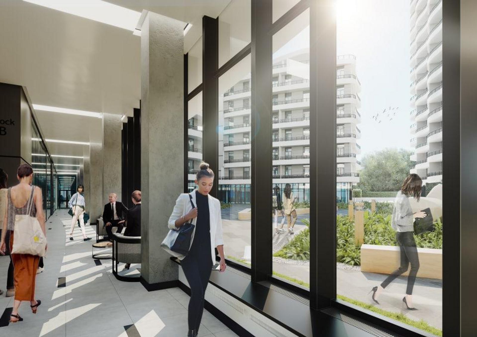 На территории двора отсутствуют автомобили, в стилобате предусмотрен просторный паркинг, на который может заехать специальная техника. Первые этажи предназначаются для размещения офисных помещений, коворкинга и конференц-залов.