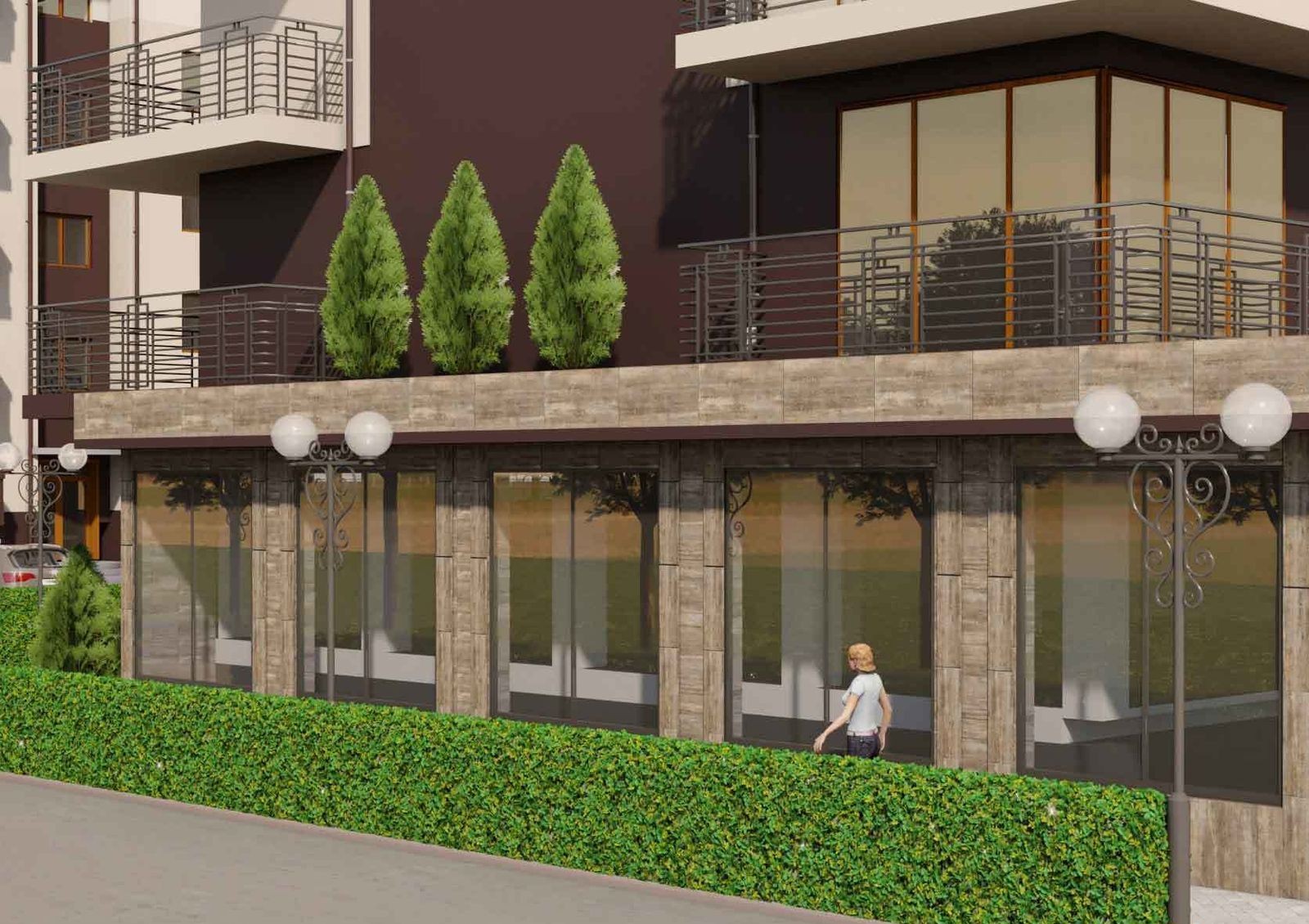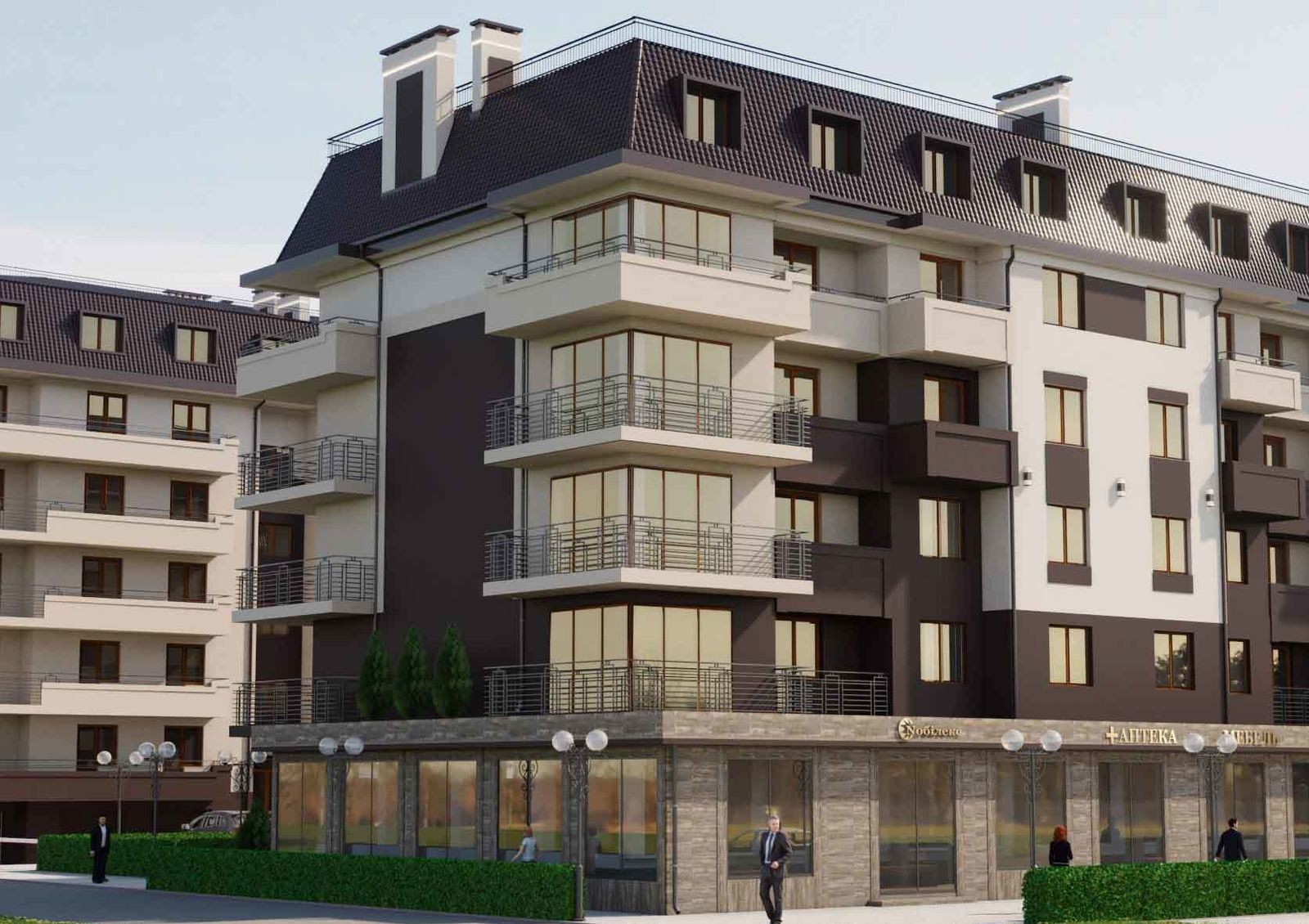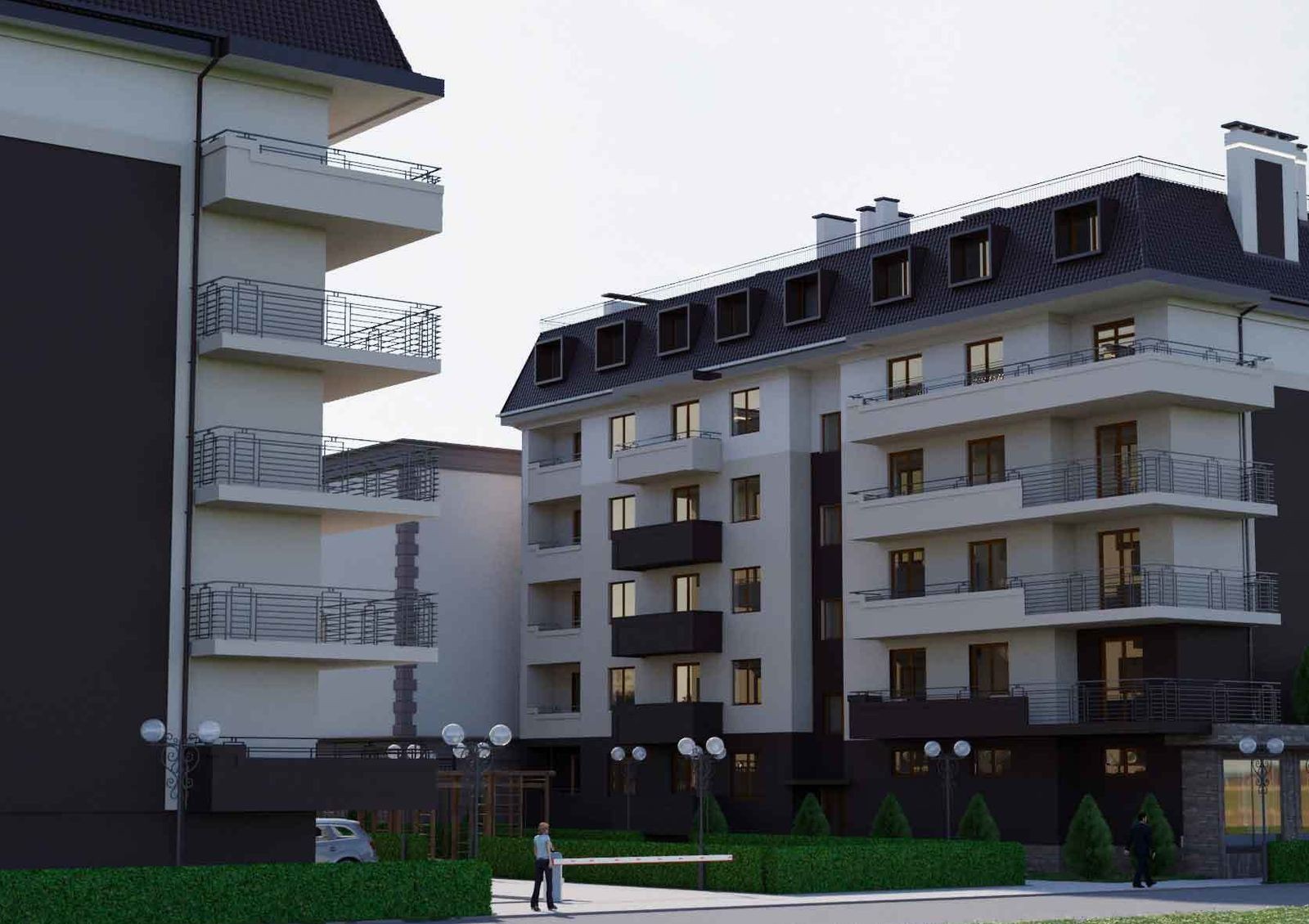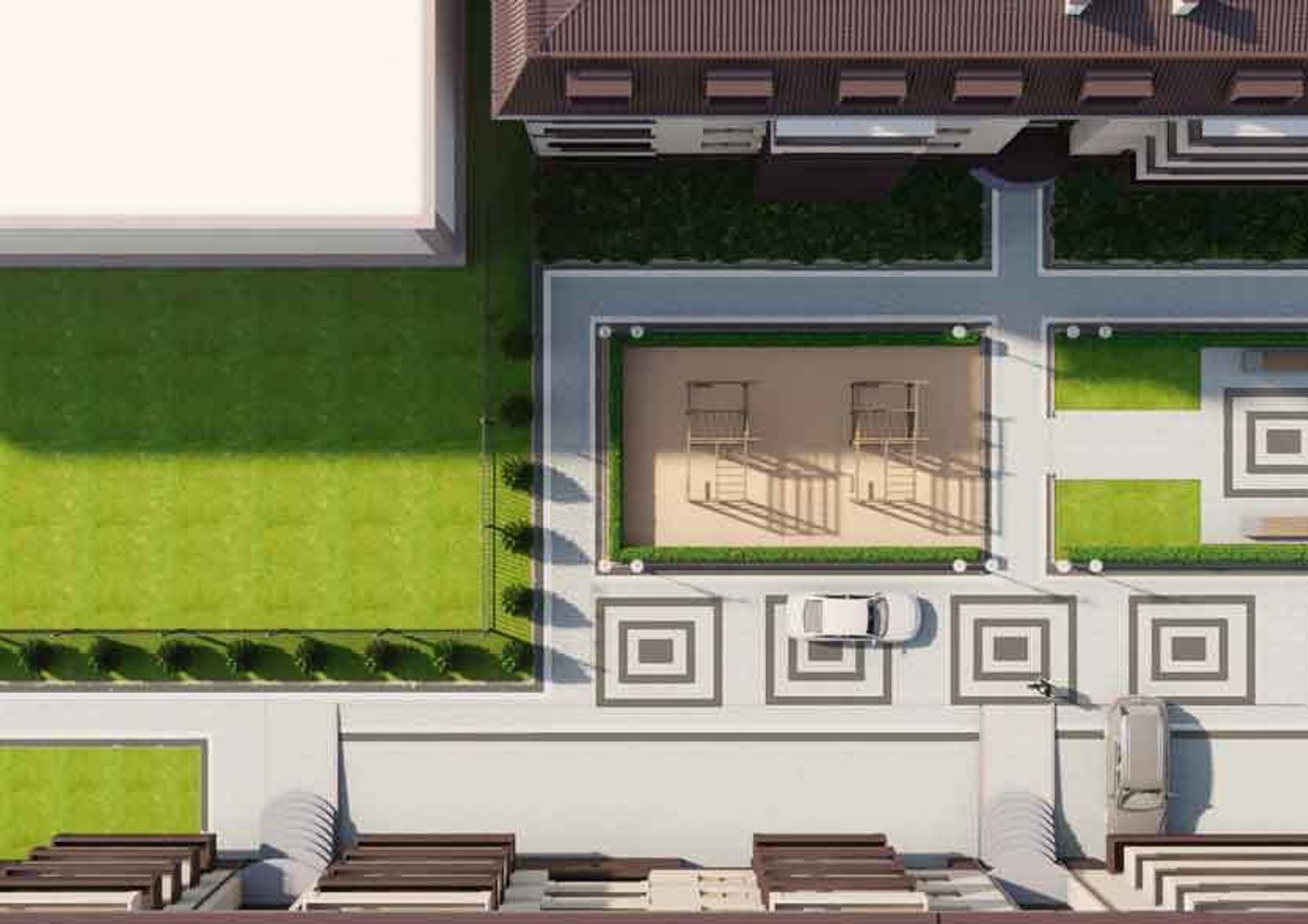 закрытая территория с концепцией «без авто и посторонних», для автомобилей гостей комплекса предусмотрена открытая наземная стоянка