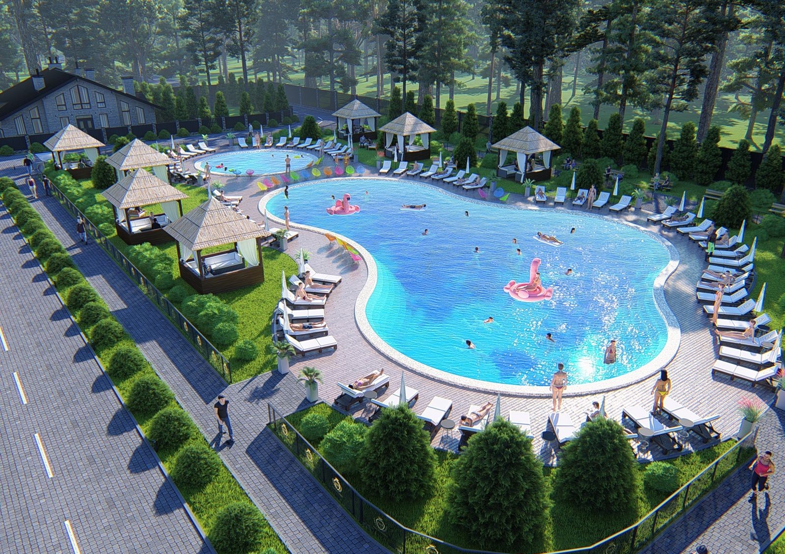 загородным комплексом с теннисными кортами;