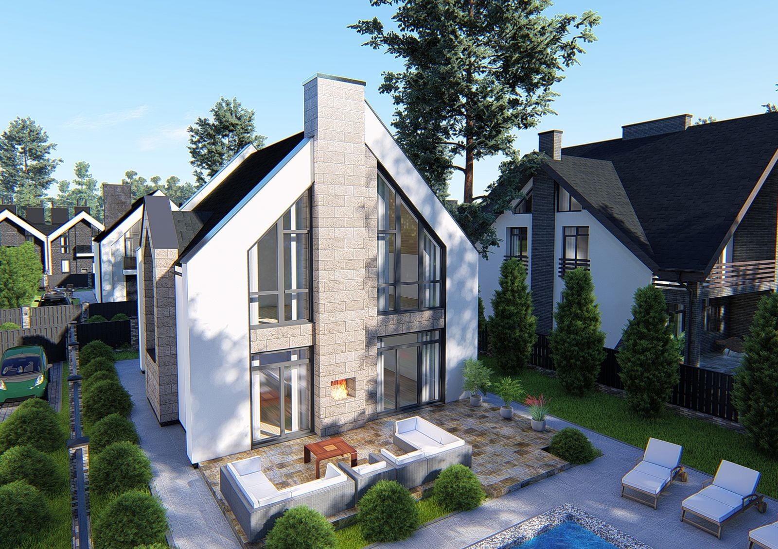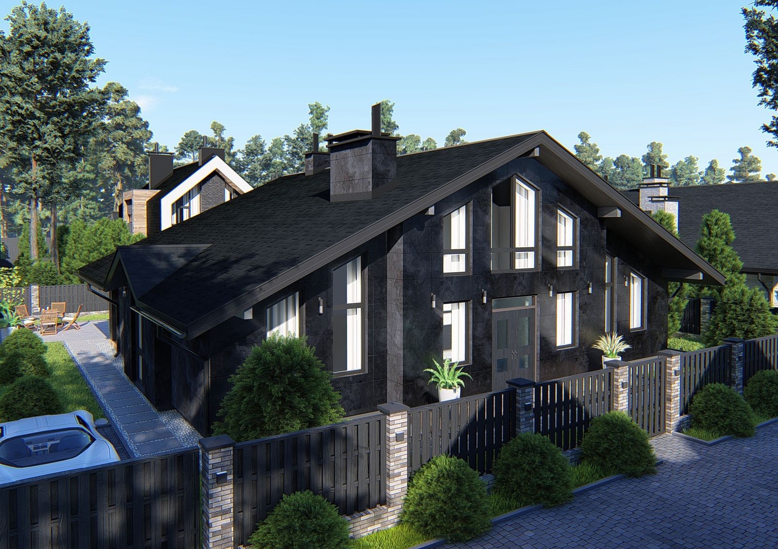 Землю возле дома можно использовать под бассейн, беседку или зону барбекю, для парковки машины отведен отдельный участок.