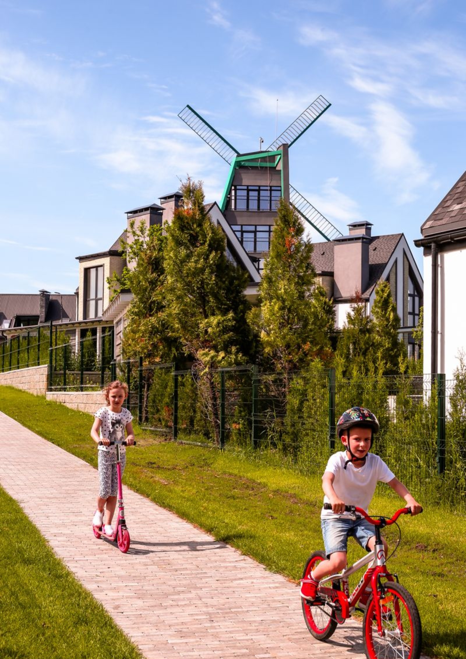 При выполнении работ по благоустройству территории городка предусмотрено создание собственной инфраструктуры. Здесь есть множество зон для прогулок и активного отдыха. В одной из них установлен фонтан, где часто собираются жители с детьми, проводятся различные развлекательные мероприятия. «Изюминкой» является коммерческое помещение стилизованное под мельницу, по мере строительства и заселения планируется открытие ряда коммерческих помещений. Сооружается современный детский сад европейского типа, спортивные площадки для взрослых и игровые площадки для малышей, а также канатный парк. В теплое время года можно купаться в бассейне и загорать на лежаках в лаунж-зоне.