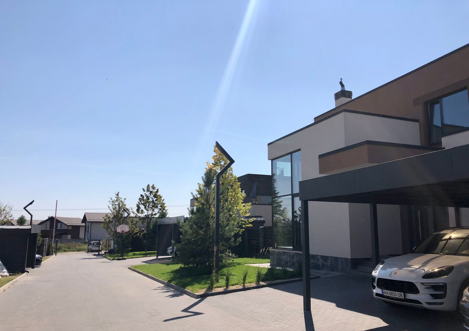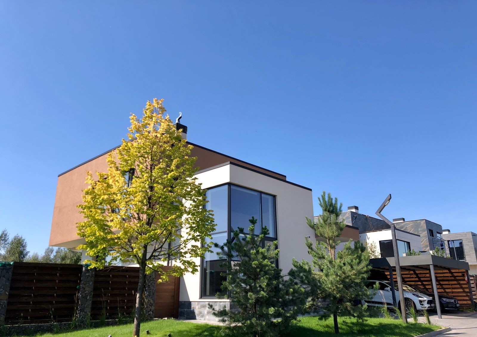 по два паркоместа рядом с каждым коттеджем и девять мест на территории городка для автомобилей гостей