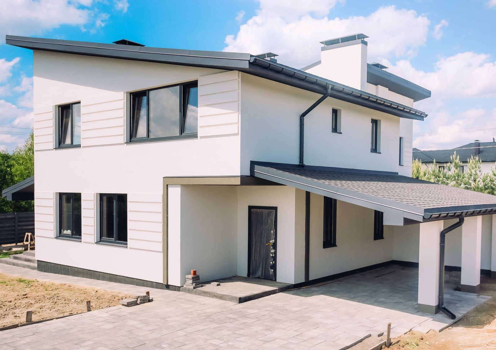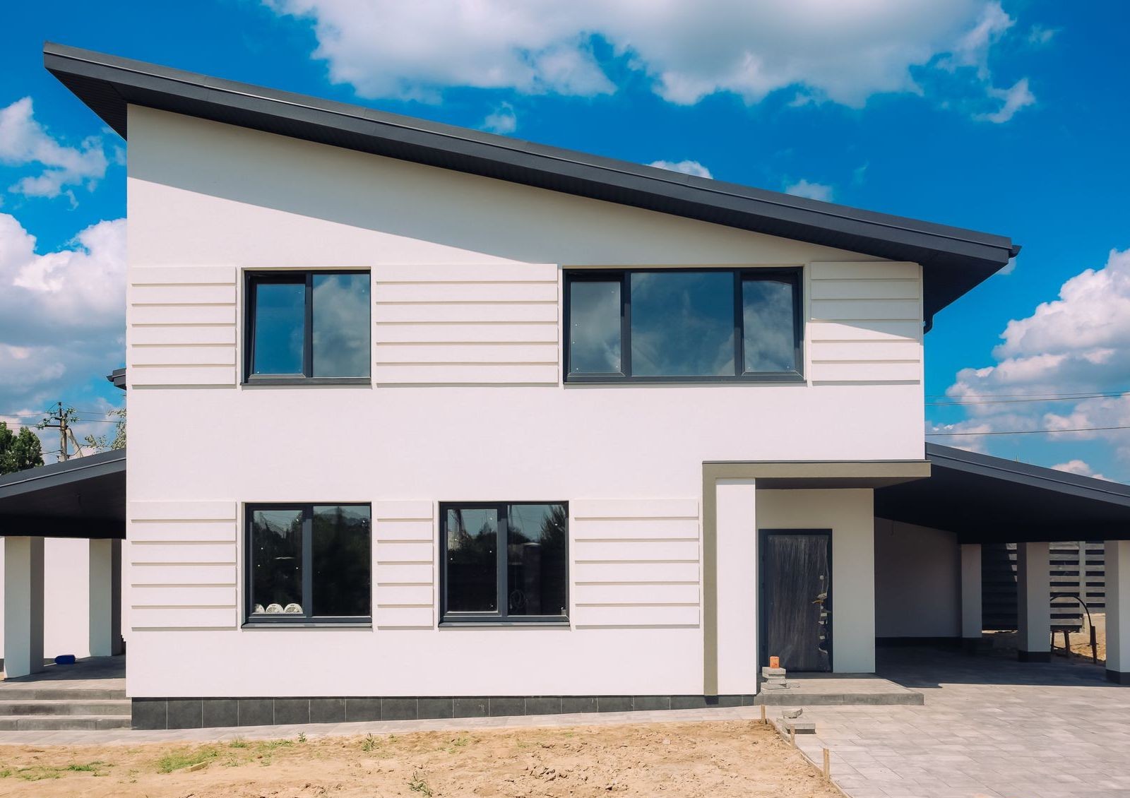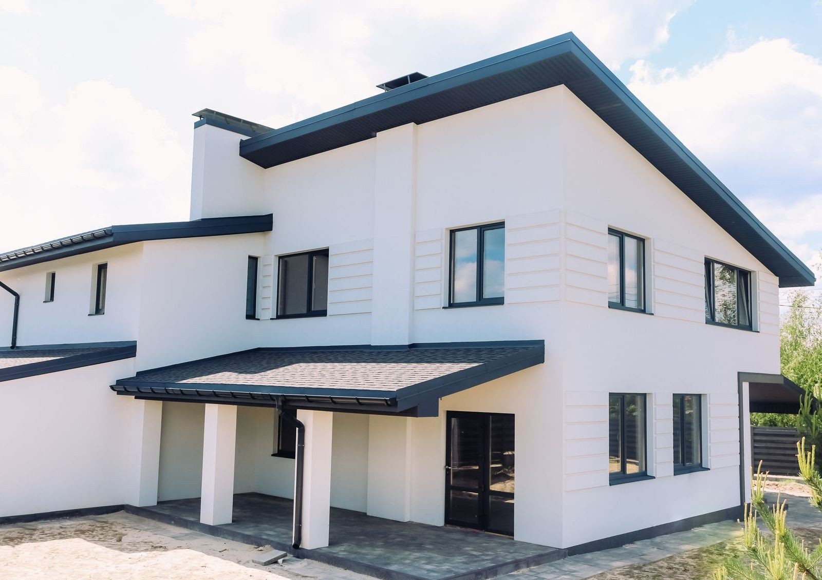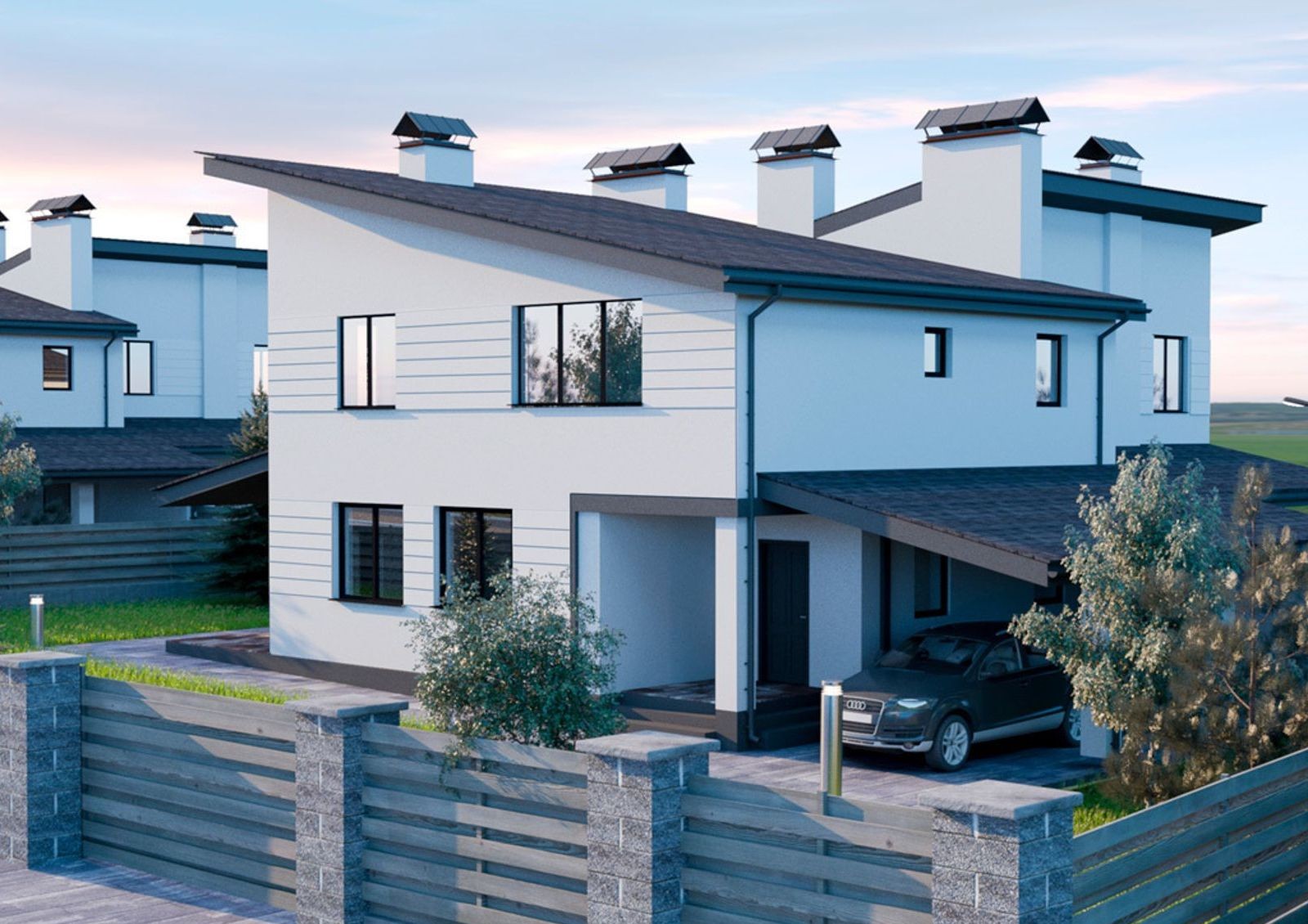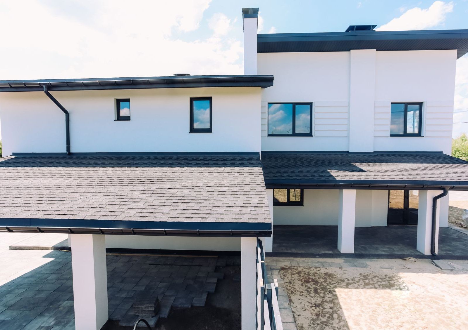 Дуплексы в коттеджном поселке строят из керамоблоков с дополнительным утеплением минеральной ватой. Крыша покрывается битумной черепицей и утепляется тем же материалом, что и стены. В квартирах устанавливают металлопластиковые окна с энергоэффективными стеклами.