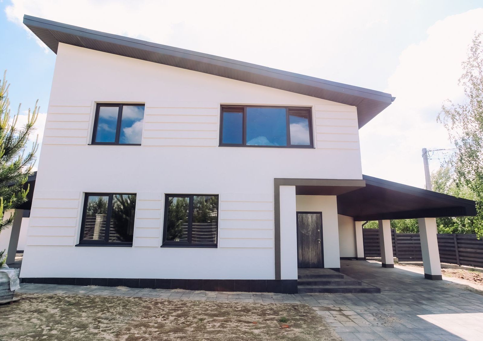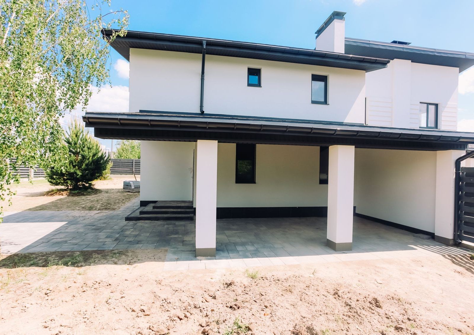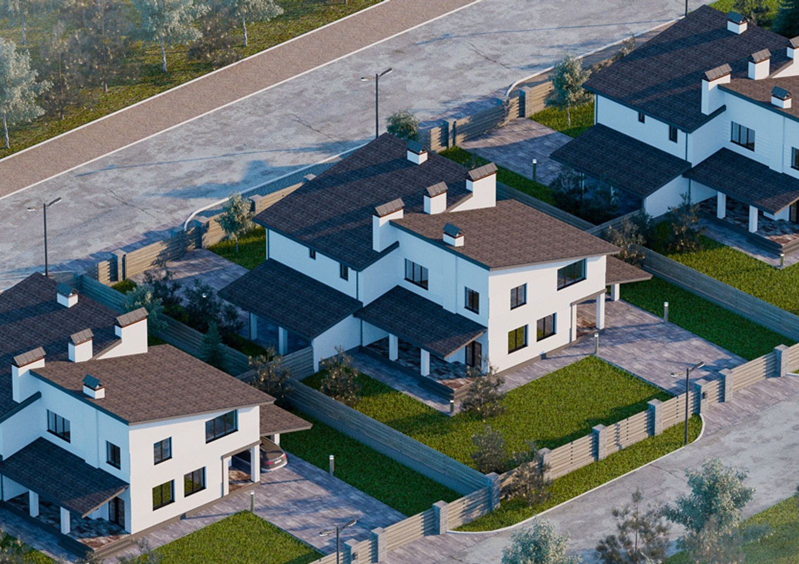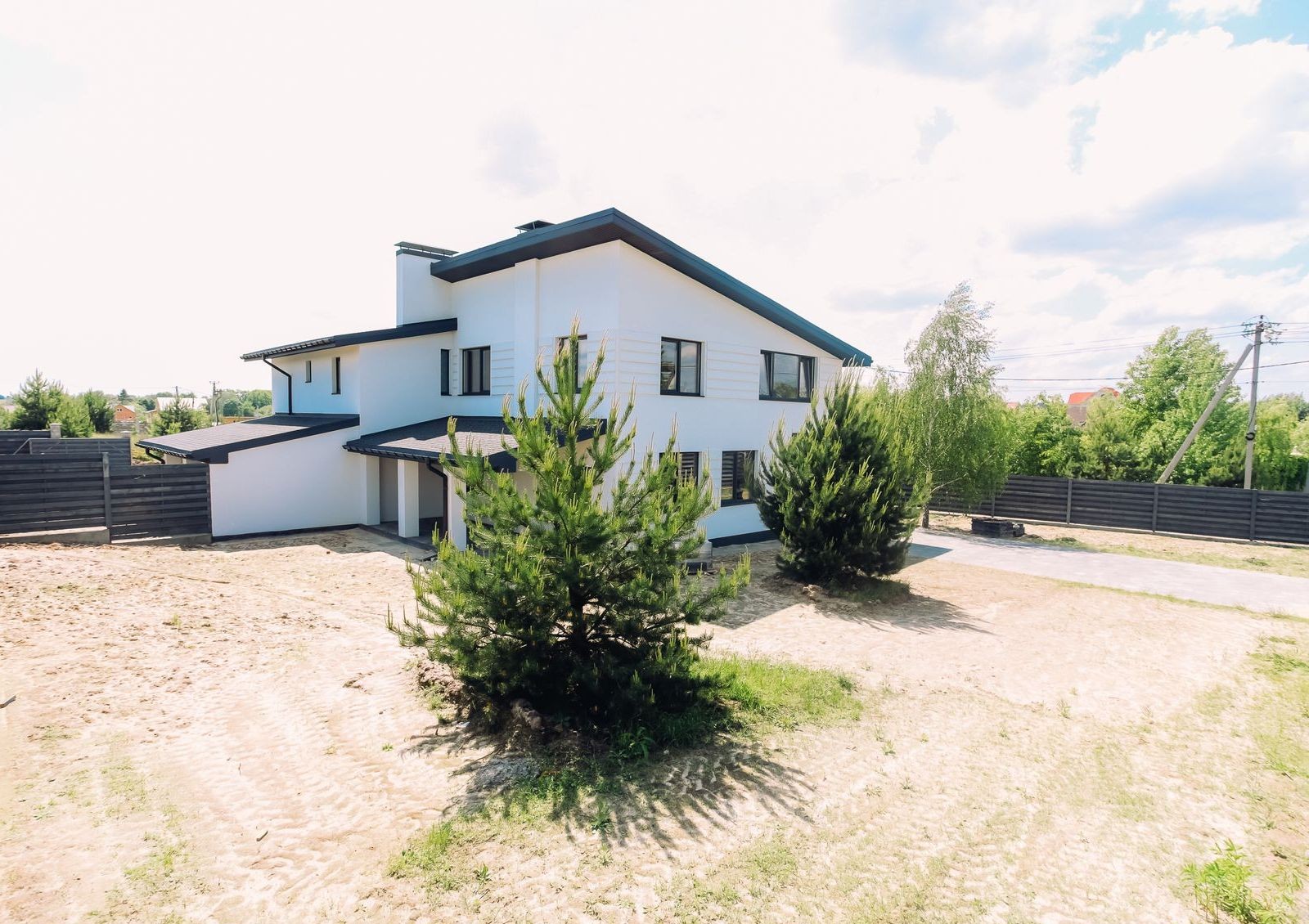 Дома продаются с земельными участками разной площади, на которых высажены молодые сосны.Для авто во дворе предусмотрено место для парковки с навесом.