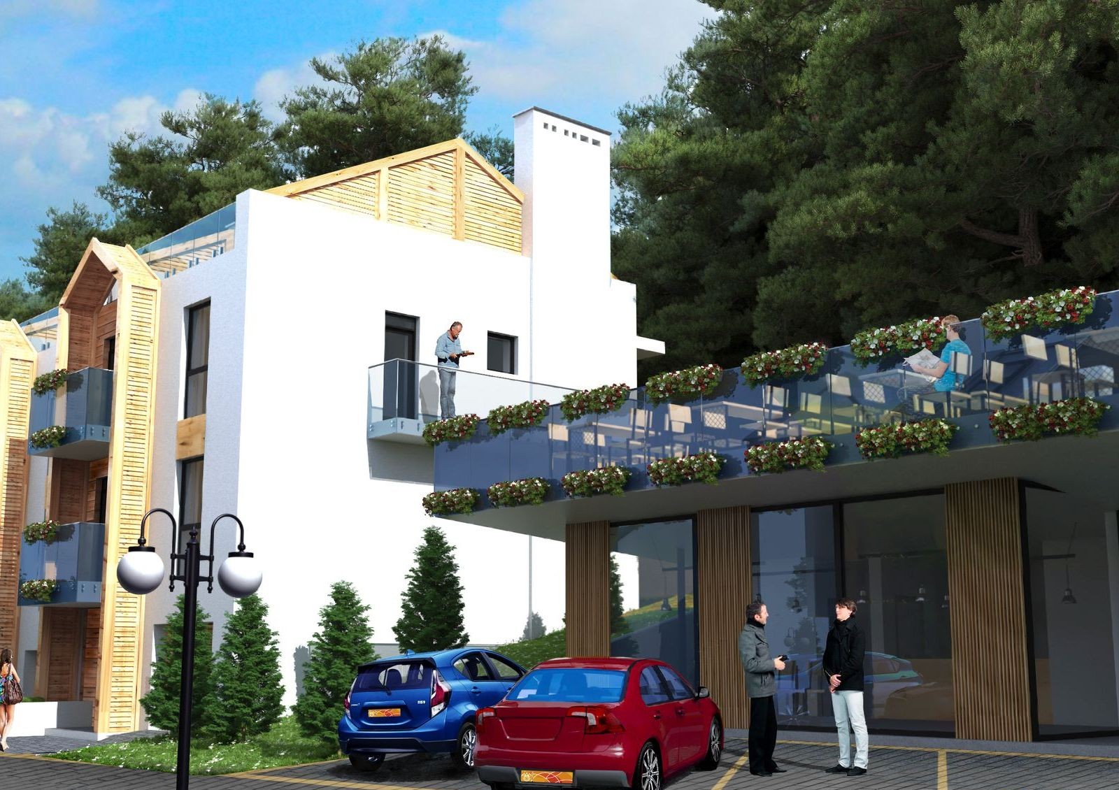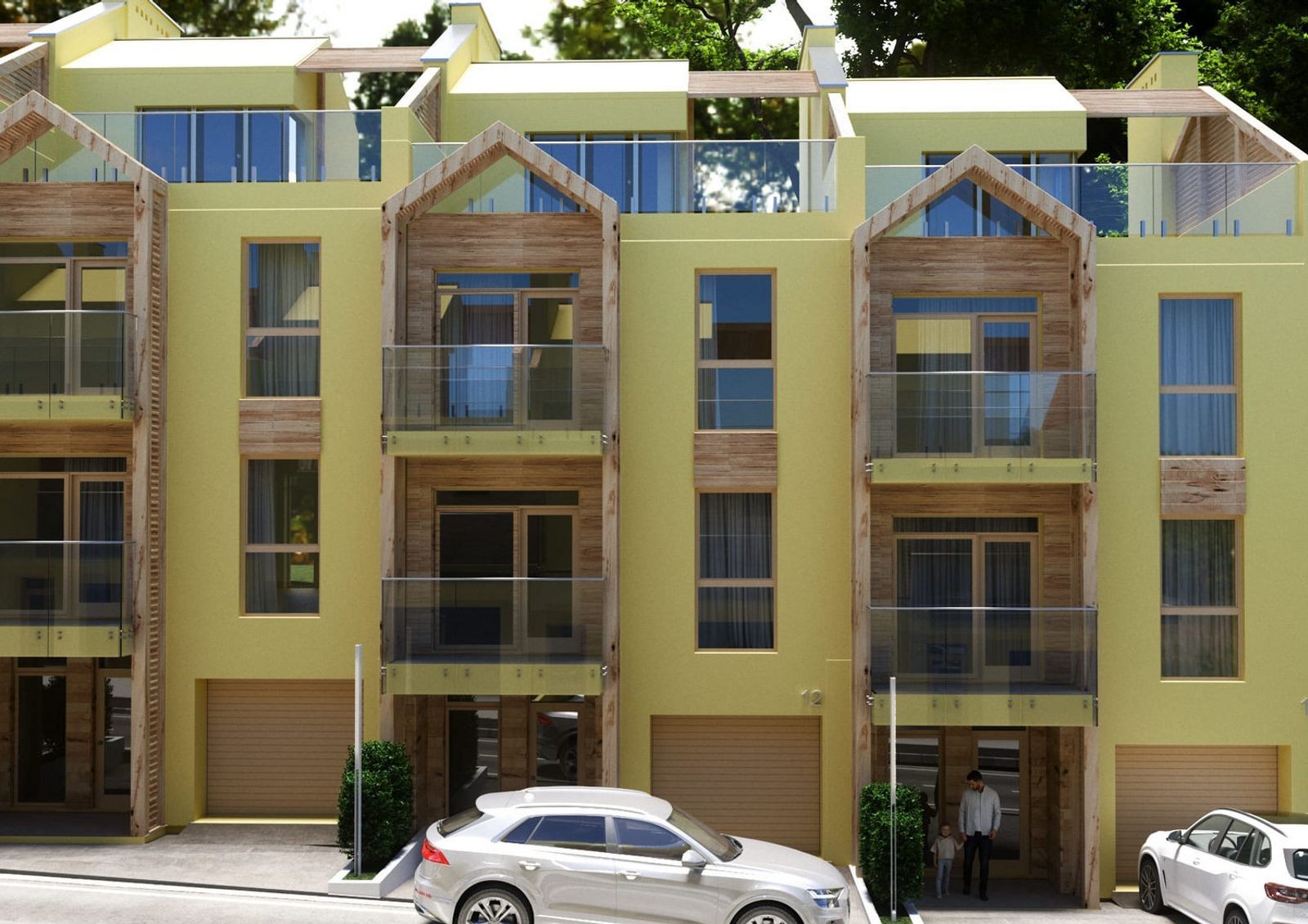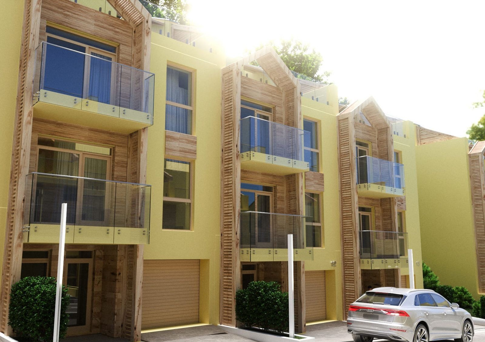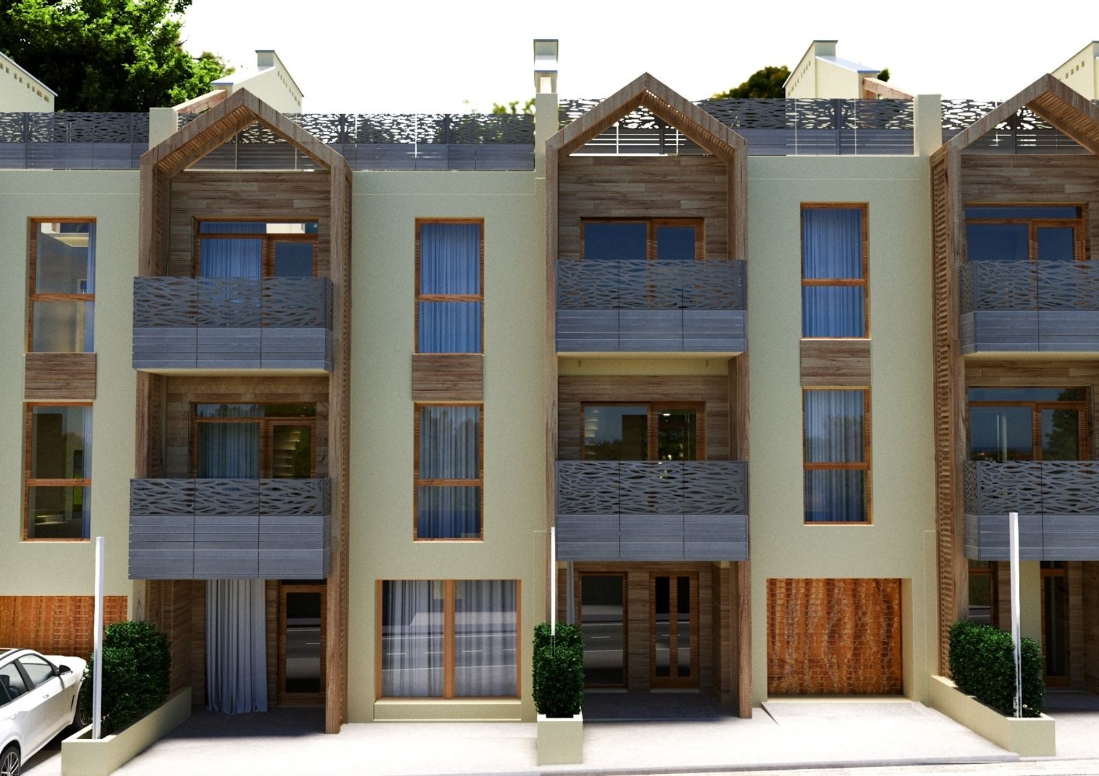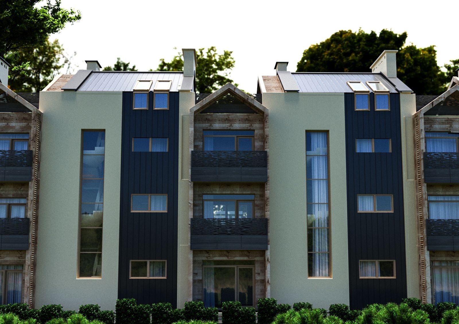 в проекте предусмотрено четыре типа таунхаусов, отличающиеся площадью и планировками, наличием террасы, эксплуатационной кровли или встроенного гаражного бокса