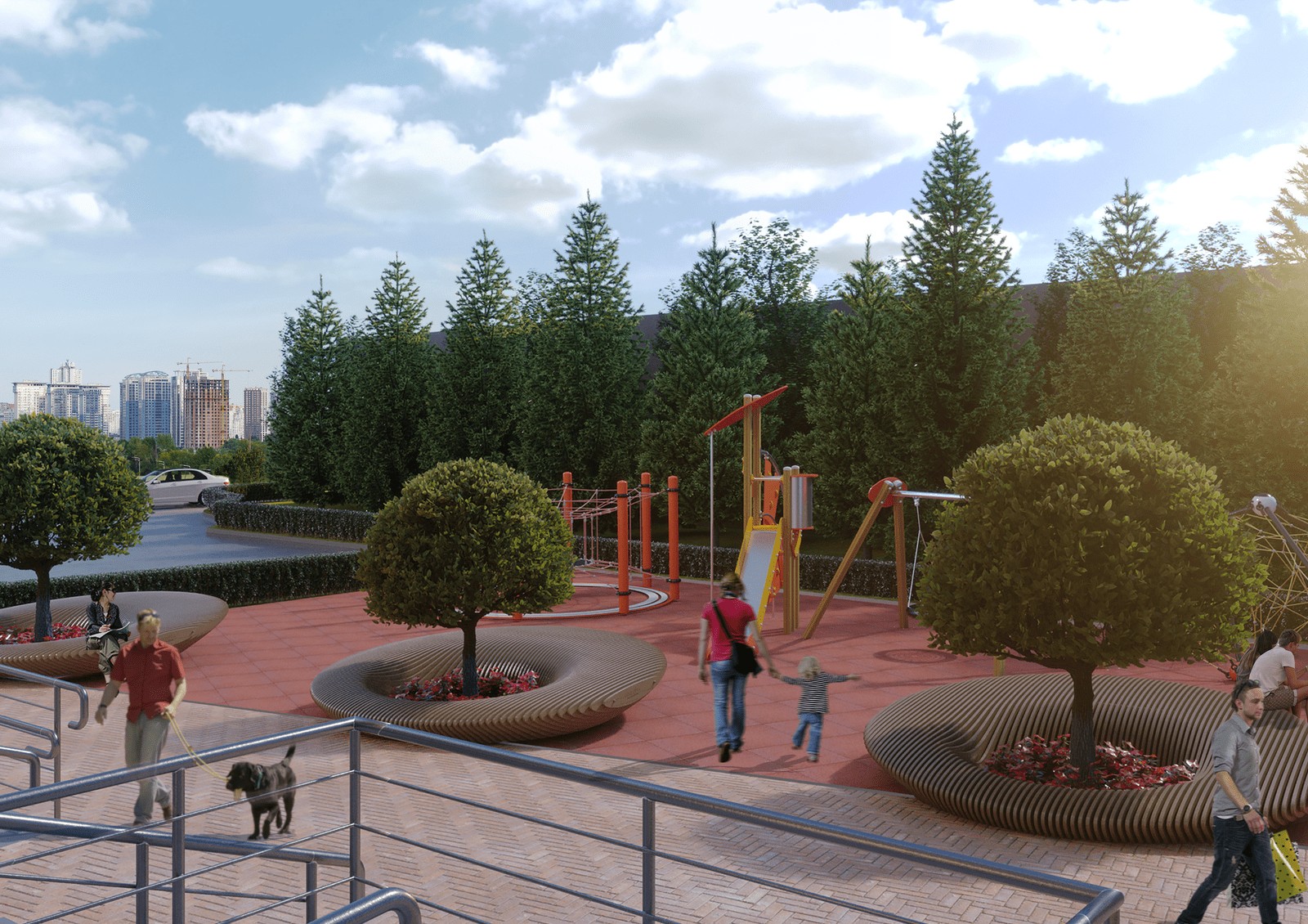 Основная особенность комплекса — виды на правый берег, зеленые склоны ботанического сада, бесконечное движение по Дарницкому мосту и Днепр. Остекление в комплексе панорамное — чтобы обзор был лучше и в комнатах было больше естественного света.
