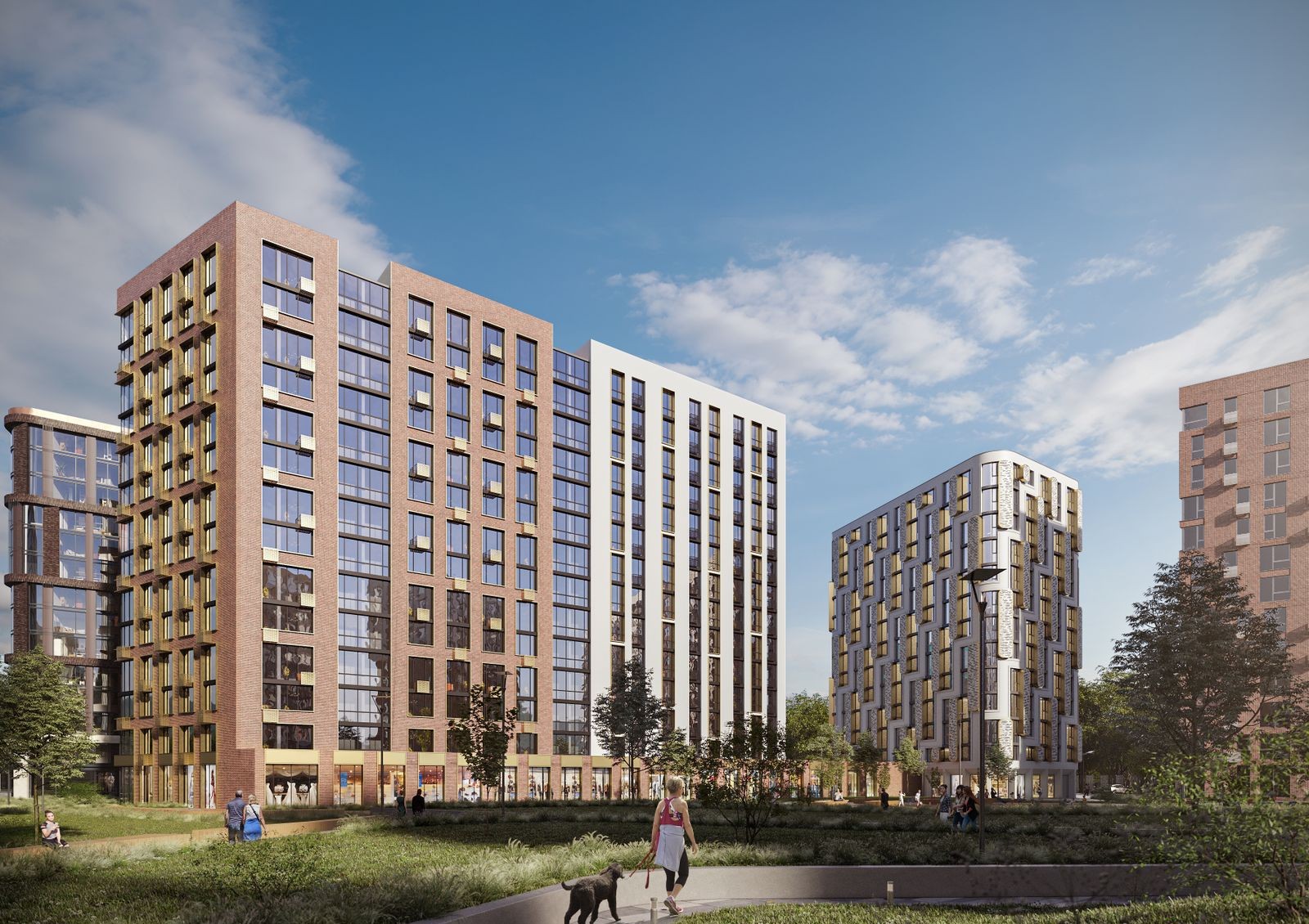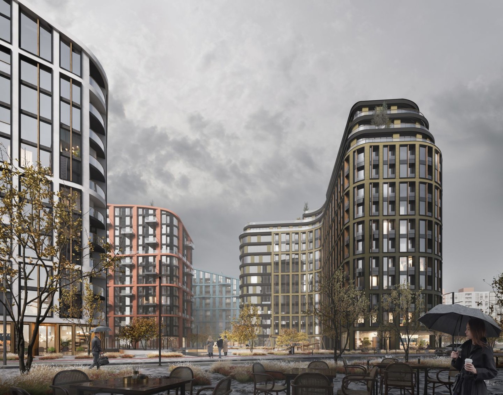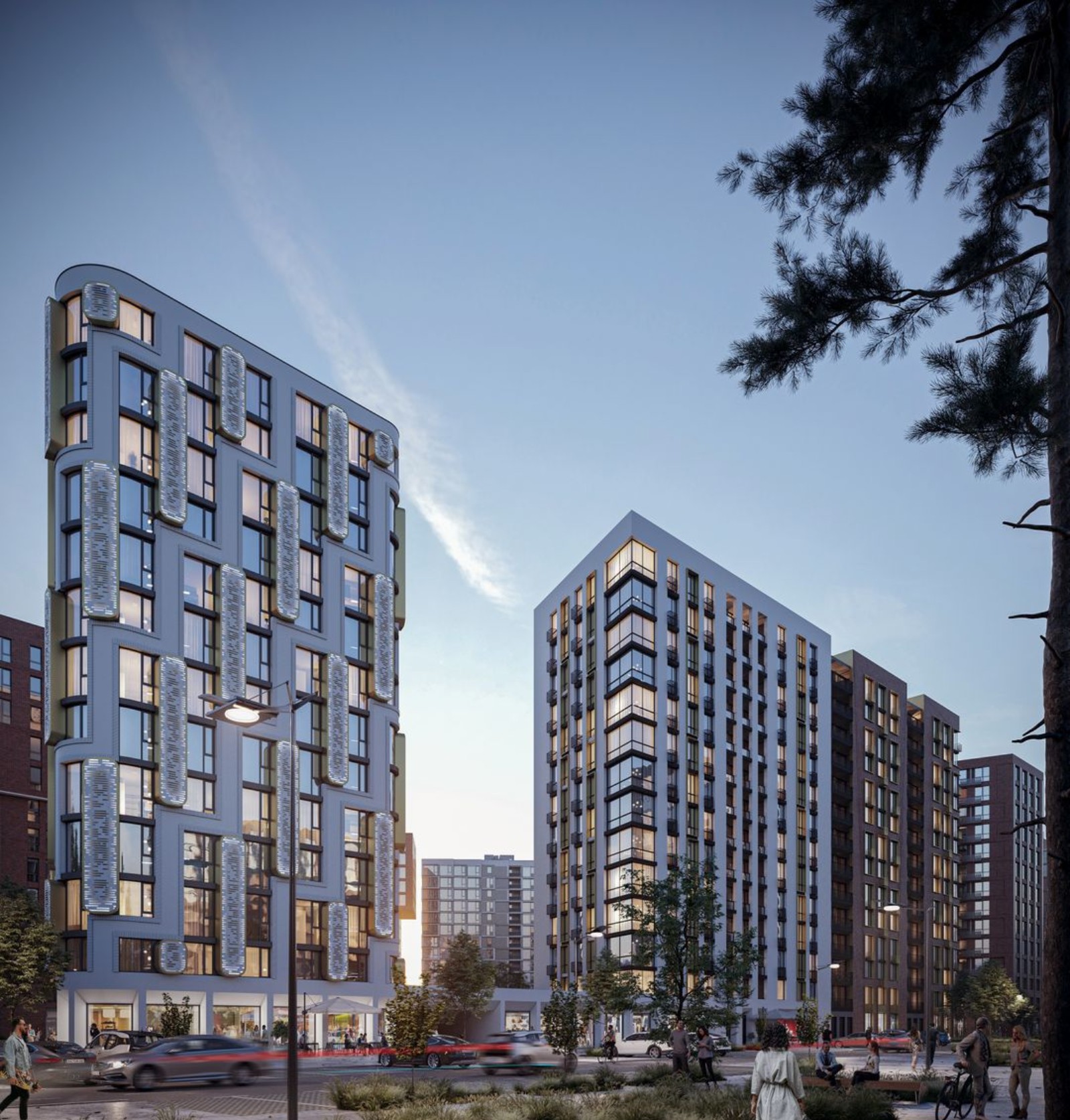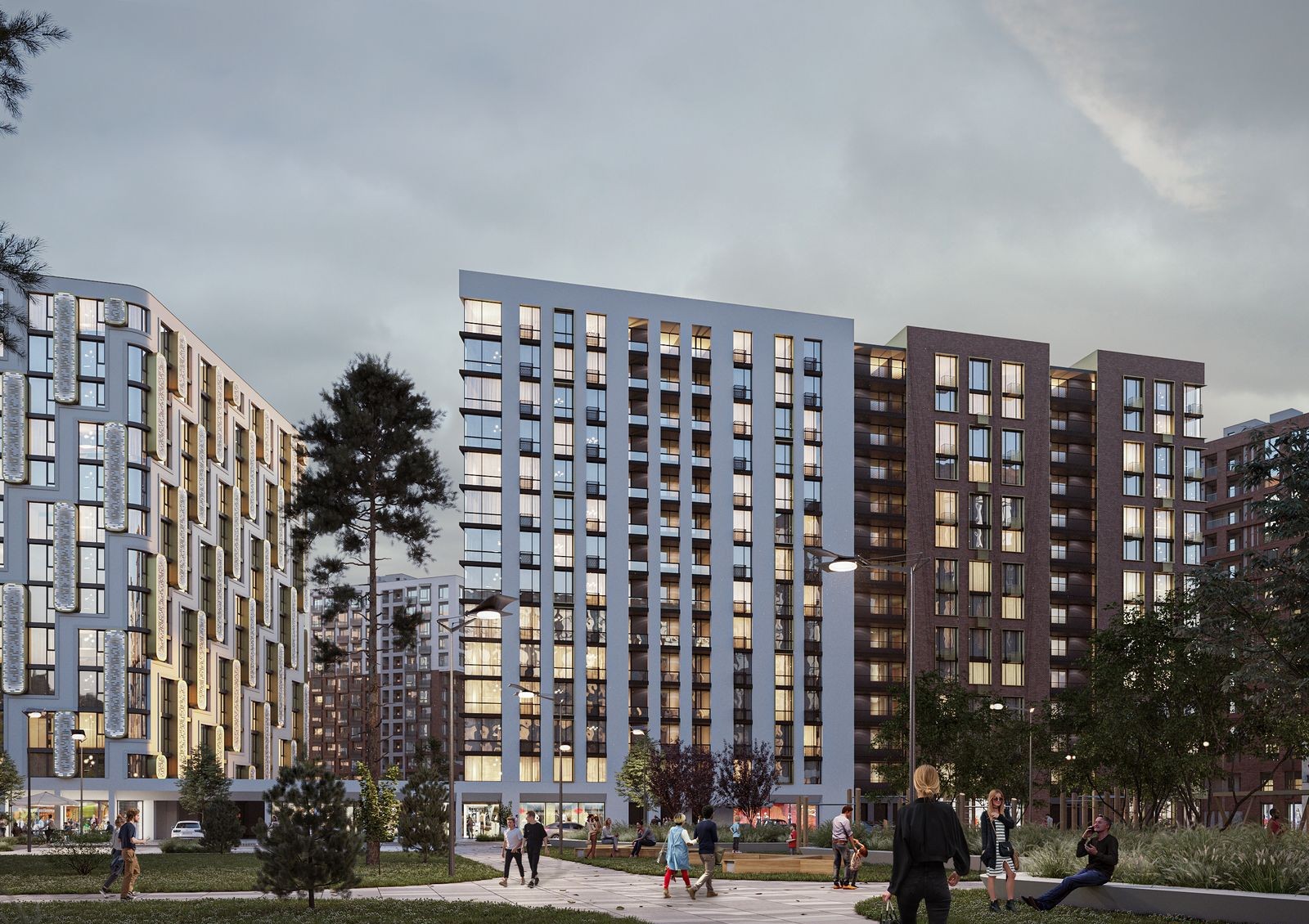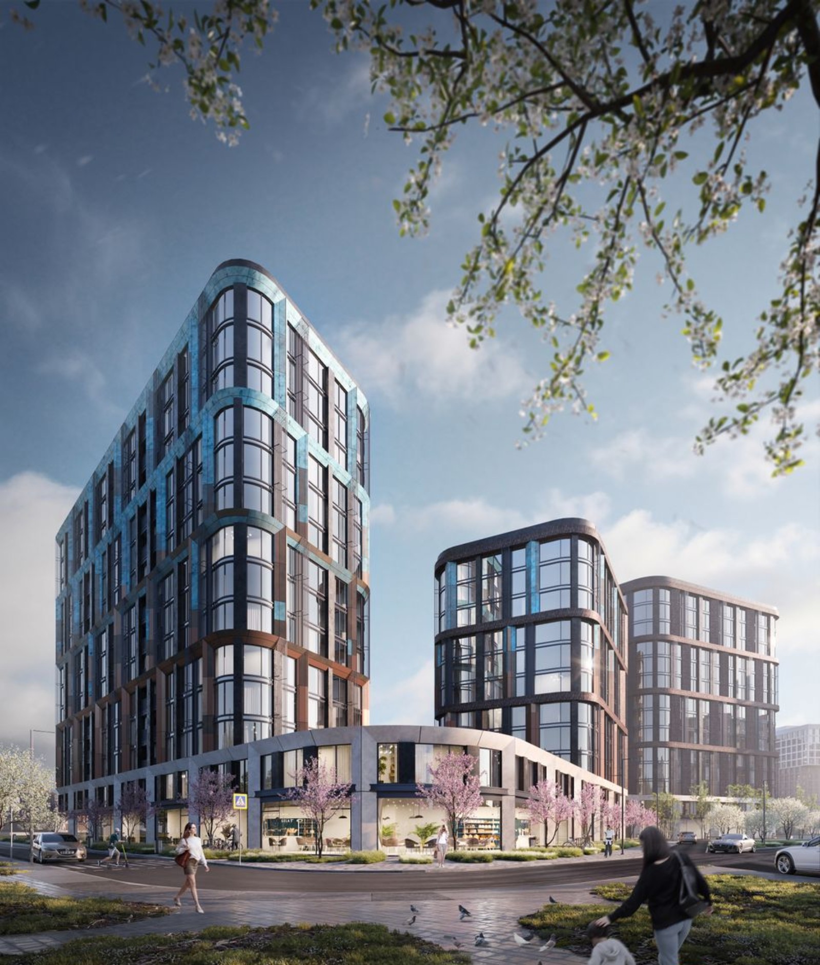 Чтобы избежать эффекта колодца и недостатка солнечного света применена разная этажность и мультифункциональное остекление. В каждой квартире предусмотрен балкон или собственная терраса, с которой открывается вид на город. Придомовая территория спроектирована в формате открытого общественного пространства с парковой зоной, местами для отдыха, детскими игровыми зонами, спортивными площадками и прогулочными аллеями.