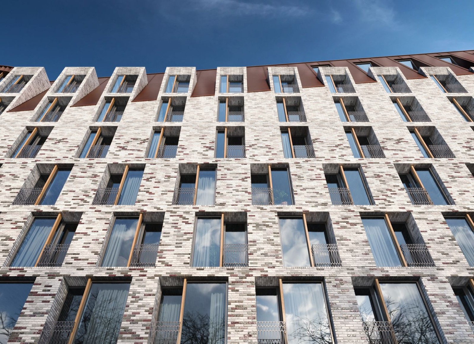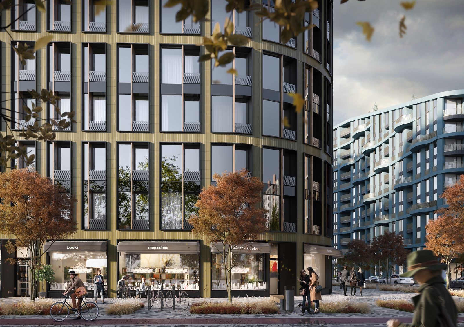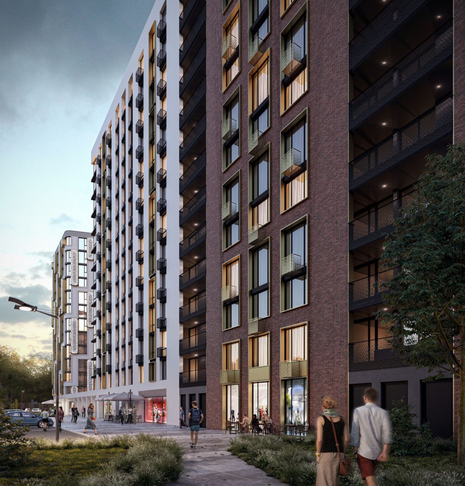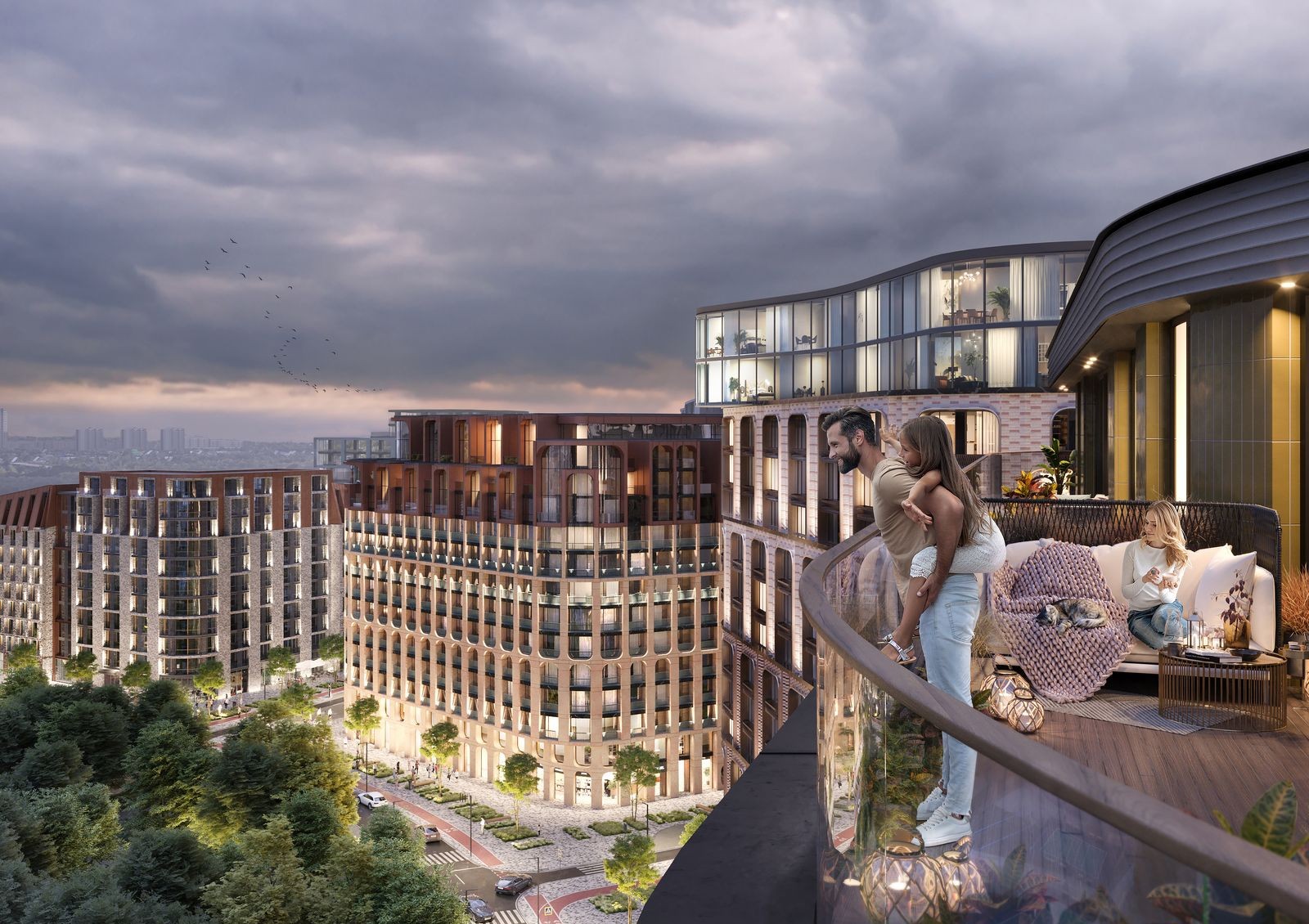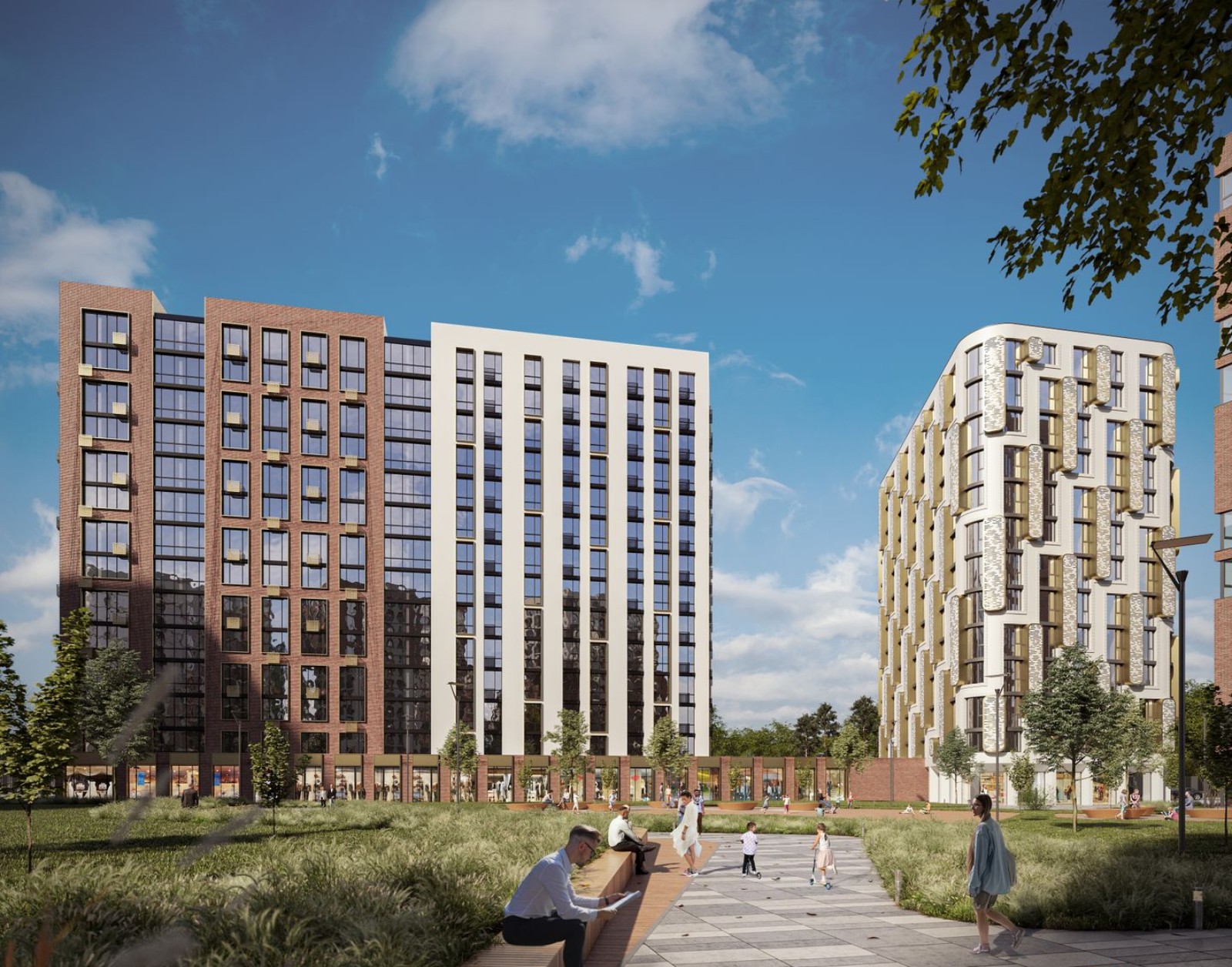 Чтобы избежать эффекта колодца и недостатка солнечного света применена разная этажность и мультифункциональное остекление. В каждой квартире предусмотрен балкон или собственная терраса, с которой открывается вид на город. Придомовая территория спроектирована в формате открытого общественного пространства с парковой зоной, местами для отдыха, детскими игровыми зонами, спортивными площадками и прогулочными аллеями.