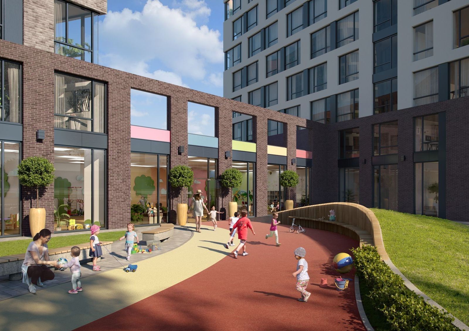 Для малышей у комплекса будет 6 собственных детских садов, предусмотренные на первых этажах домов. В 10 минутах пешком от него расположен муниципальный детский сад №682, в 5 минутах на авто — детский сад «Веселый домик», а в радиусе 10 минут езды — сады №465, №565 и №789.