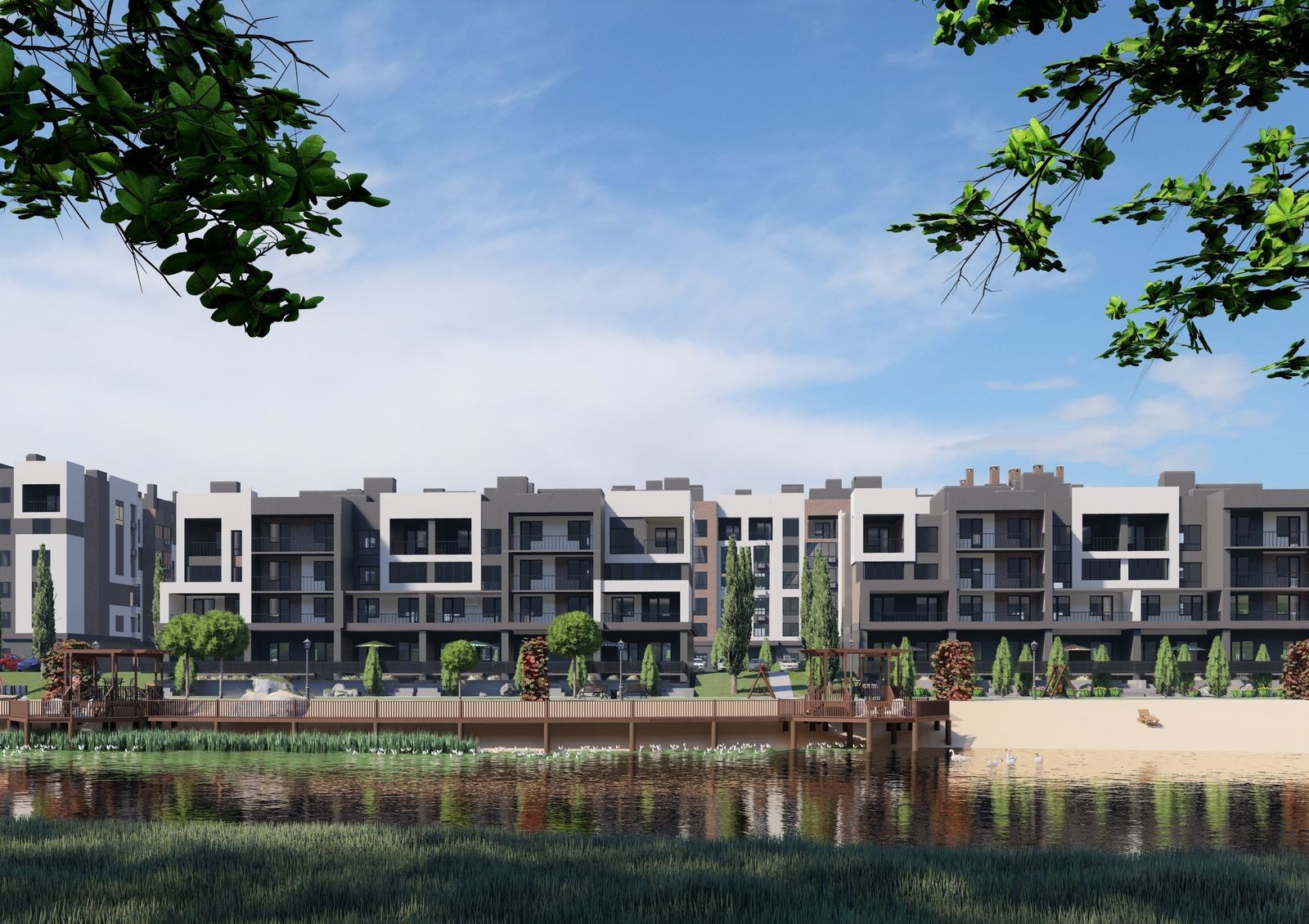 Проектом предусмотрены 47 домов переменной этажности (от 4 до 10 этажей), собственная инфраструктура, уникальный каскад озер с лебедями и обустроенными пляжами, прогулочные аллеи, велодорожки, спортивные и детские площадки, зоны отдыха с BBQ и стоянка для автомобилей.
