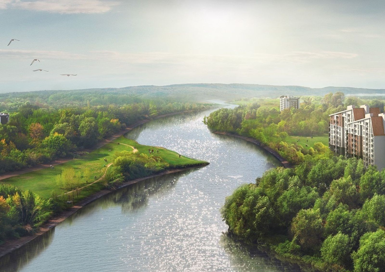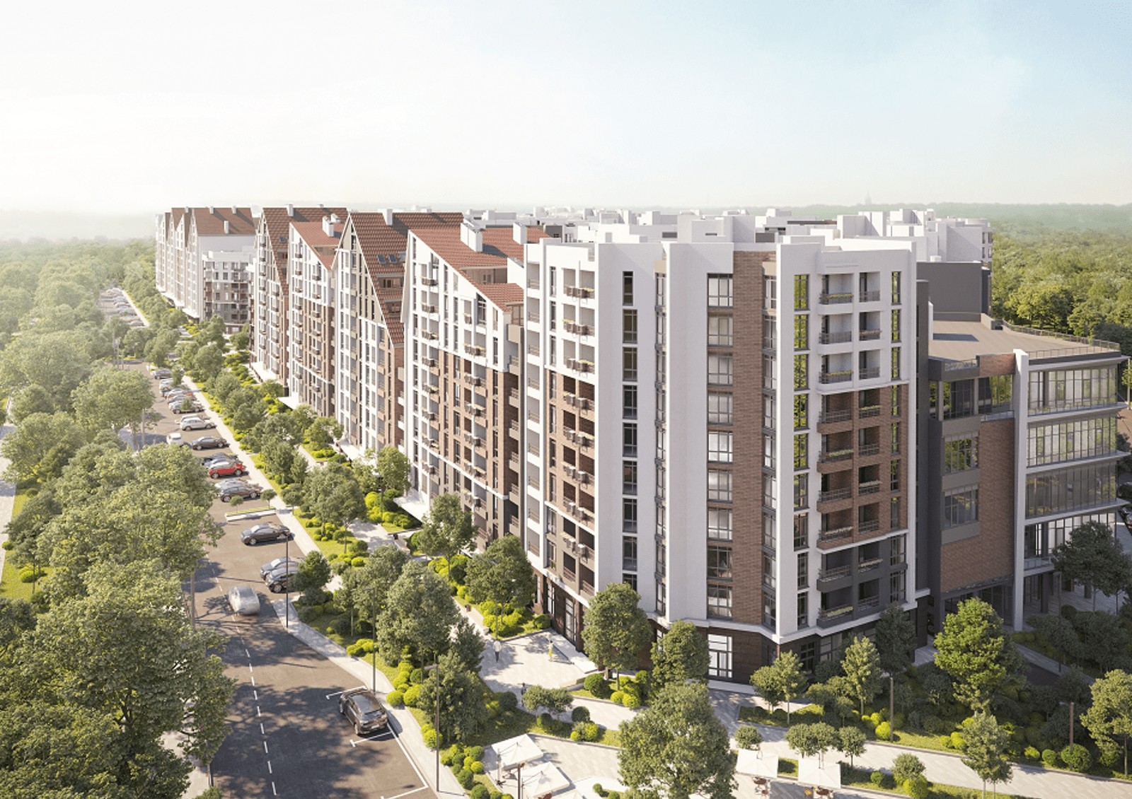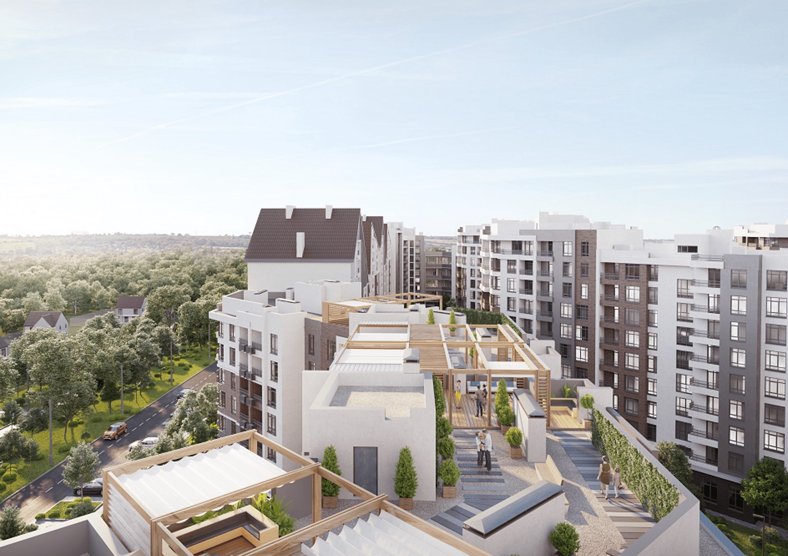 Вся территория с озеленением, чтобы парковая зона продолжалась и на территории комплекса. Кровли домов планируют эксплуатировать — там будут открытые террасы и обзорные площадки с видами на город, набережную, реку и лес.