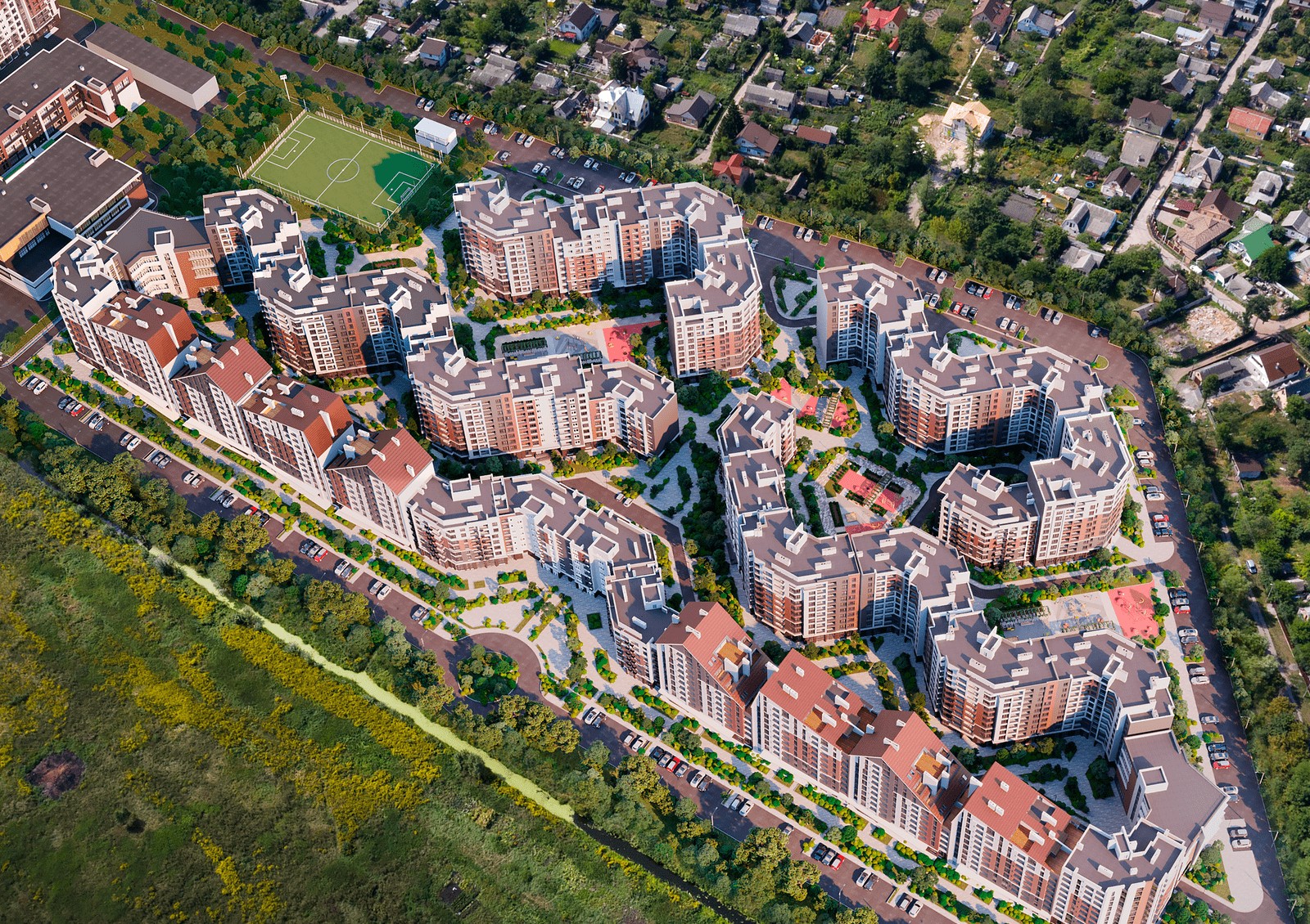 «Синергия Сити» — это флагманский проект строительной группы «Синергия» в Ирпени. Комплекс расположен в зеленой зоне Ирпеня — рядом парк и набережная, а на другой стороне реки начинается лиственный лес. Длина набережной вдоль ЖК «Синергия Сити» 8.800 метров — отличное место для прогулок и утренних пробежек. В проекте будут как открытые придомовые пространства, так и дворы закрытого типа.