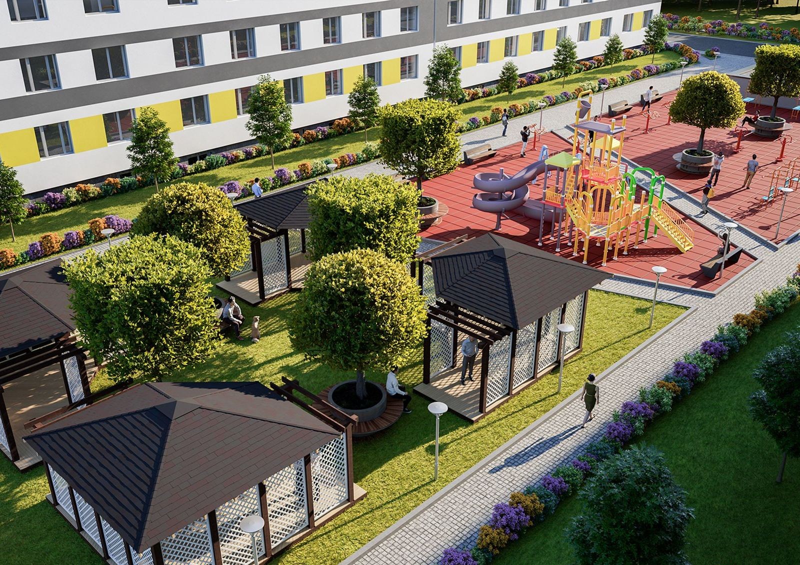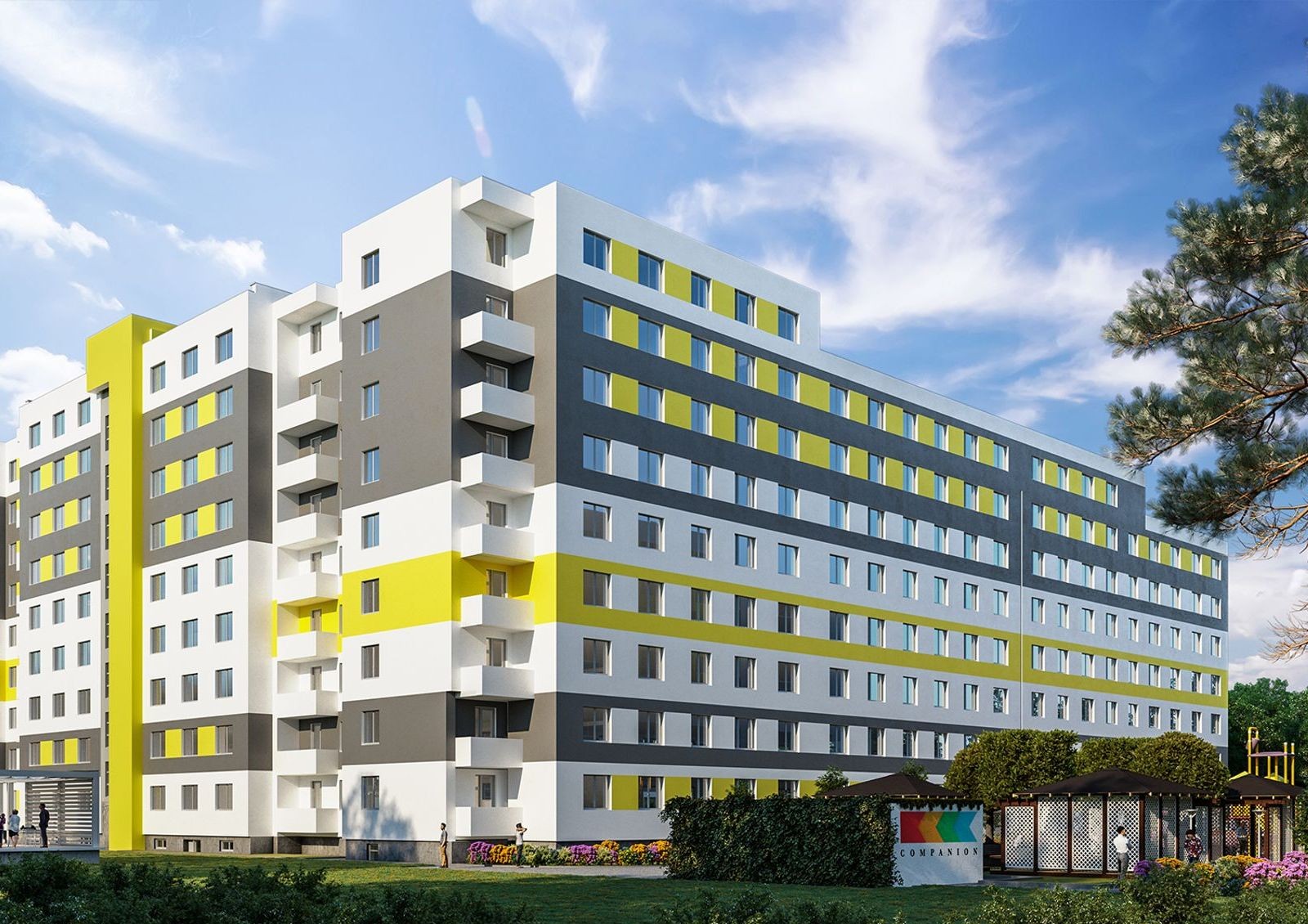 Два дома в жилом комплексе «Компаньон» расположены П-образно, создавая при этом закрытое внутридворовое пространство. Здания имеют каскадную этажность и спокойные тона отделки с контрастными элементами на фасаде. На территории ЖК предусмотрены площадки для занятий спортом и детских игр, а также зоны отдыха с беседками.
