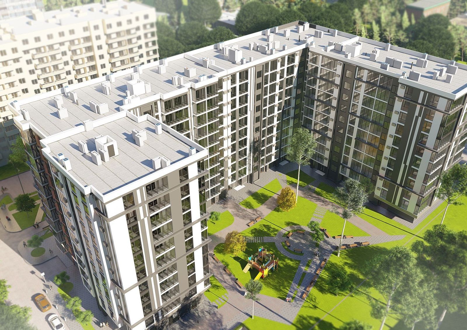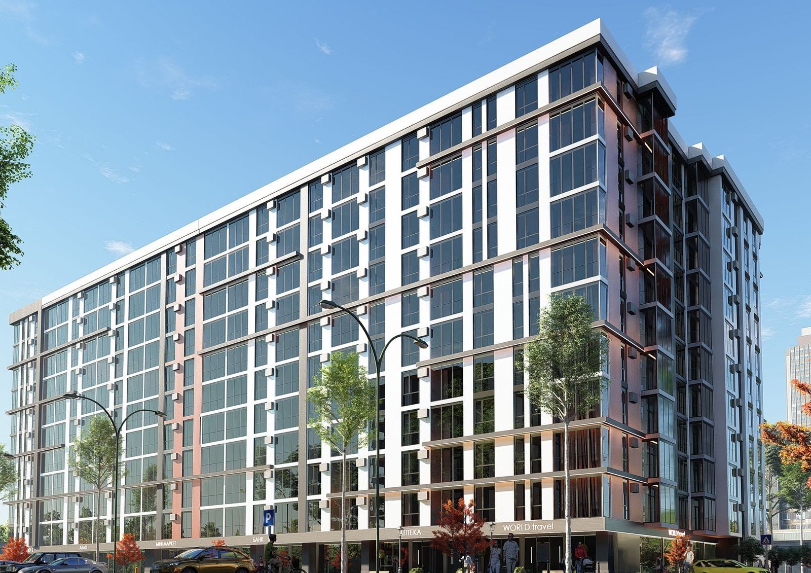 Проект жилого комплекса по ул. Тернопольская, 42 подразумевает строительство 10-этажного жилого дома и обустройство внутридворового пространства игровыми зонами и местами для отдыха. Большую часть фасада занимают панорамные окна, которые установят в комнатах и лоджиях — за счет этого в квартирах всегда будет светло и уютно. На первом этаже предусмотрены коммерческие помещения: для комфорта жителей там откроют магазины, аптеки, салоны красоты или кофейни.