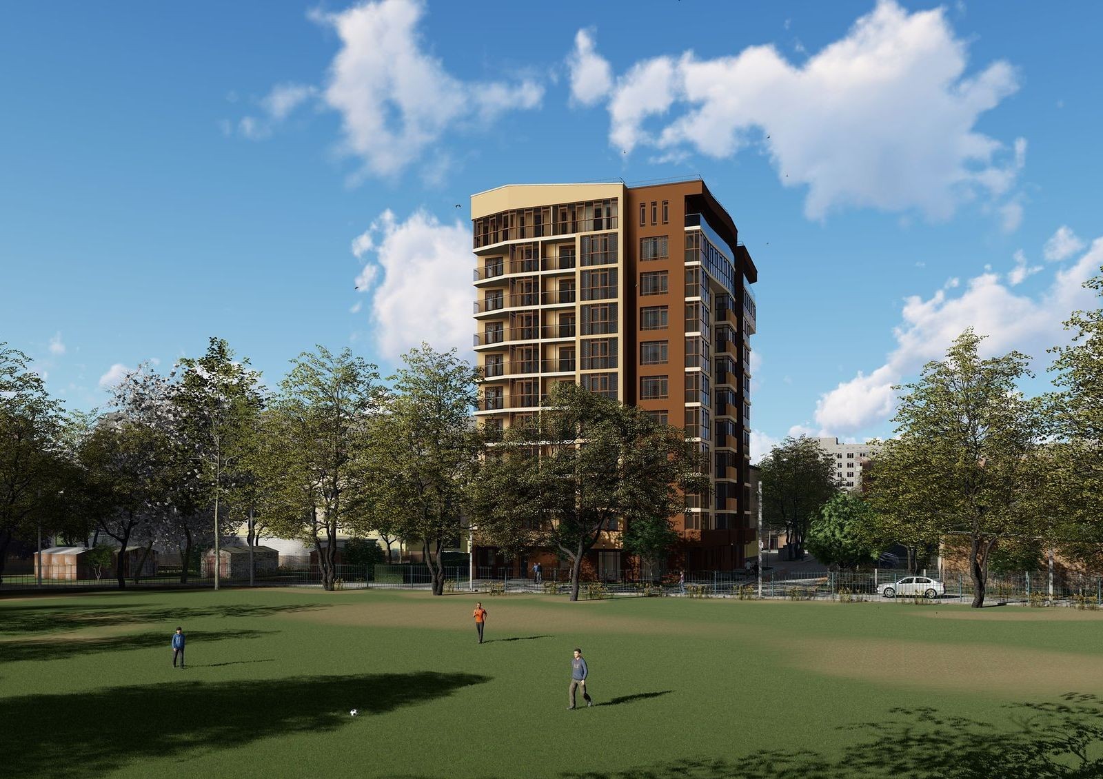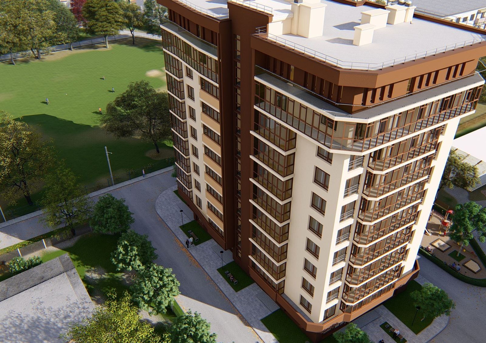 10-этажный дом по ул. Выговского, 29 расположен в Железнодорожном районе Львова рядом со школами, детскими садами, аптеками, магазинами и остальной инфраструктурой, необходимой для комфортной жизни. Конструкция здания отлично вписывается в окружающую архитектуру за счет сдержанных оттенков и линий фасада. Во дворе дома будут подземный паркинг, детская площадка и обустроенные пешеходные зоны.