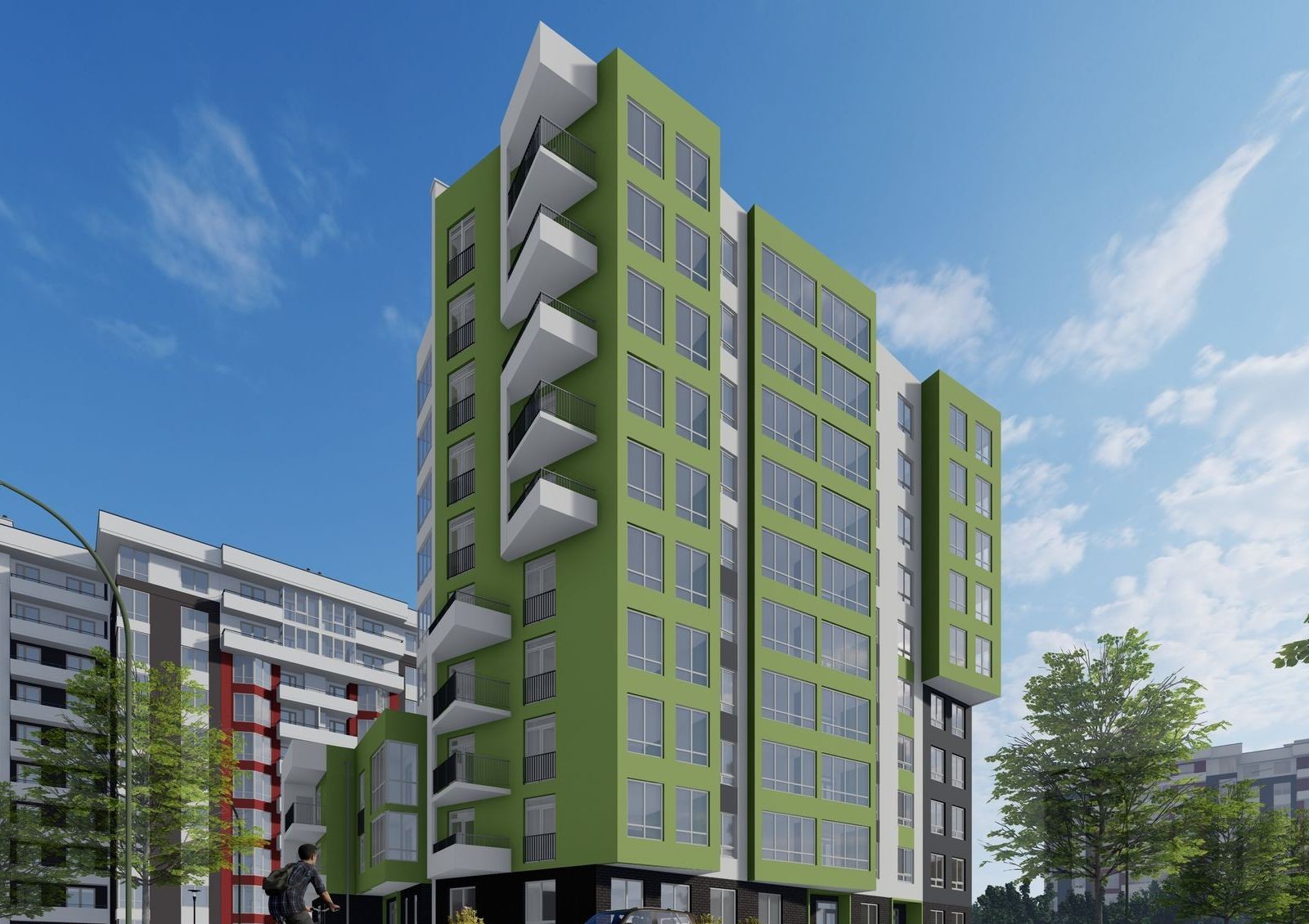 «Сиховская Околица 2» — это 10-этажный жилой комплекс, который расположен на окраине Львова в Сиховском районе. Фасад здания планируют сделать многоуровневым с выступающими частями, а его украшением станут панорамные окна и балконы треугольной формы. На территории комплекса обустроят зону для отдыха и установят детскую площадку.