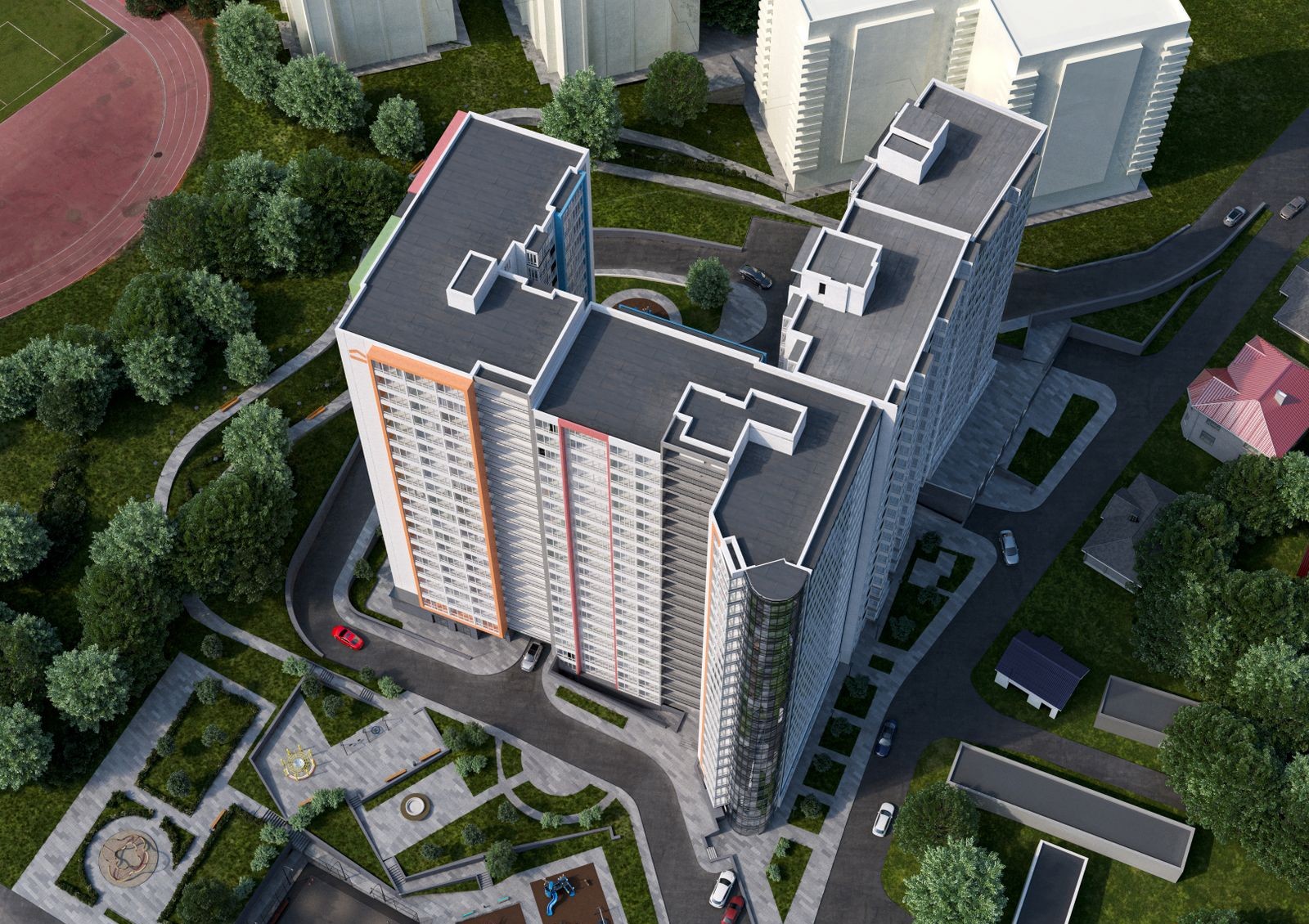 секции с помещениями неправильной формы — комнаты-экреры с панорамными окнами по всей полуокружности