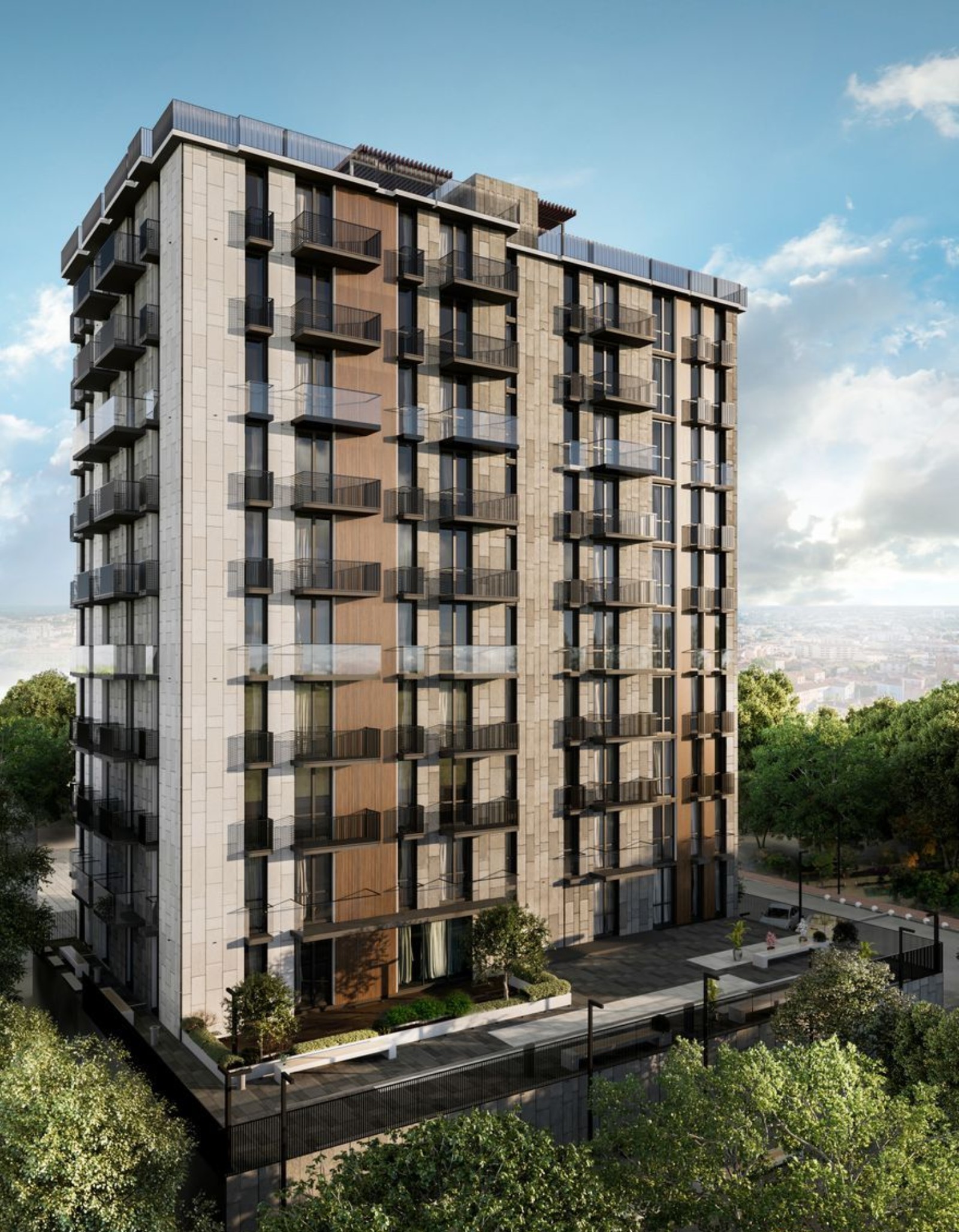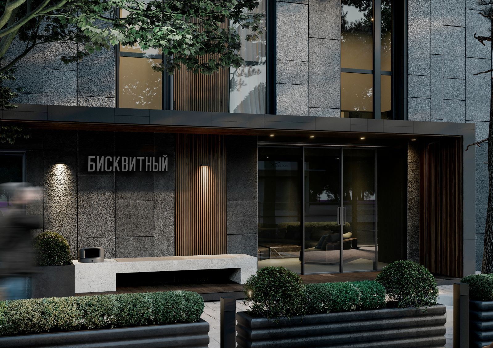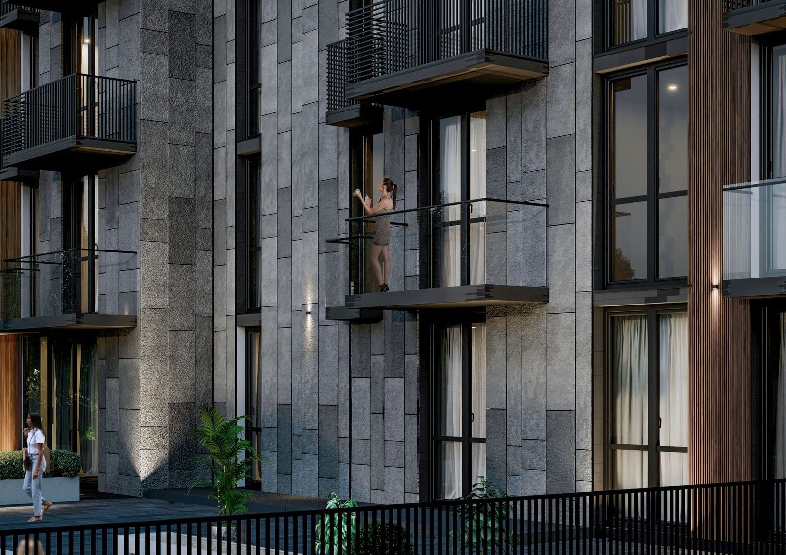 стеклянные входные группы, панорамные окна и балконы во всю высоту этажа