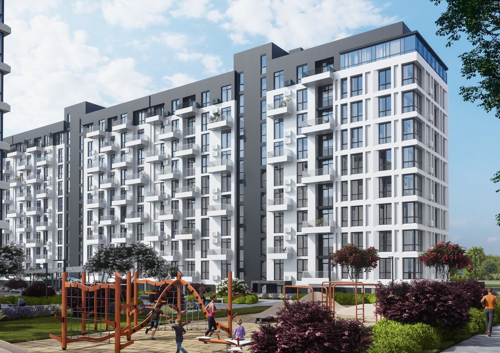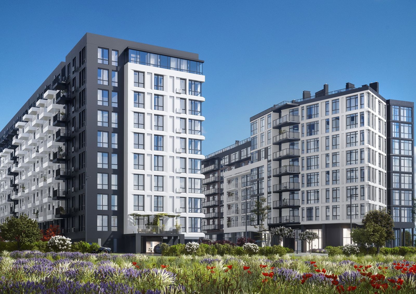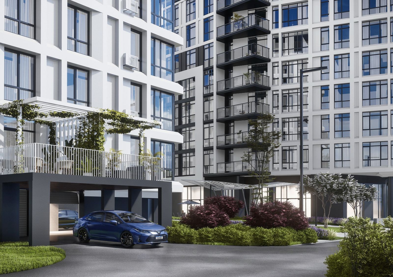 Вся территория комплекса поделена на зоны: спортивную — здесь есть воркаут-площадки и баскетбольное поле, детскую — с игровыми площадками, а также рекреационные — с местами для отдыха и Wi-Fi. В рамках развития инфраструктуры микрорайона проектом предусмотрена торговая аллея, вдоль которой будут находиться коммерческие помещения на первом этаже зданий. И все это создано по концепции «двор без авто» — для машин предусмотрены подземный паркинг и гостевая стоянка.