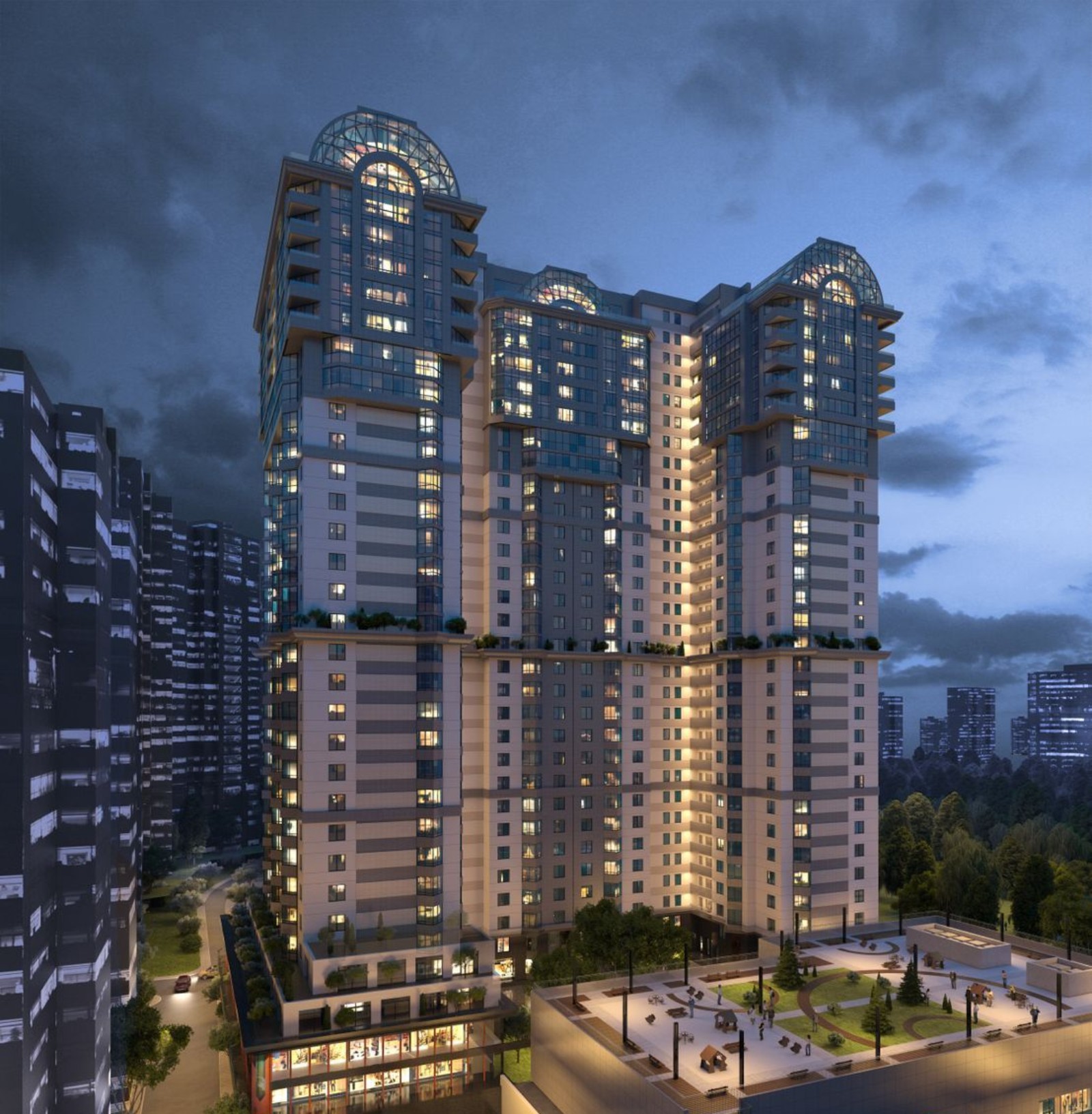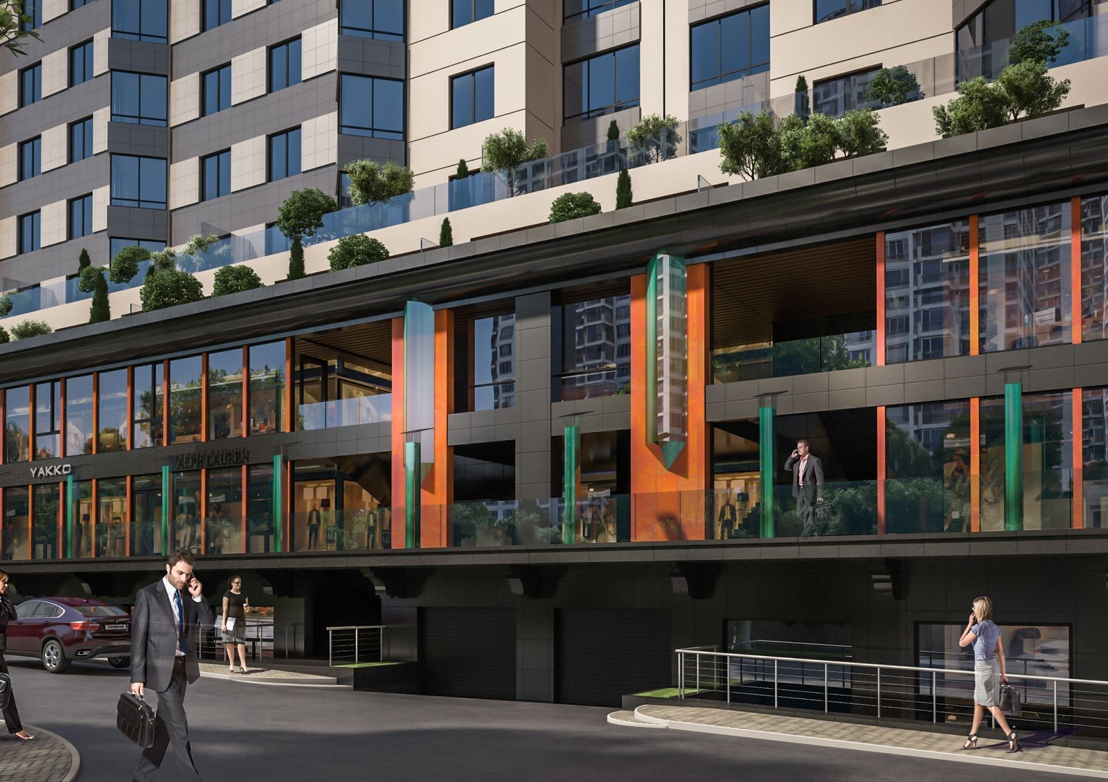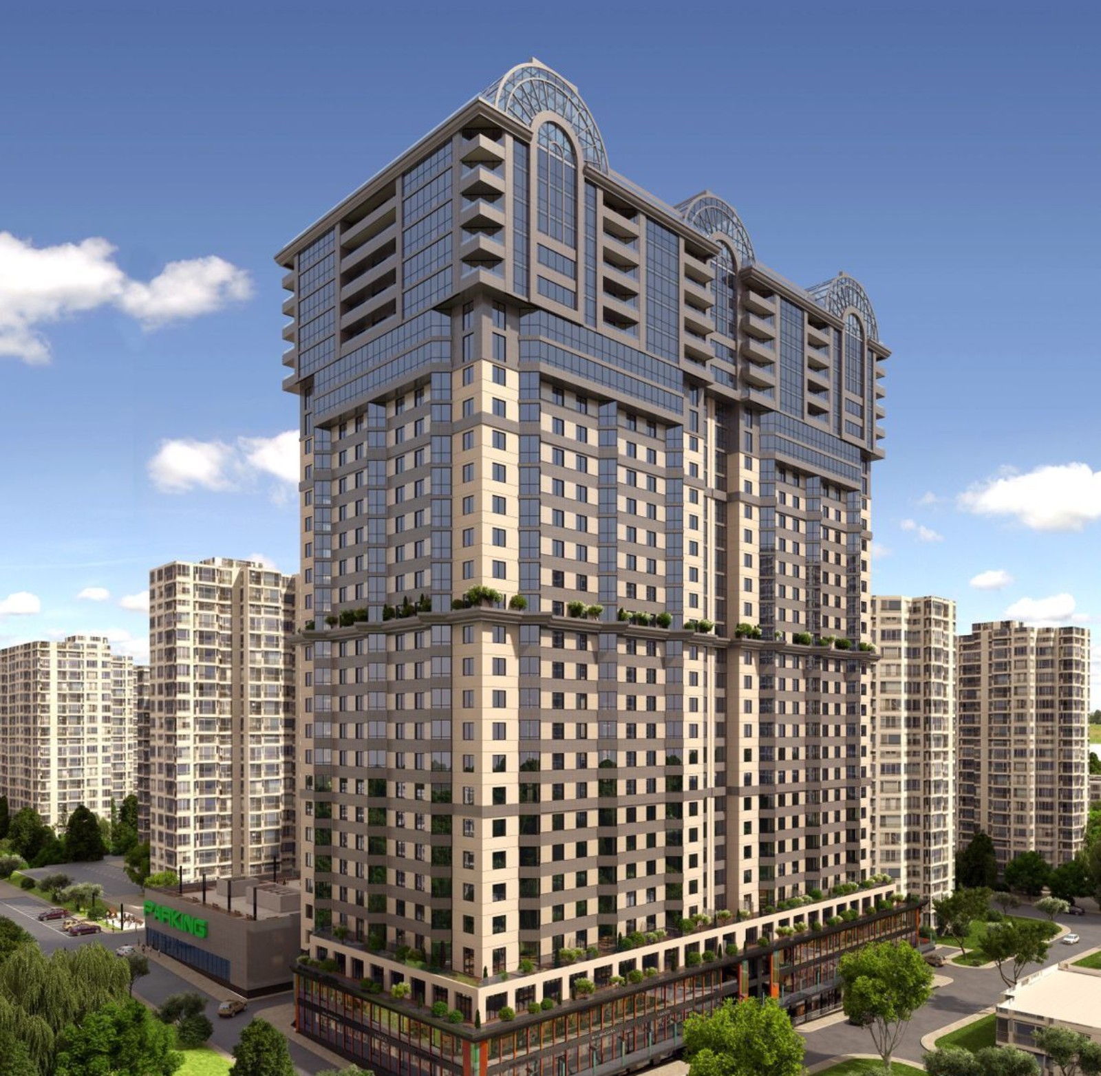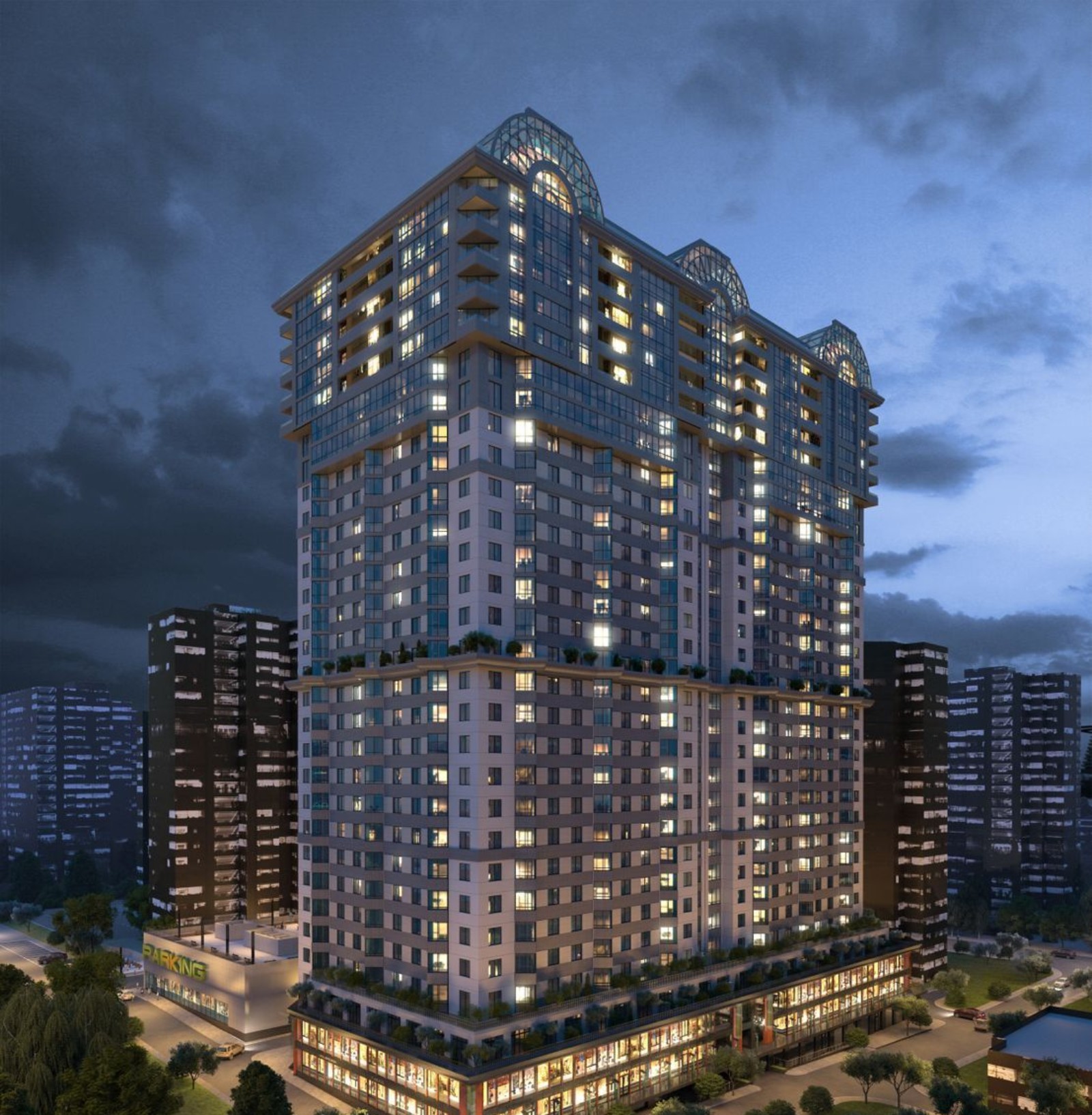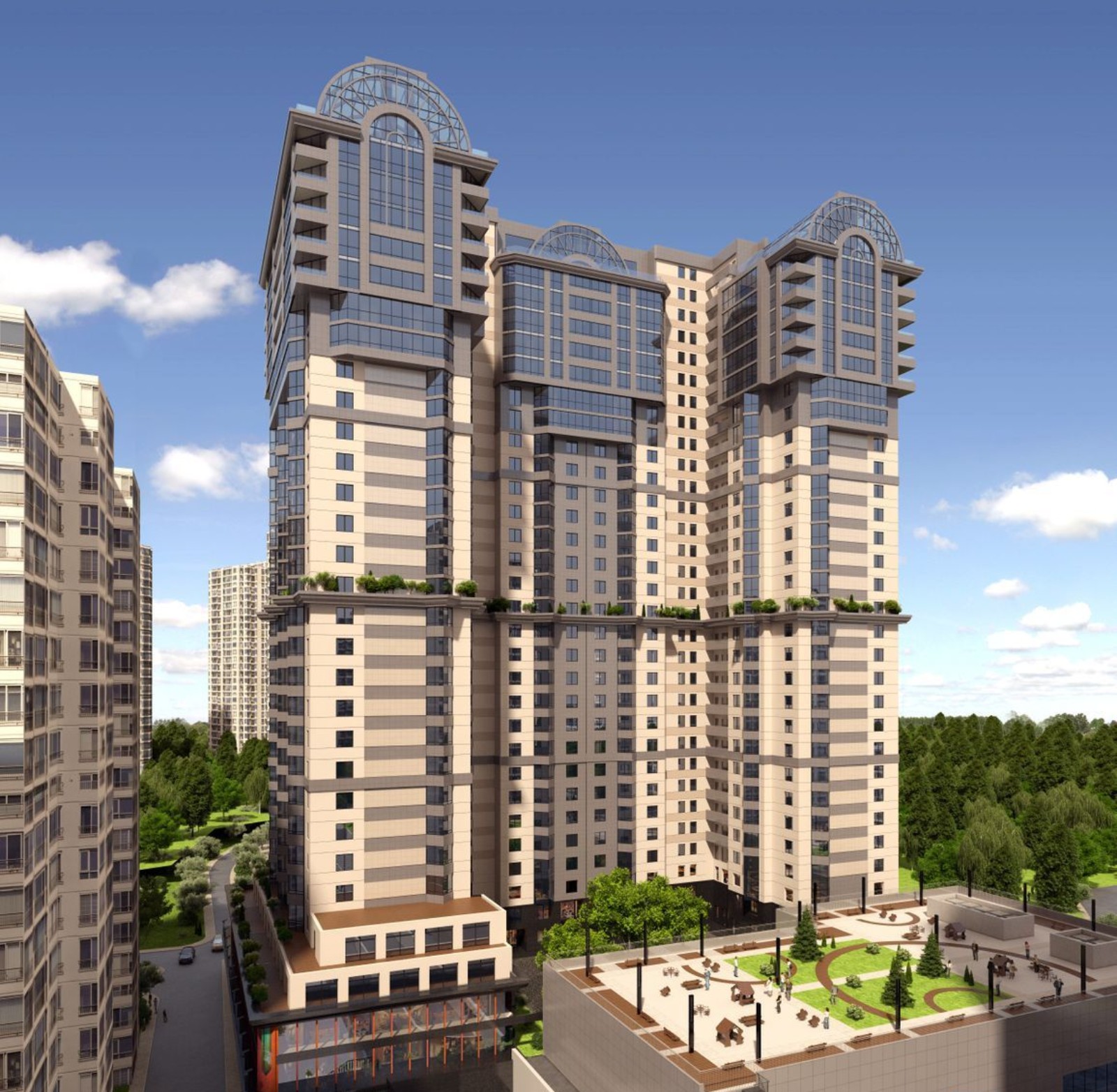 Расположение в деловой части города — это близость к объектам инфраструктуры, бизнес-центрам и офисным комплексам. Первые два этажа комплекса также коммерческие, под офисы и сервисные услуги, за которыми нужно только спуститься на лифте. Если хотите прогуляться среди зелени и не чувствовать себя в центре шумного города — 20 минут пешком или 7 минут на авто до ботанического сада им. Николая Гришко, где цветут магнолии, сирень, розы и фиалки, а также открыты теплицы с редкими растениями.