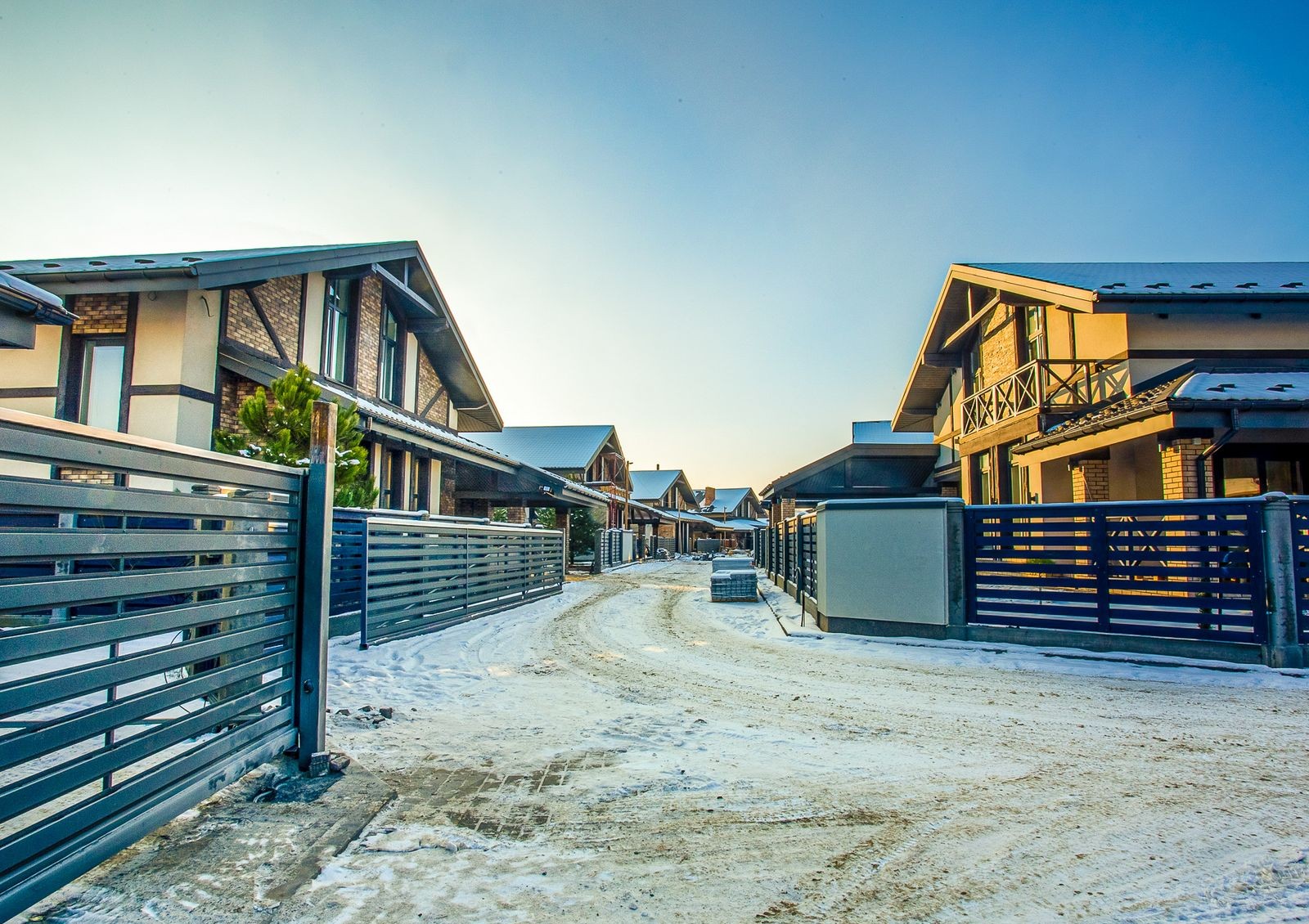 внутренние дворы коттеджей и пешеходные аллеи вымощены брусчаткой