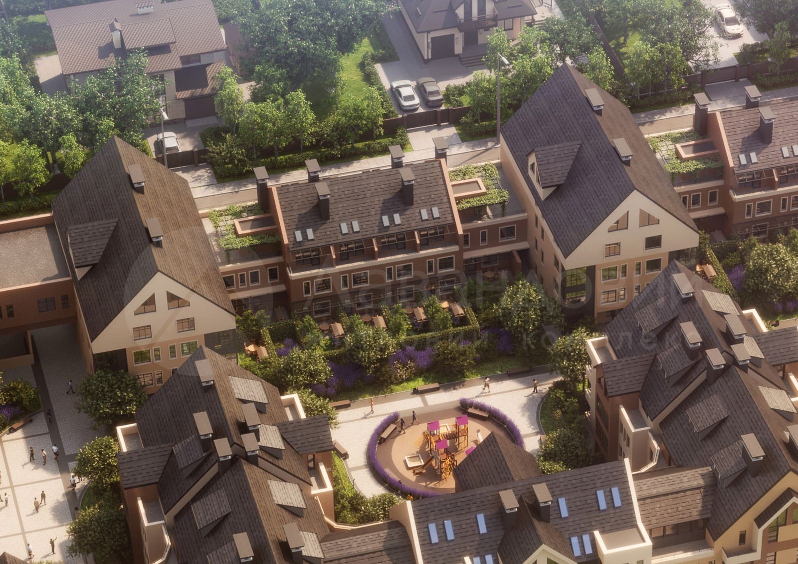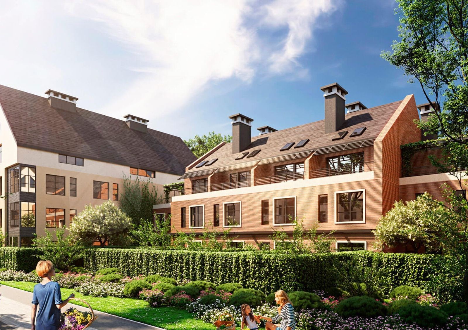 У таунхаусов не будет проблем с инсоляцией помещений благодаря наклонным окнам в крыше, слуховым окнам и окнам в щипцовой стене. Придомовые участки будущие жители смогут обустроить как им угодно — устроить там детскую игровую зону или барбекю зону для отдыха с друзьями. Автомобили на территорию внутренних дворов не проедут, поэтому не будут мешать жителям.