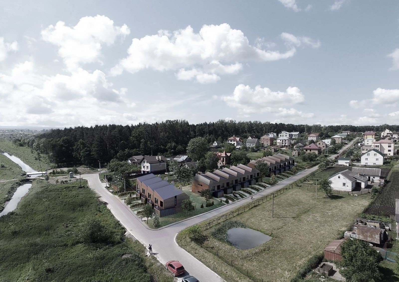 Экологичная местность возле соснового леса и реки, пригородная атмосфера спокойствия и тишины, живописная панорама природы за окном — все это про новый проект таунхаусов «ProЛІСок». Удачное расположение подкрепляется близостью к городу — всего 3 км, и вы во Львове.