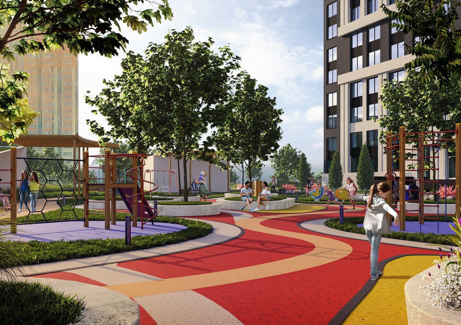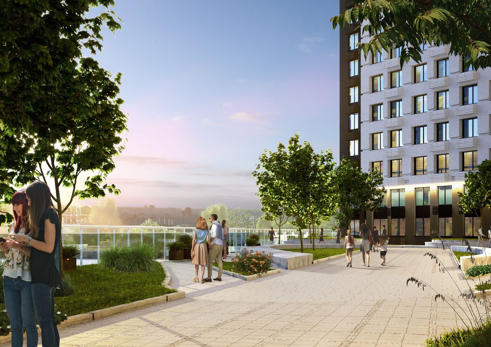 Придомовая территория будет закрытого типа с концепцией двор без авто — никаких транзитных маршрутов возле дома. Также во дворе будет ландшафтный парк с озеленением, детскими и спортивными площадками, местами для отдыха или удаленной работы на свежем воздухе.