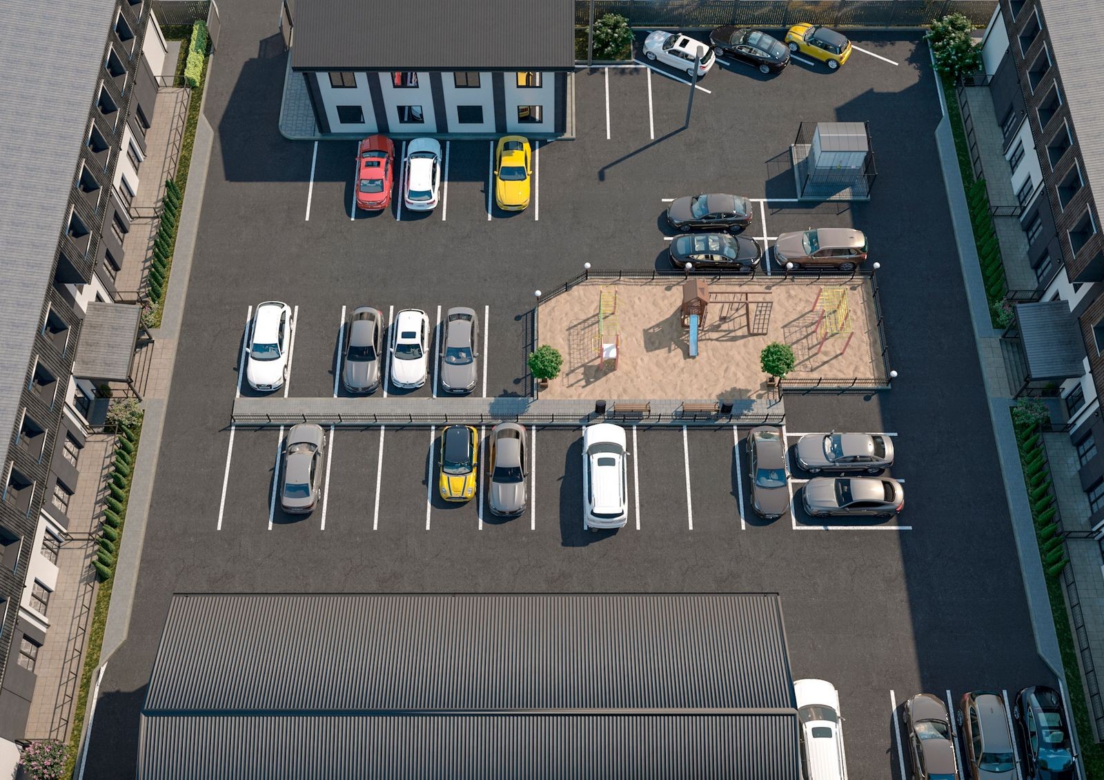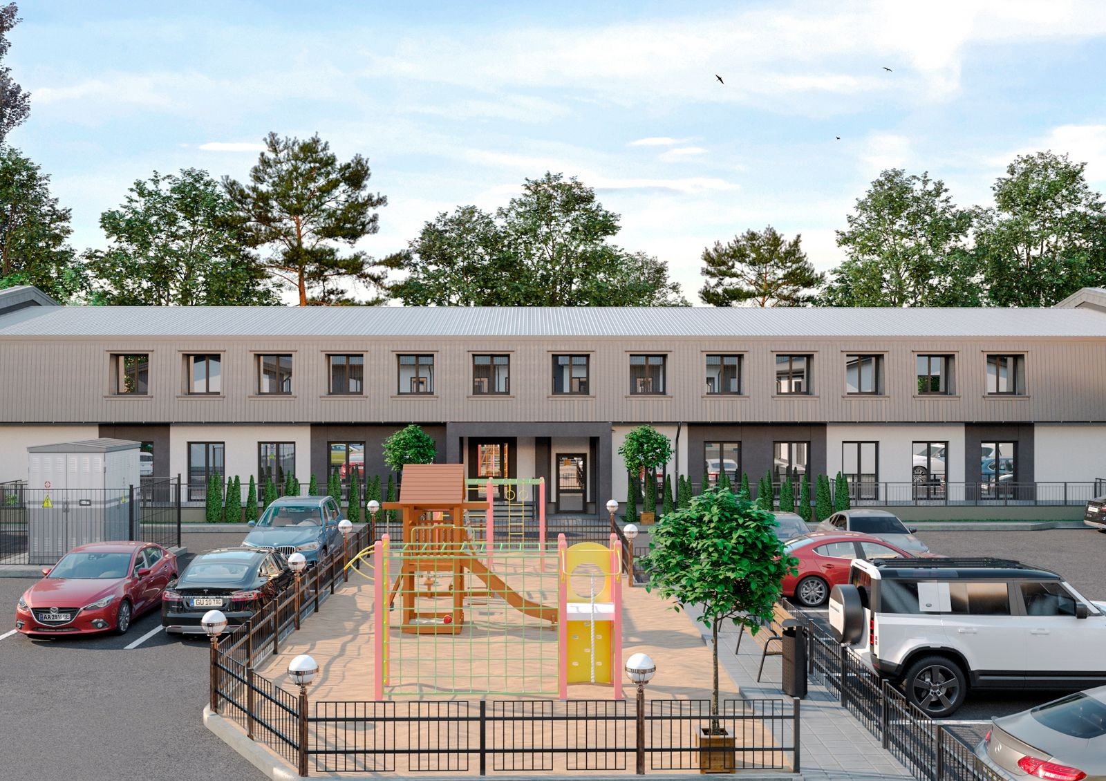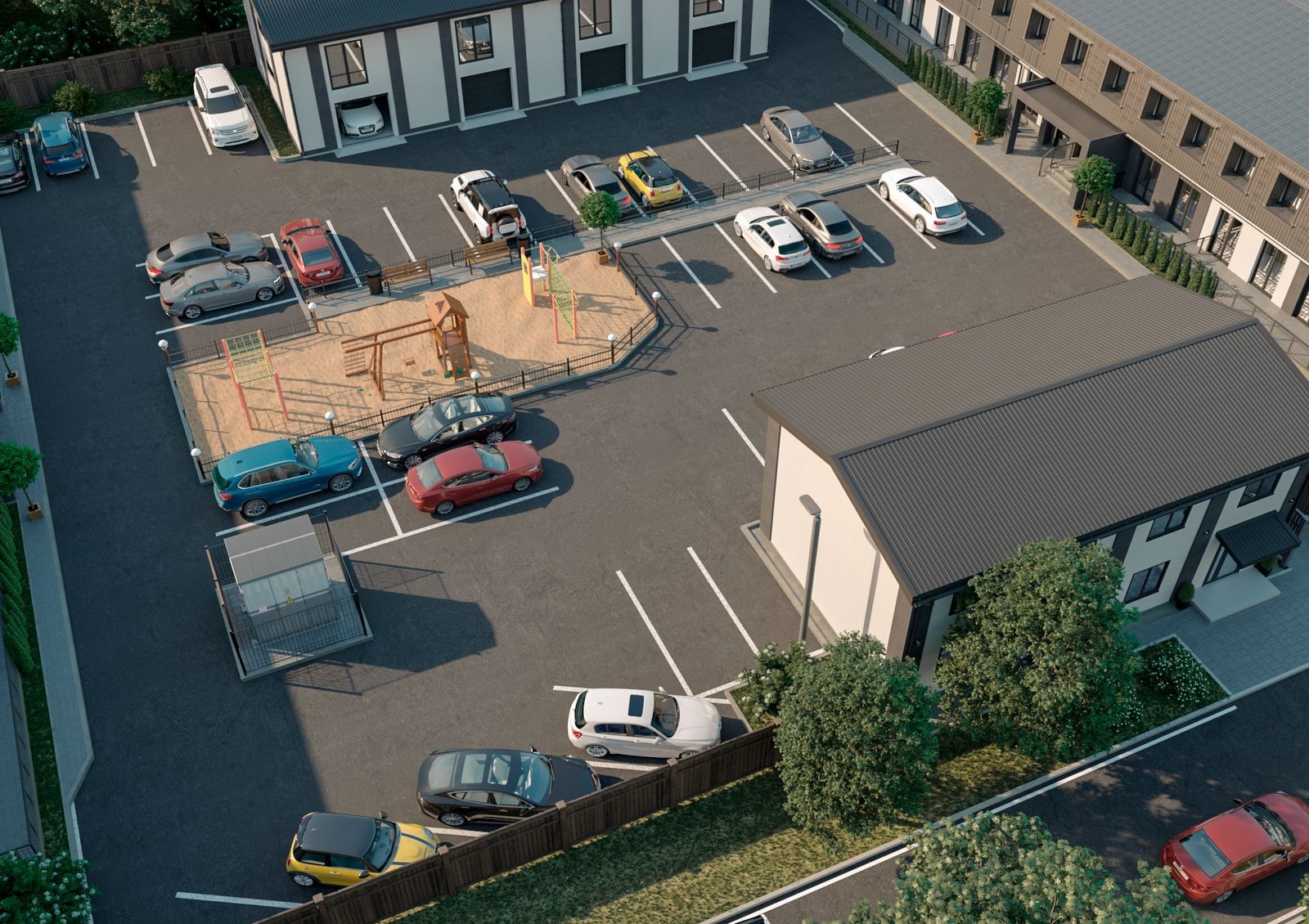 огражденная территория с оборудованным шлагбаумом въездом и концепцией «без авто и посторонних»