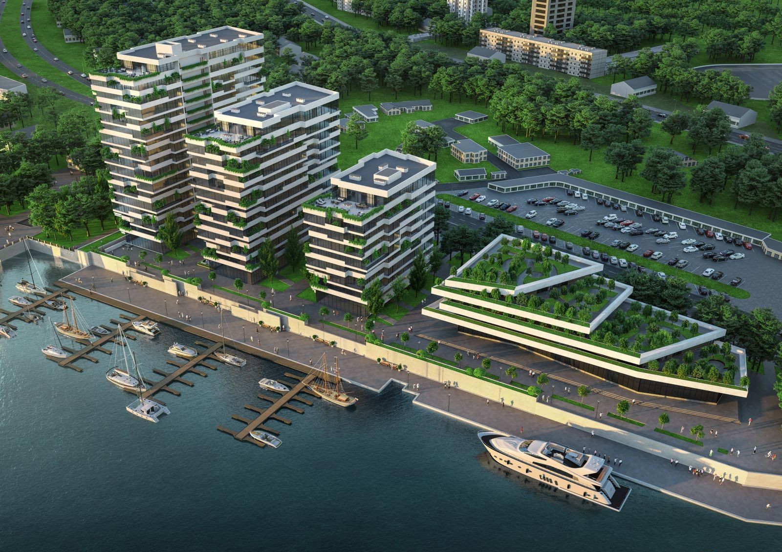 Также возле комплекса можно будет пришвартовать яхту, перекусить в ресторане или кафе, отвести ребенка в детский центр или отдохнуть на воде в водном центре развлечений.