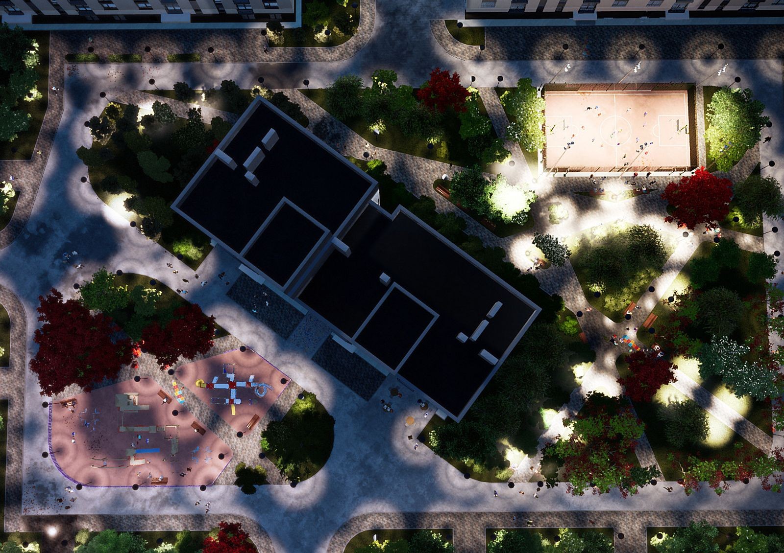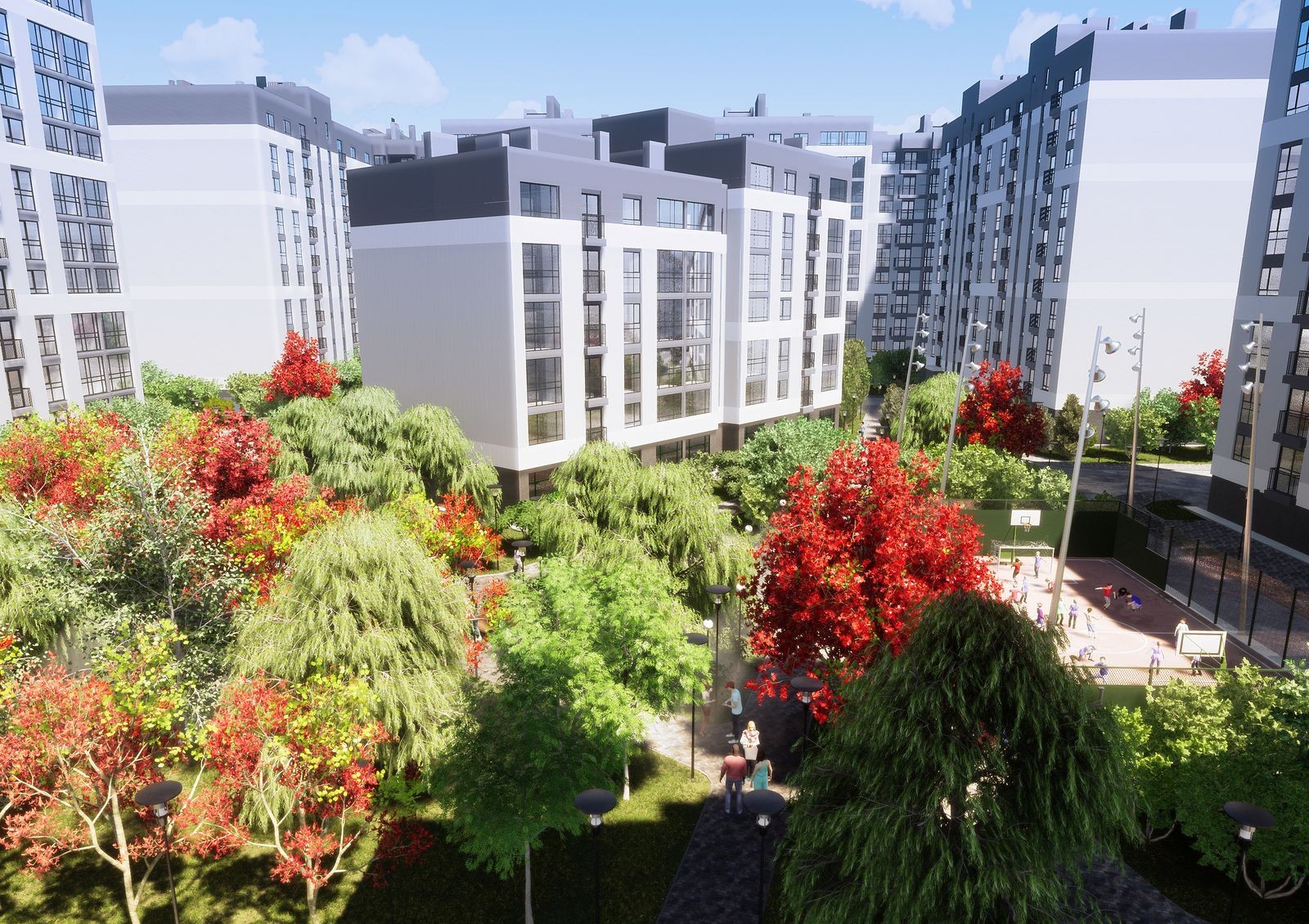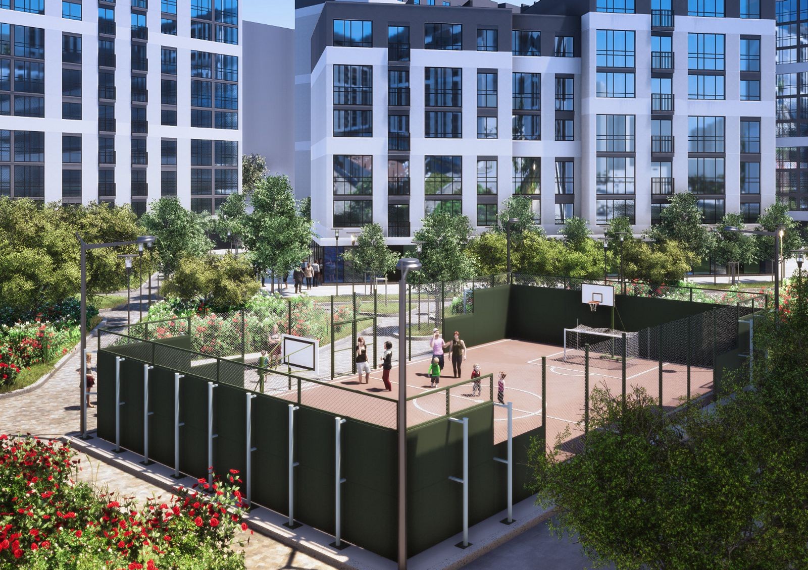 Для любителей спорта на территории комплекса обустроят спортивные площадки, а в 4 минутах ходьбы от него расположен спортивный зал «Идеал Спорт» с тренажерным и фитнес-залами, групповыми занятиями аэробикой, сауной и оздоровительно-лечебными программами. Рядом с комплексом — ледовая арена и аквапарк «Цунами». Для утренних пробежек, пеших прогулок и велопоездок в 12 минутах ходьбы от новостройки городской парк им. Шевченко. На таком же расстоянии от комплекса — городское озеро с баскетбольной площадкой и открытым бассейном.