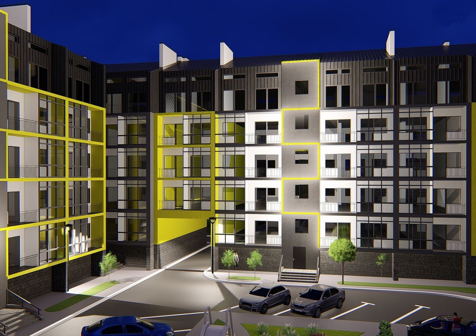Экстерьер дома привлекает своей оригинальностью и красочностью. В фасадной отделке сделали акцент на полосах ярко-желтого цвета, которые визуально разделяют дом на этажи и блоки. Поскольку комплекс расположен на открытом пространстве, из окон квартир открывается живописная картина на город и поля.