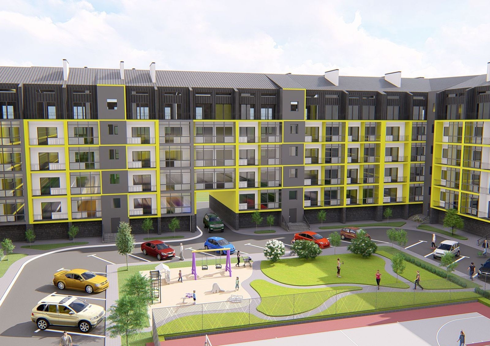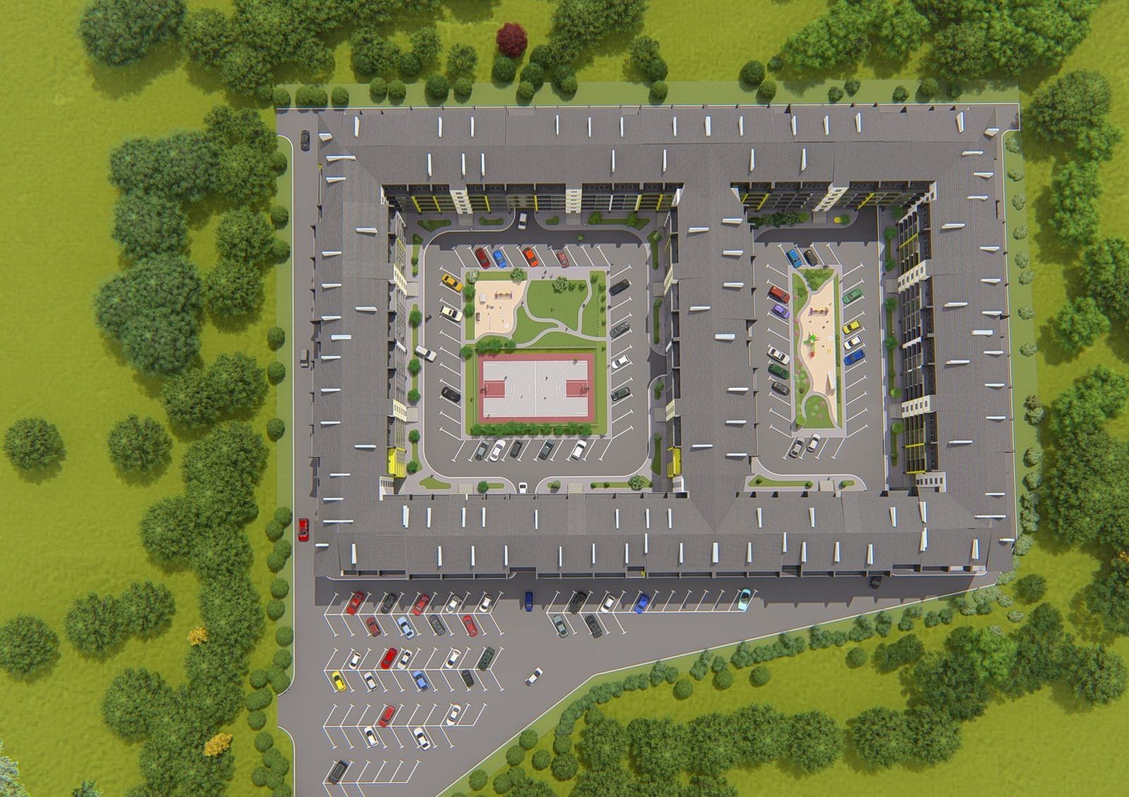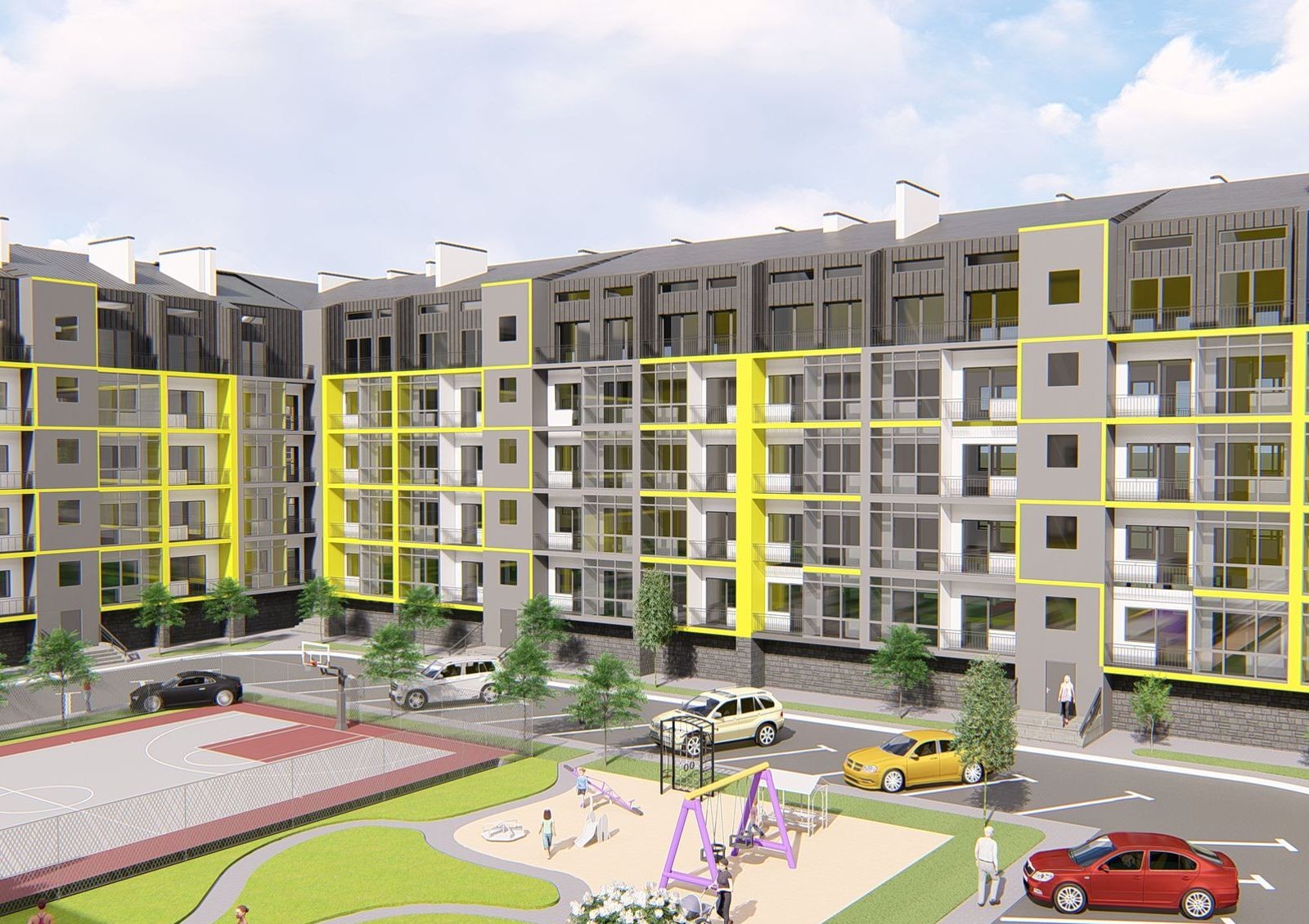ЖК «Дружный Двор» — это масштабная застройка в селе Солонка Львовской области, которая состоит из восемнадцати 5-этажных секций. Они расположены по периметру территории и создают два закрытых внутренних двора: в одном разместят баскетбольное поле, игровую площадку для малышей и зону для занятий спортом, а во втором — игровой комплекс для детей постарше.