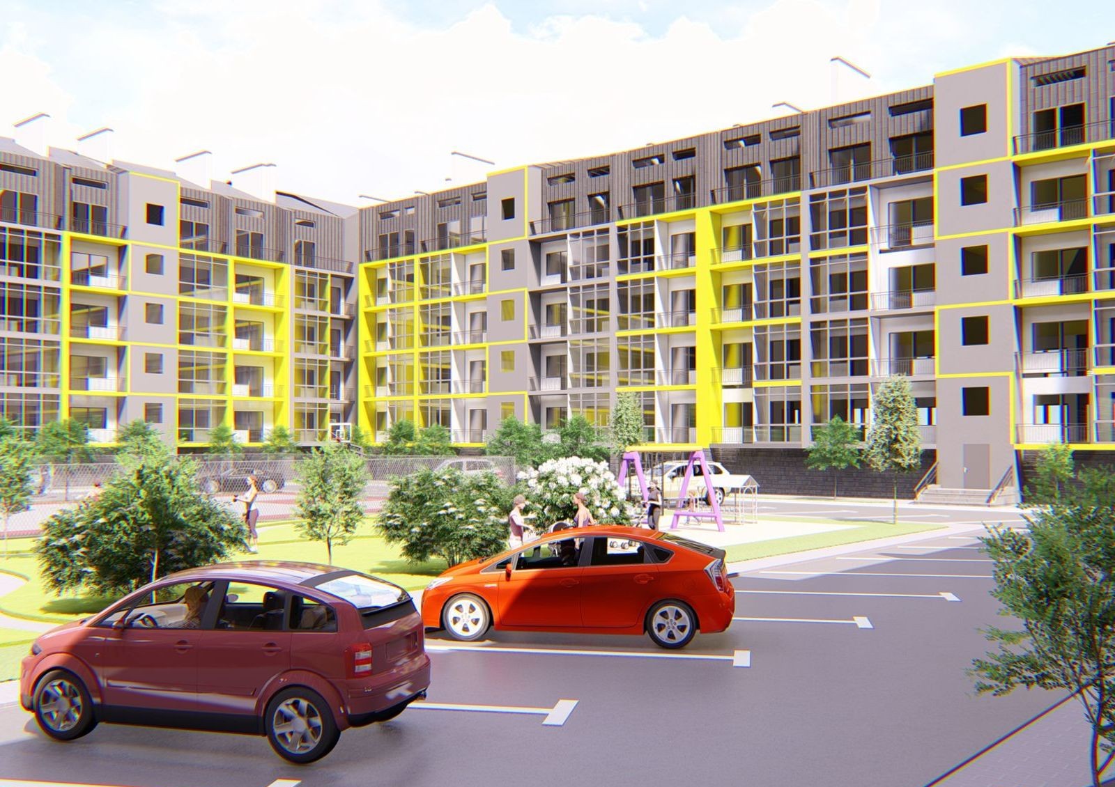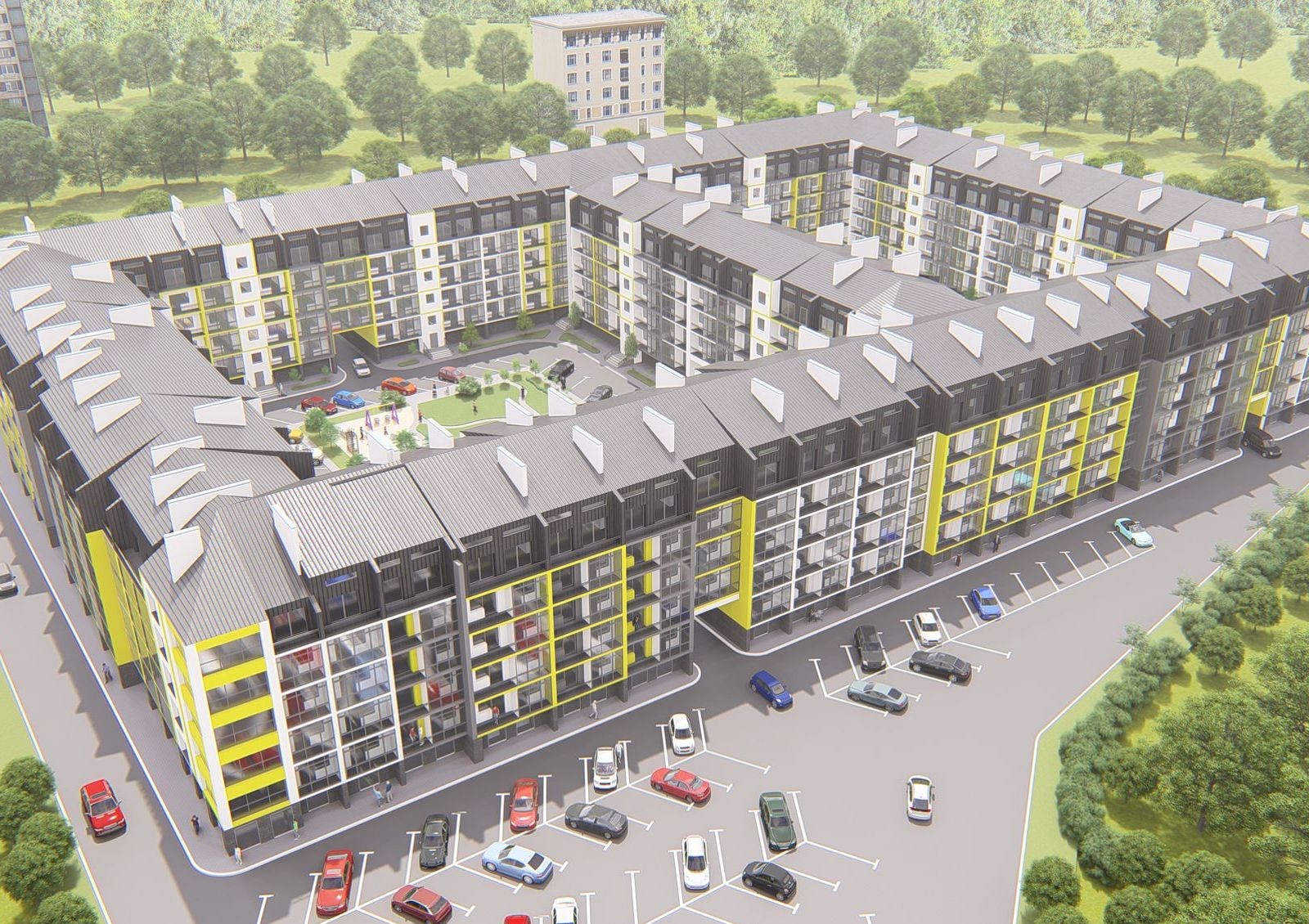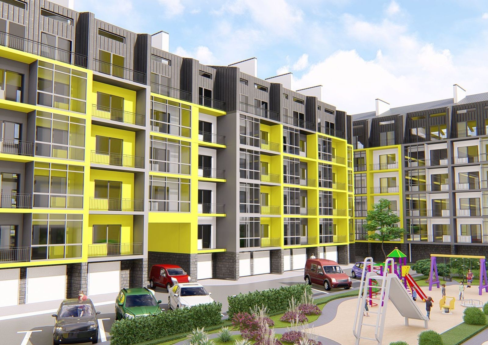 ЖК «Дружный Двор» — это масштабная застройка в селе Солонка Львовской области, которая состоит из восемнадцати 5-этажных секций. Они расположены по периметру территории и создают два закрытых внутренних двора: в одном разместят баскетбольное поле, игровую площадку для малышей и зону для занятий спортом, а во втором — игровой комплекс для детей постарше.