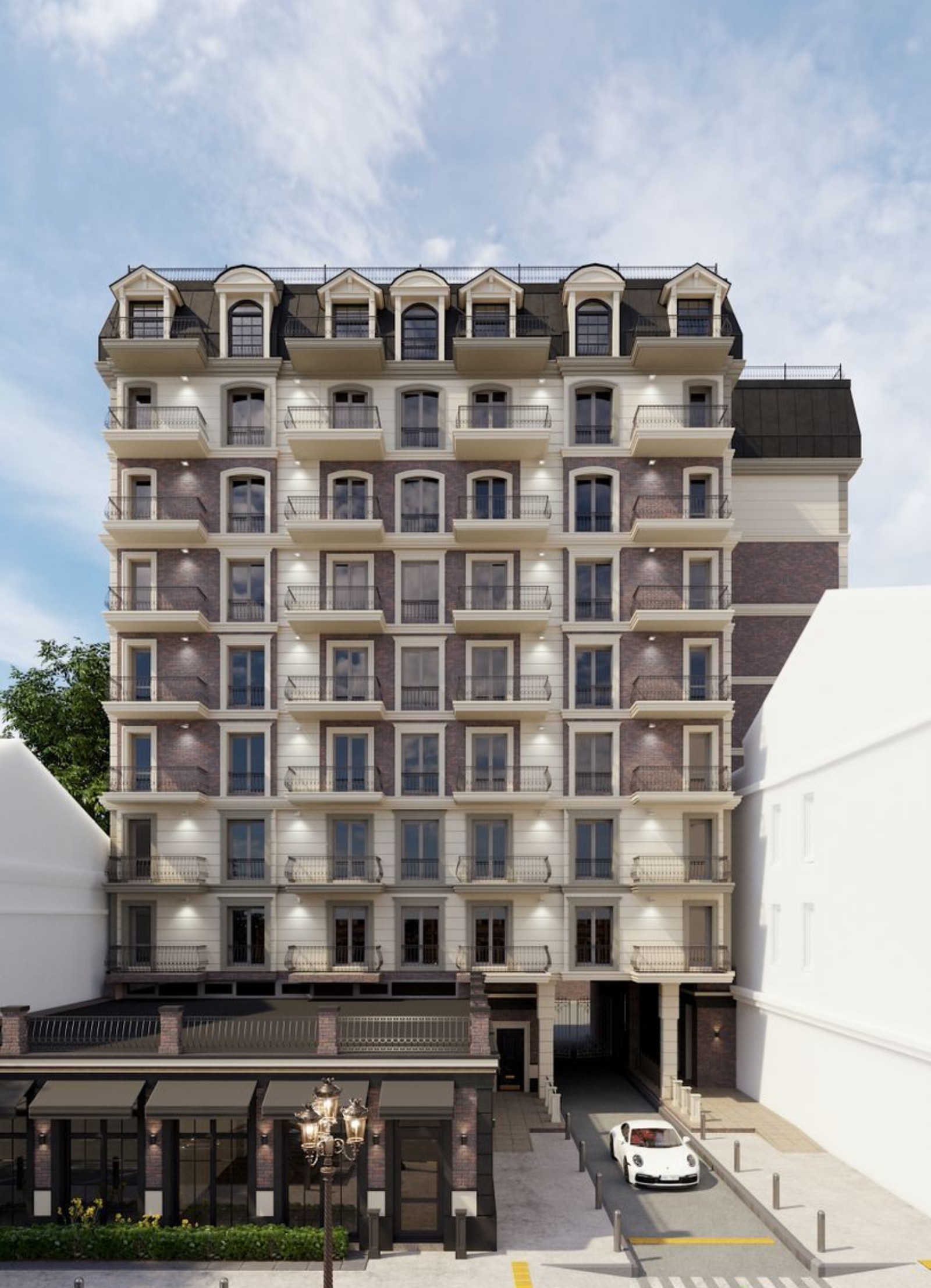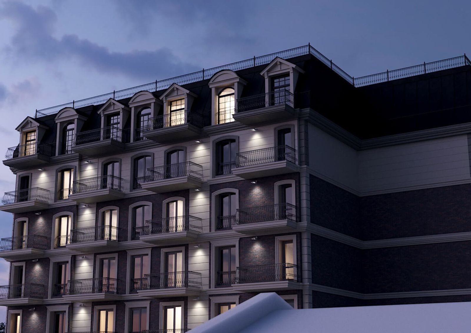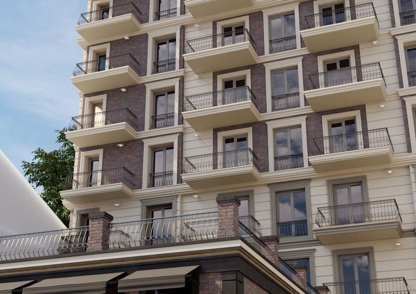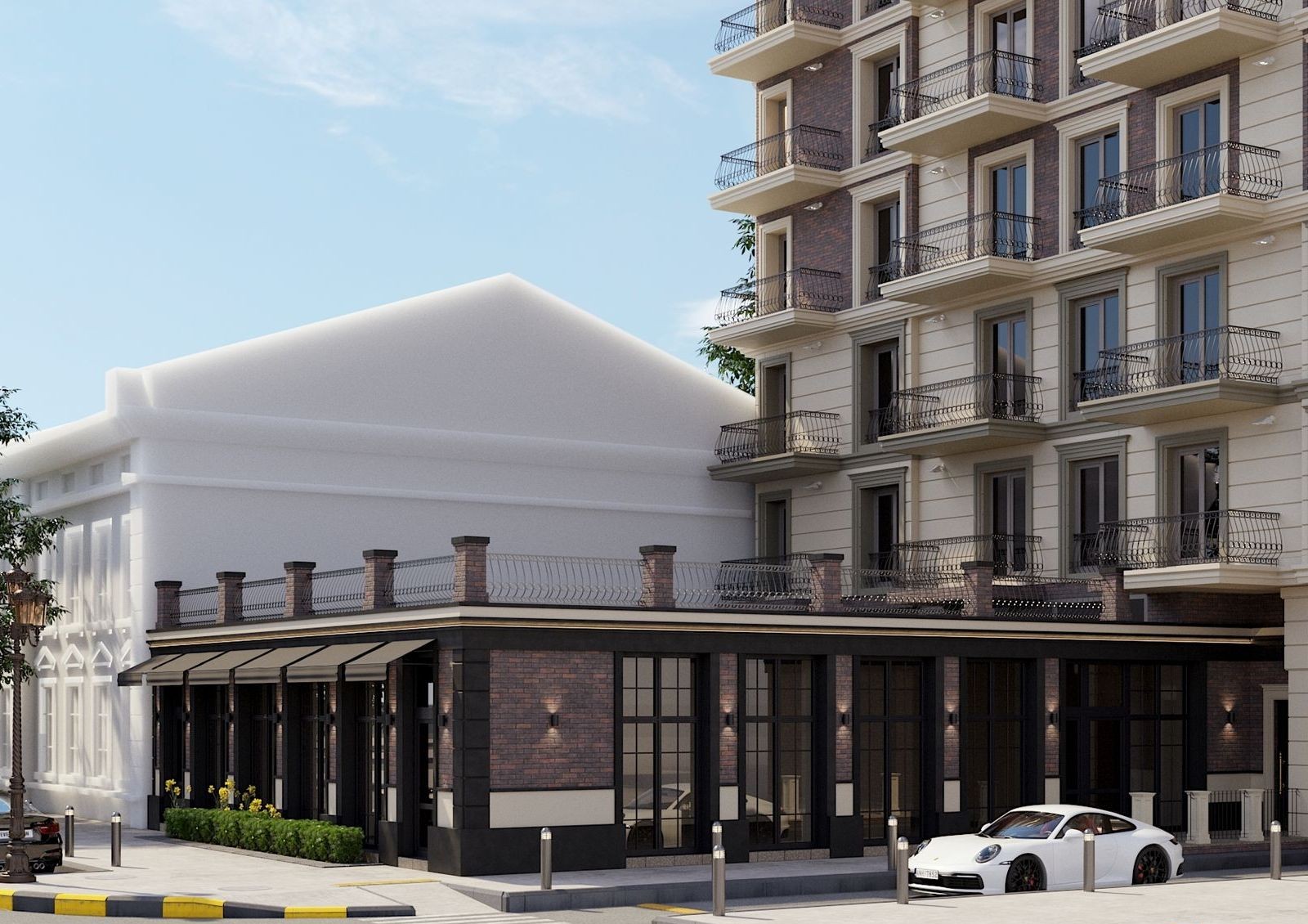Окружающая архитектура повлияла на выбор стиля для дома — архитекторы проекта остановились на неоклассицизме. Фасады комплекса будут украшены пилястрами, арками над окнами, карнизами и рустами. Балконы открытого типа с коваными французскими решетчатыми ограждениями также станут украшением фасадов.