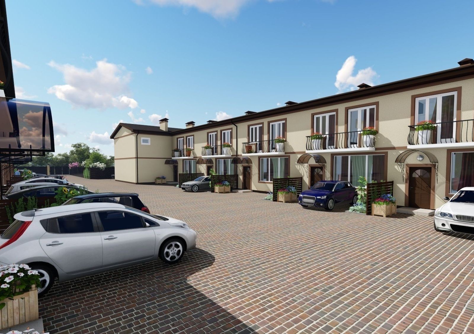 Каждый таунхаус имеет два небольших дворика, одно или два места для парковки машины. Устанавливается двухконтурный газовый котел «Protherm» и радиаторы отопления, первый этаж и ванна второго обогреваются системой «Теплый пол». Устанавливаются лестницы, изготовленные из карпатского бука.