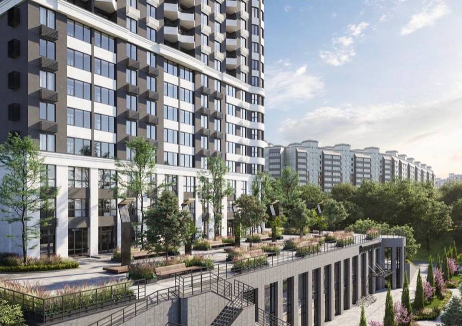 Два нижних этажа новостройки отведены под коммерческую инфраструктуру. В частности, на втором этаже разместят ресторан, где жильцы смогут наслаждаться изысканными блюдами национальной и европейской кухни. Для детей у ресторана будет специальное меню и игровая комната. Проектом обустройства придомовой территории предусмотрены несколько современных детских площадок, места для занятий спортом и зеленые зоны отдыха.
