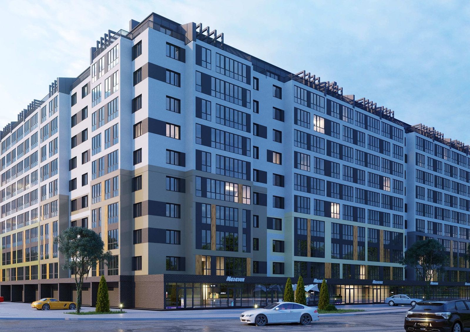 Будущим жильцам предлагают квартиры нескольких типов, включая двухуровневые апартаменты с открытыми террасами, а также благоустроенный внутренний двор и гаражные боксы. На нижних этажах комплекса предусмотрены просторный холл, консьерж сервис и коммерческие площади, на которых разместят магазины, кафе, салоны красоты и другие сервисы.