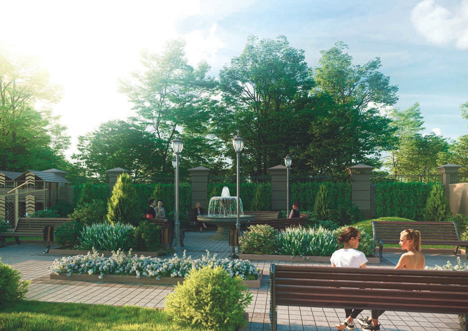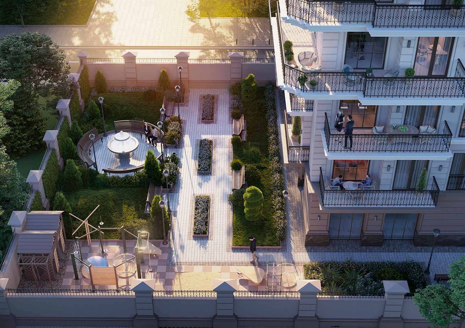 Еще комфортнее проживание на Французском бульваре, 29б сделает патио с зелеными насаждениями, цветущими клумбами и фонтаном.