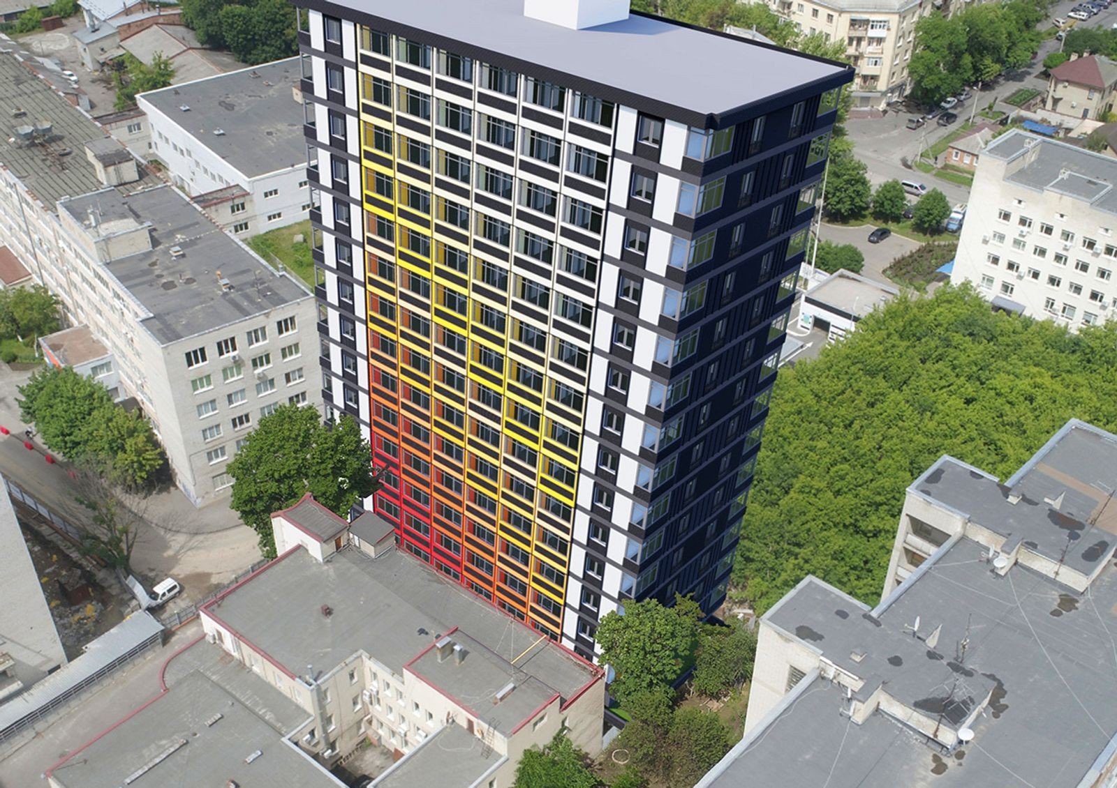 Отдельно стоит отметить оригинальное оформление фасадов новостройки, которая станет одним из самых ярких зданий микрорайона: черные торцы здания контрастируют с яркой красно-желтой палитрой центральных частей, лоджии декорированы черными рельефными панелями.